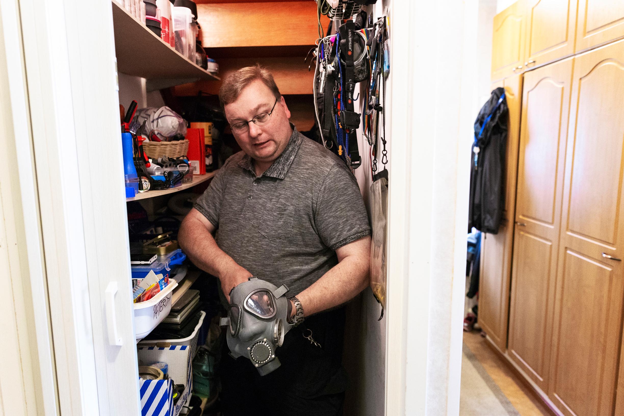 Karostojen kotivaraan kuuluu myös kaasunaamareita. Sellaista Karosto ei kuitenkaan halua laittaa kasvoilleen valokuvaa varten.