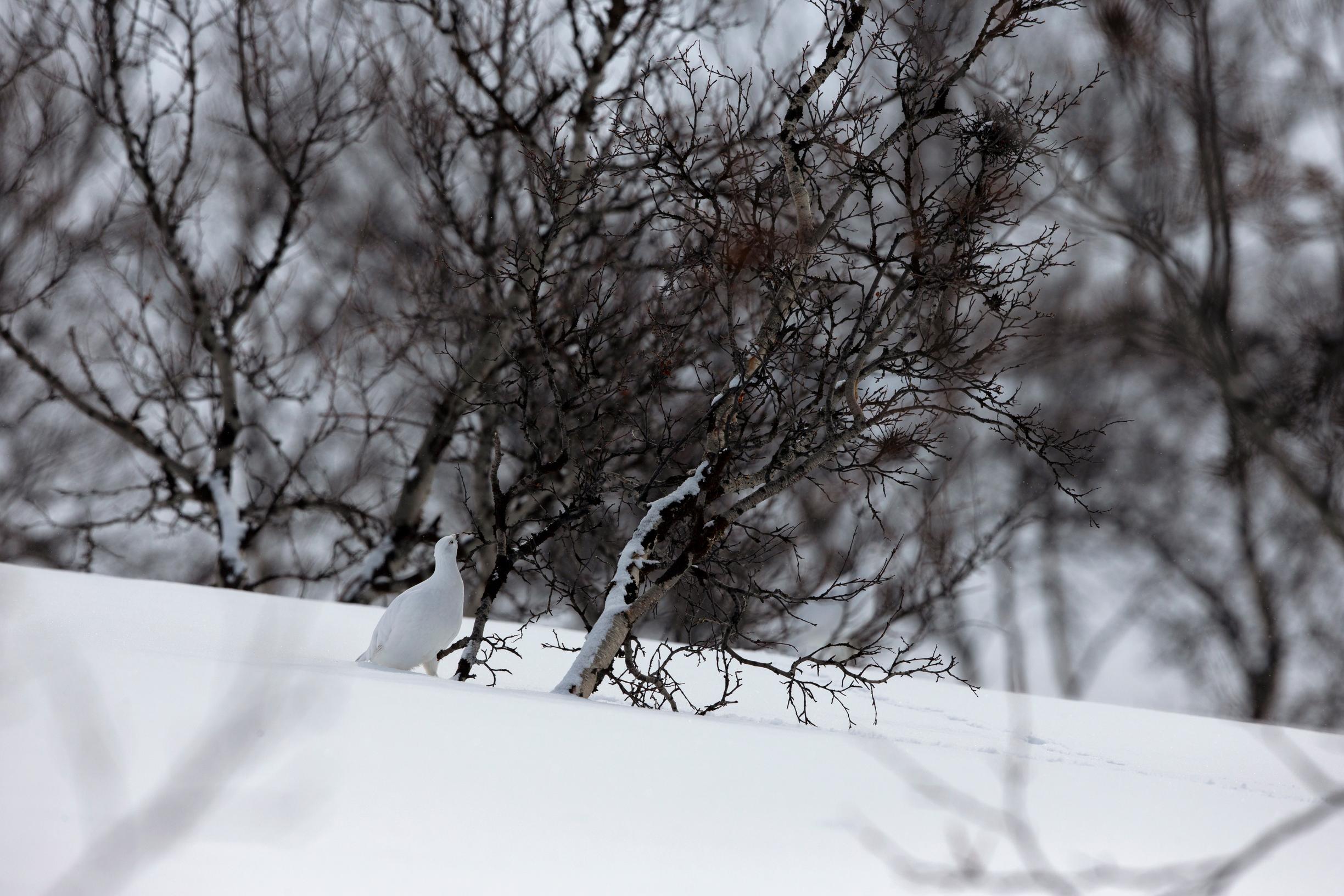 Hetkeä myöhemmin saamme esimerkin. Kenttäpäällikkö Ohenoja pysähtyy ja osoittaa sormellaan käyrästi kasvavan tunturikoivun suuntaan. Siellä, puun verkkomaisesti laskeutuvien oksien alla kököttää paikalleen jähmettyneinä kaksi vitivalkoista lintua. Ne luottavat suojaväriinsä.