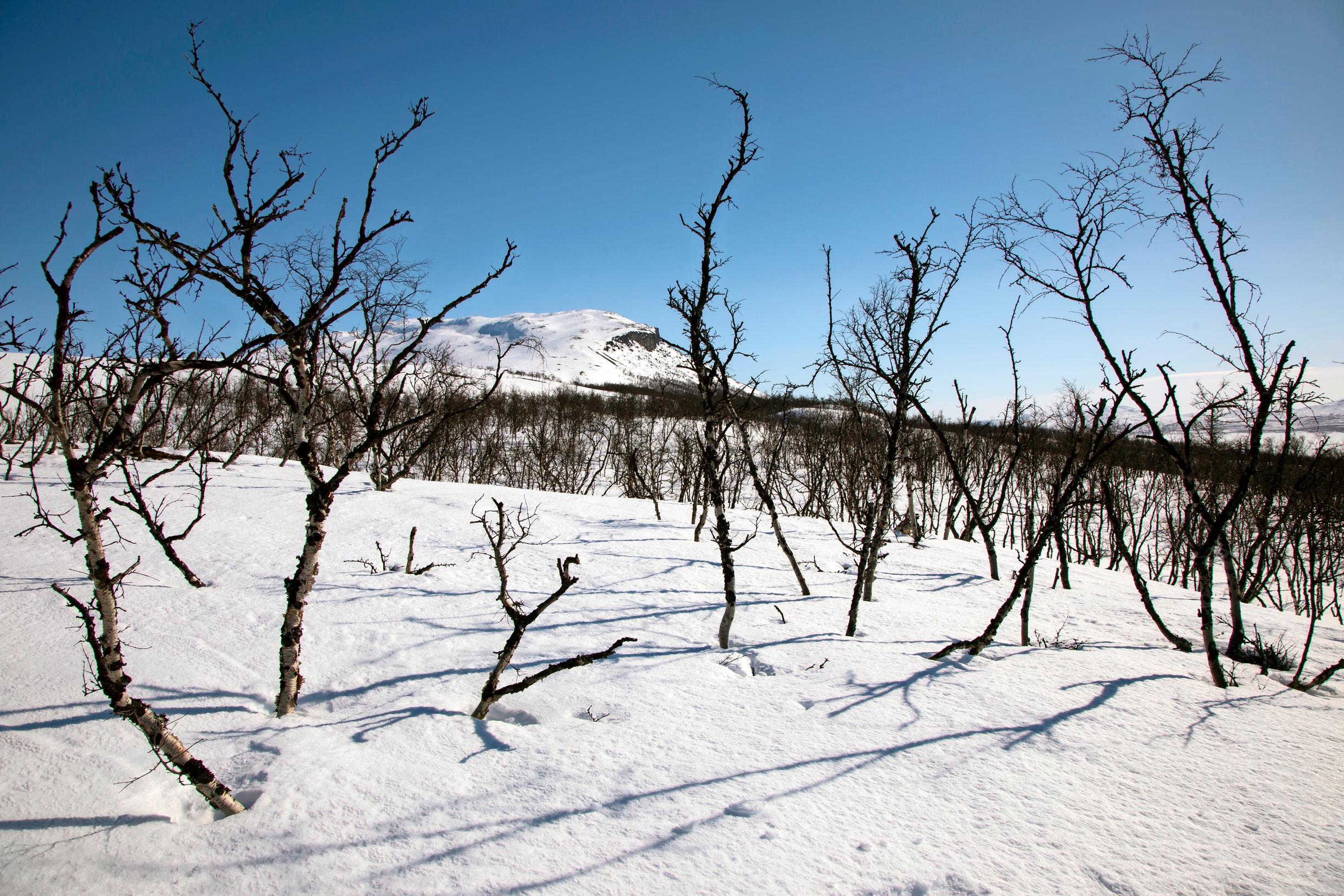 Hän opastaa meidät tunturikoivikon ylämaille. Hetkeä myöhemmin meitä ympäröinyt tiheä tunturikoivikko alkaa muuttua ilmavammaksi, kunnes lopulta kaikkialla on vain tikkumaisia runkoja ja pahasti kärsineen näköisiä oksia. Aivan kuin metsä olisi palanut.