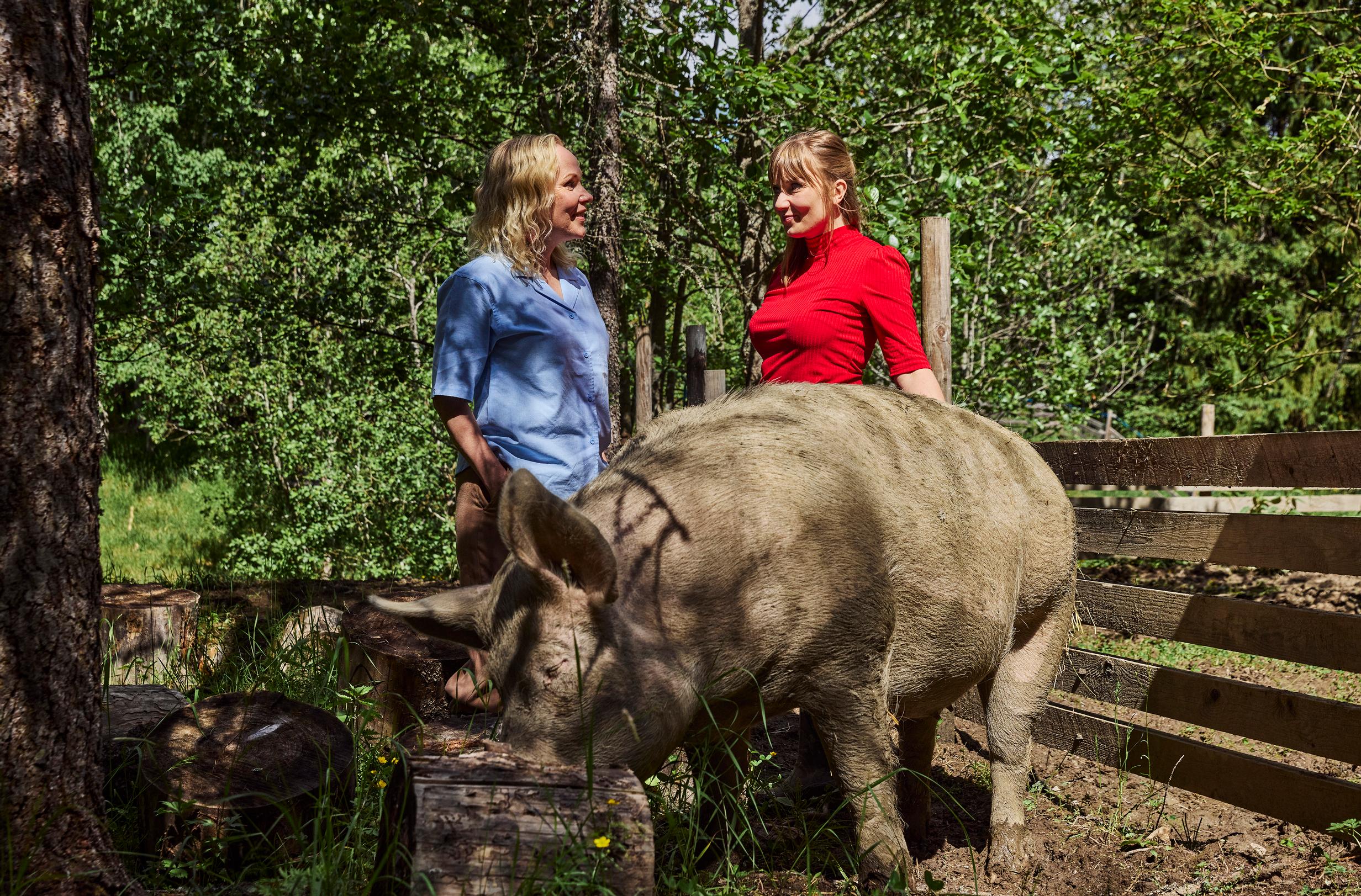 Kun kahvit on viimein juotu, lähdetään tervehtimään sikoja ja lampaita. Lyyti ja Lempi tulevat innoissaan röhkien Aaltolan ja Gustafssonin luokse. Ystävykset puhuvat sioille lempeästi ja rapsuttavat niitä.