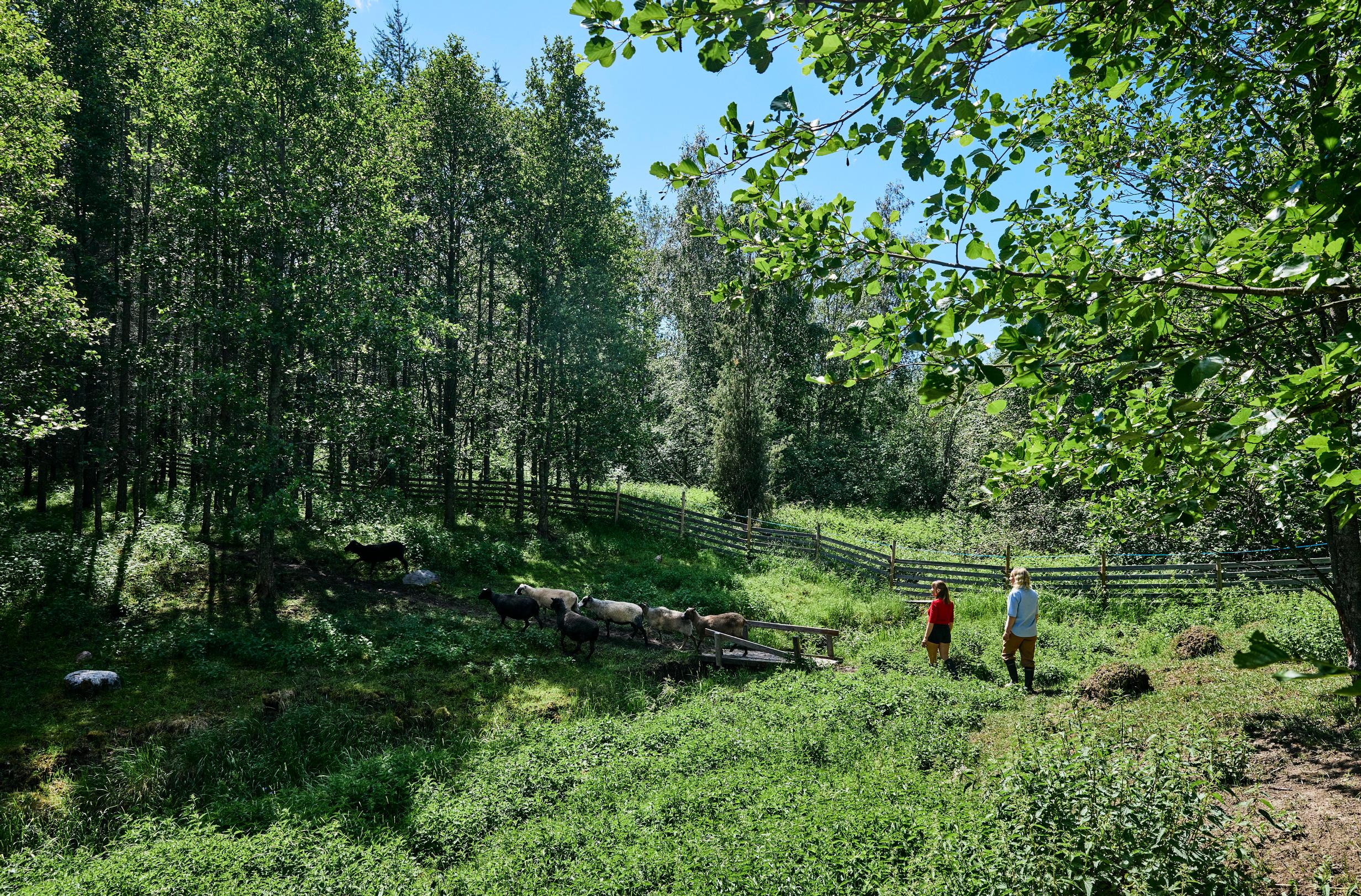 Aaltola ja Gustafsson seuraavat sikoja metsikössä, kun ne tonkivat innokkaina maata. Saappaat uppoavat kuraiseen maahan, ja heinikko yltää polviin asti. Metsässä virtaa puro, jonka ylitse pääsee pientä puista siltaa pitkin.