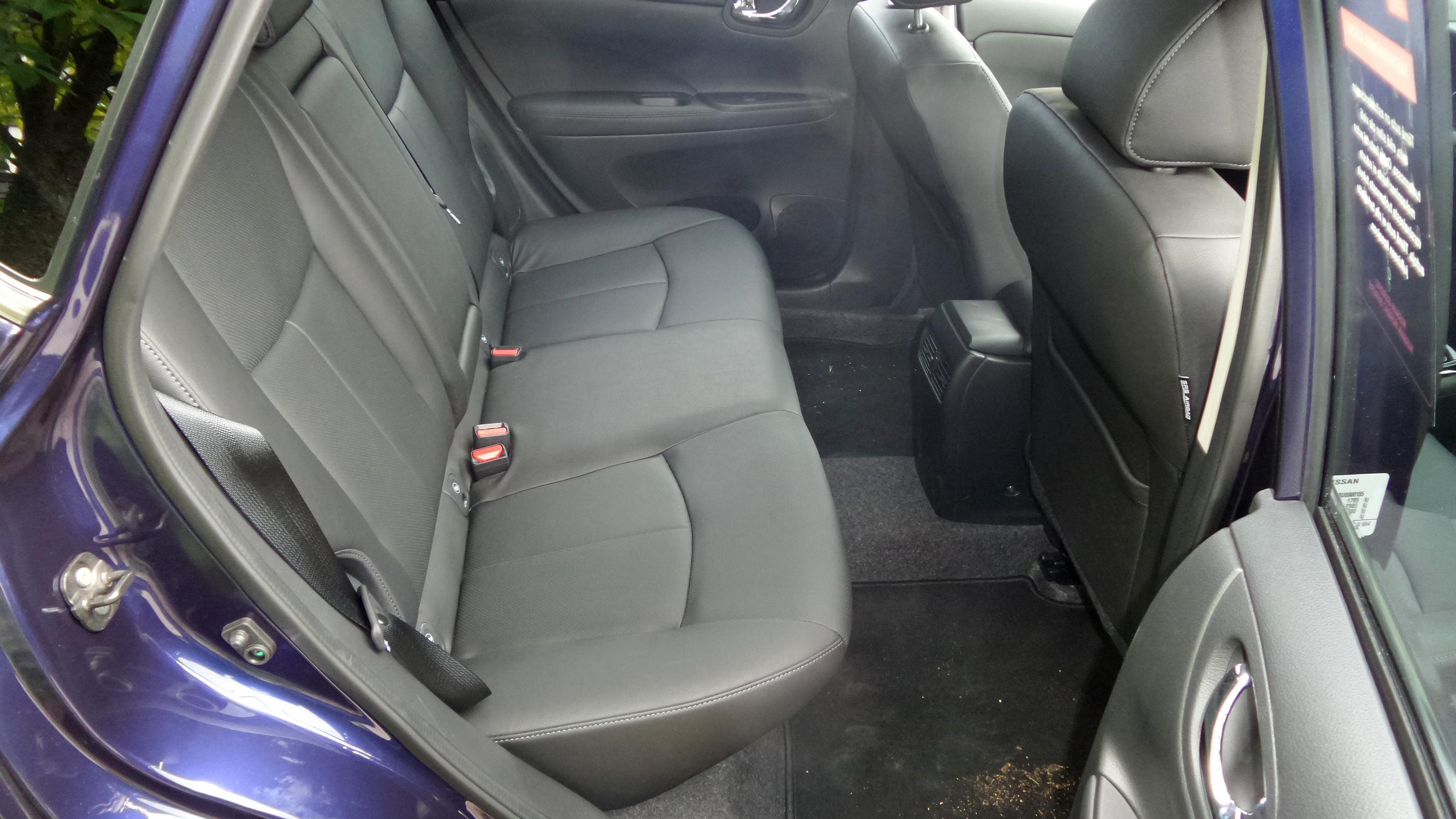 Takapenkillä avautuu tämä auton juttu: polvitilaa on todella reilusti. Sitä on itse asiassa enemmän kuin vieressä seisovassa X-Trailissä. Jos perheessä on isompia lapsia, ja autossa istutaan pitkiä mökkimatkoja, tässä on tilojen puolesta yksi C-segmentin parhaita vaihtoehtoja.