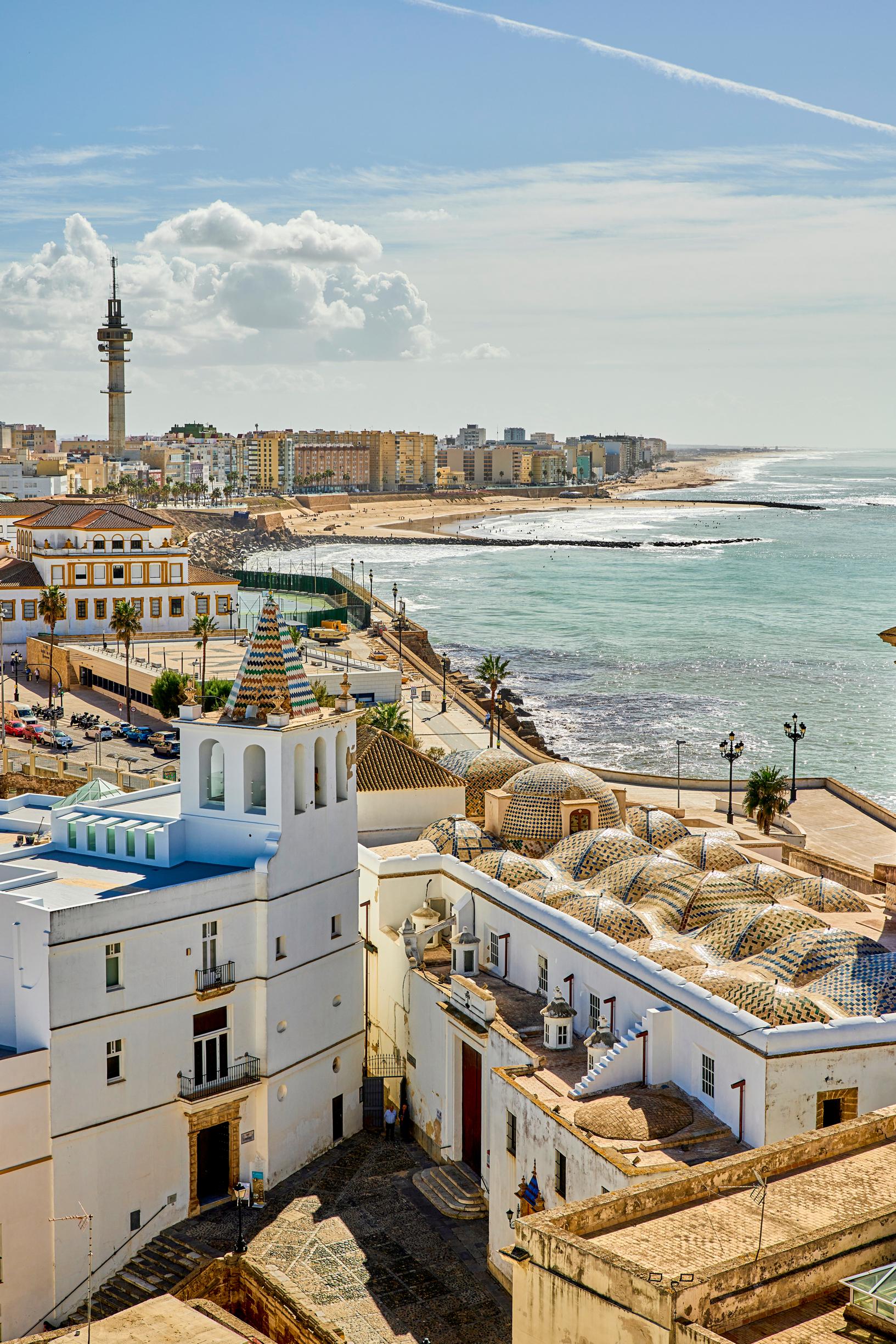 Oi, mikä näköala! Auringonsäteet kimaltavat meren sinellä. Upea poutapäivä saa Cádizin vanhankaupungin monet tornit ja komeiden talojen katot hohtamaan, kun niitä voi katsella yläilmasta.
