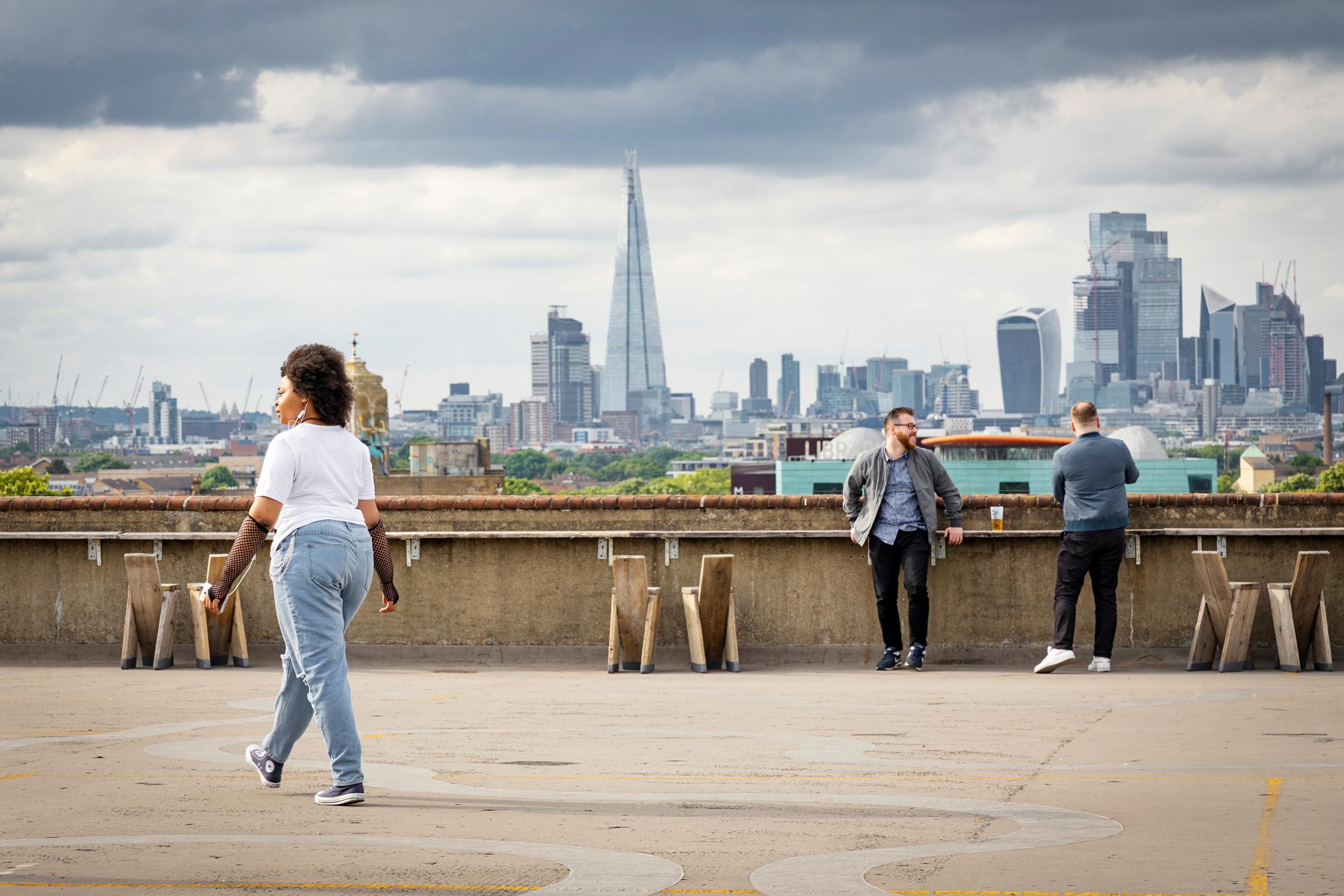 Ja mitkä näkymät! On pakko kulkea terassia ympäri yhä uudelleen ihailemassa maisemia. Tuossa kohoaa lähialueen Peckhamin vanhoja tiilitaloja. Horisontissa nousevat Lontoon ydinkeskustan tornit, The Shard ja muut.
