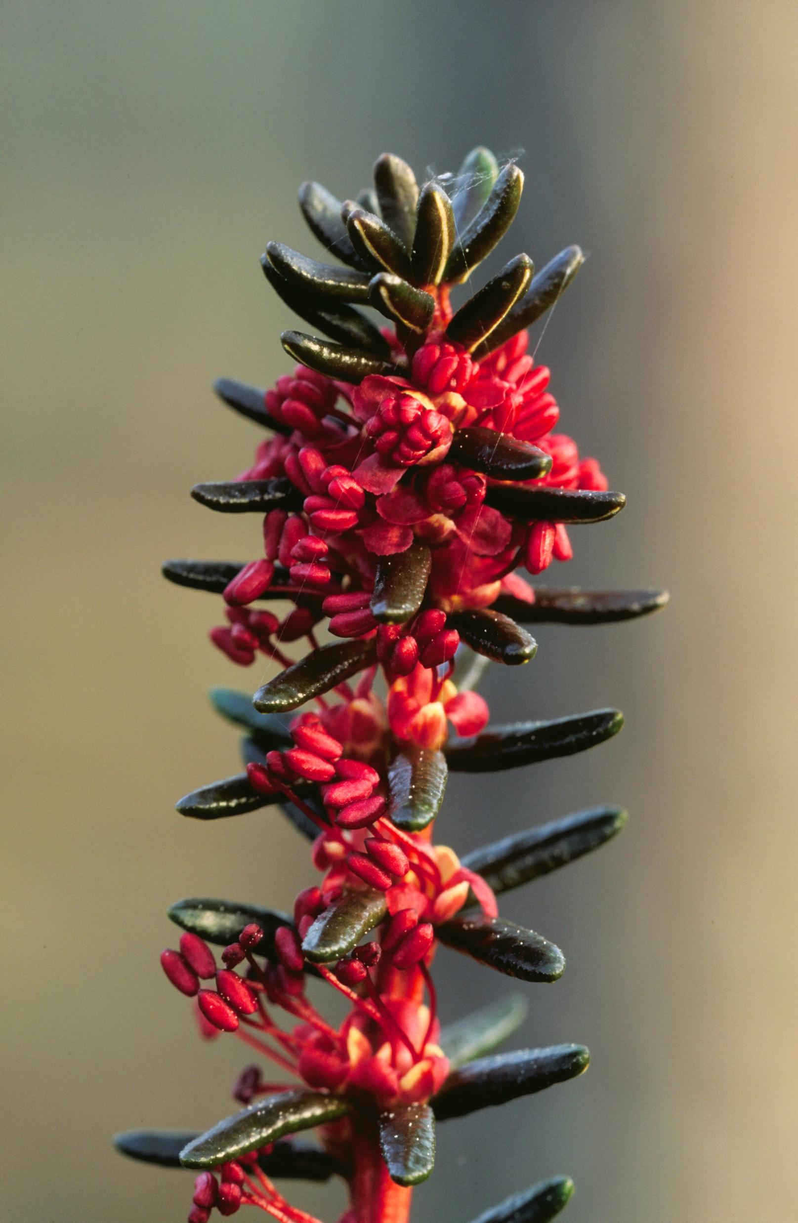 Jäkälien seurassa kasvaa tummanvihreä, pienilehtinen varpu, joka tulee toimeen hyvin kuivissa ja karuissa olosuhteissa. Sen neulasmaiset lehdet ovat vahapintaisia ja paksuja eivätkä kuivu helposti.