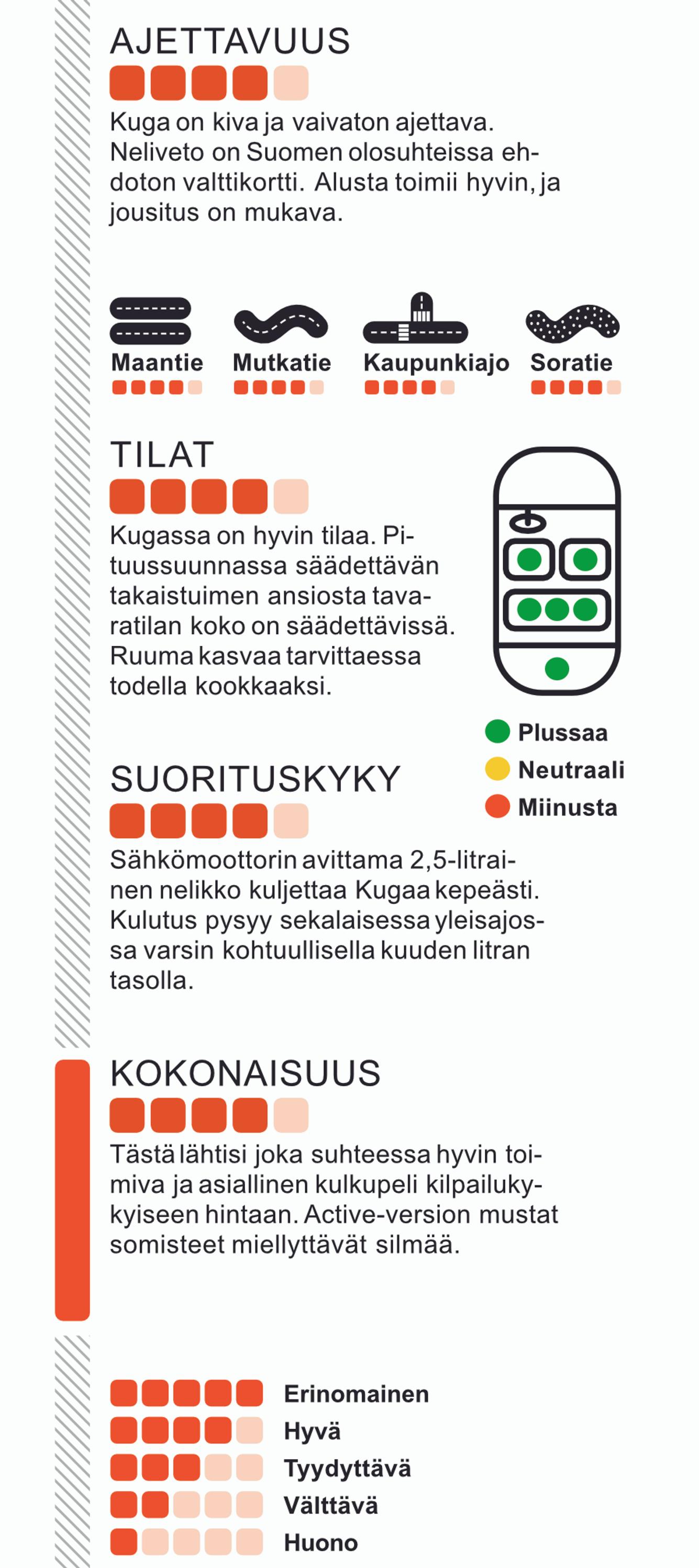 Jos ei aja koko ajan pedaali pohjassa, bensiinimoottorin kierrokset pysyvät maltillisella tasolla. Tämä miellyttää korvaa ja alentaa polttoaineen kulutusta. Sekalaisessa ajossa Kuga vie noin kuusi litraa bensiiniä sadalla kilometrillä. Tuo on 1,8 tonnia painavalle autolle oikein kohtuullinen lukema. Valmistajan mukaan Kuga loikkaa paikaltaan satasen vauhtiin 8,3 sekunnissa, eli kulkuhaluja löytyy tarvittaessa ihan sopivasti. Ajettavuudeltaan Kuga on perusvarma ja helppo. Se viihtyy niin taajamaissa kuin maantielläkin.