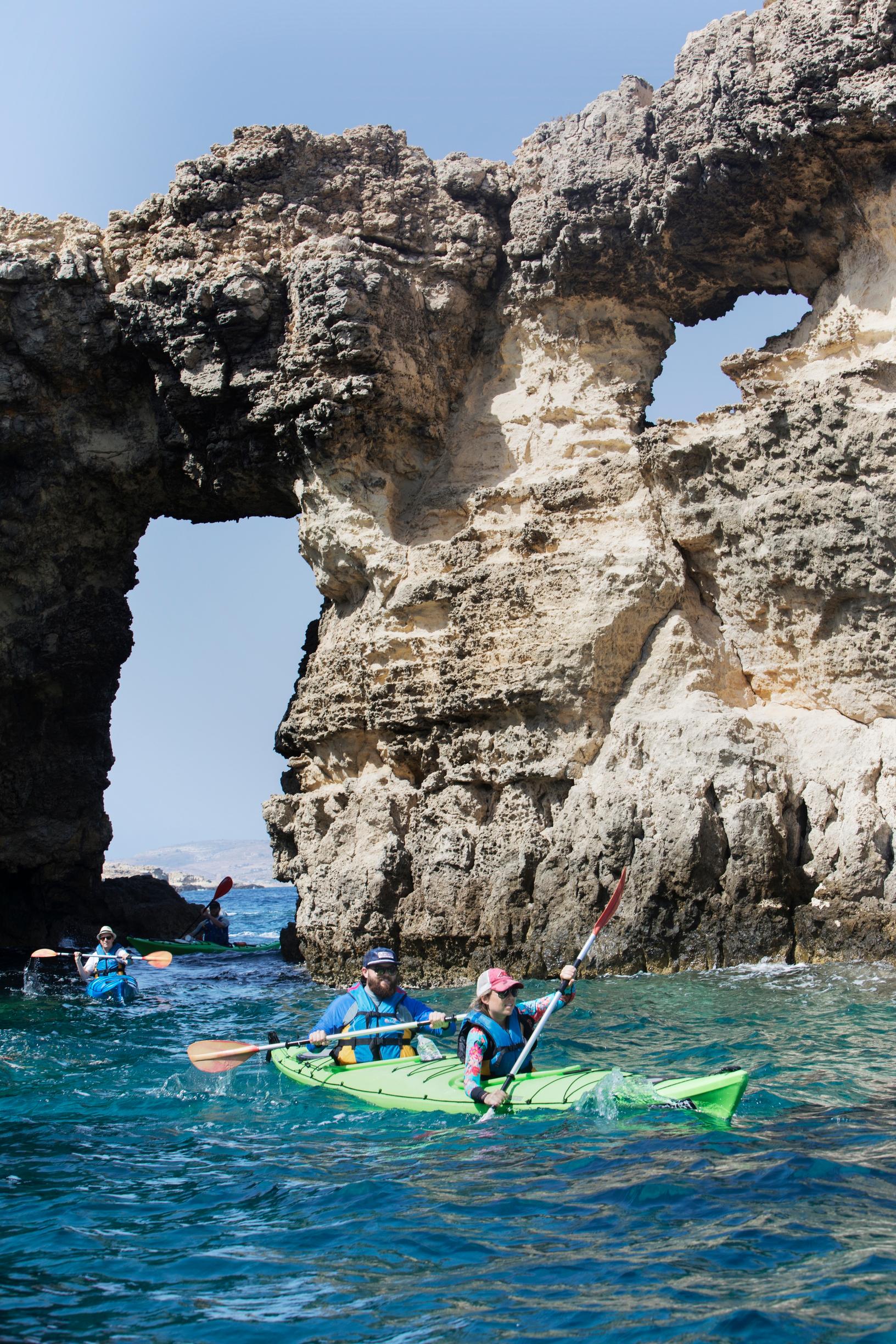Jatkamme saaren pohjoispuolelle ja melomme kapeiden solien sekä kallion muodostamien kaariholvien ali. Kajakki on kieltämättä oiva tapa tutustua Cominoon: millään muulla kulkuvälineellä ei pääse näin lähelle luonnonihmeitä.