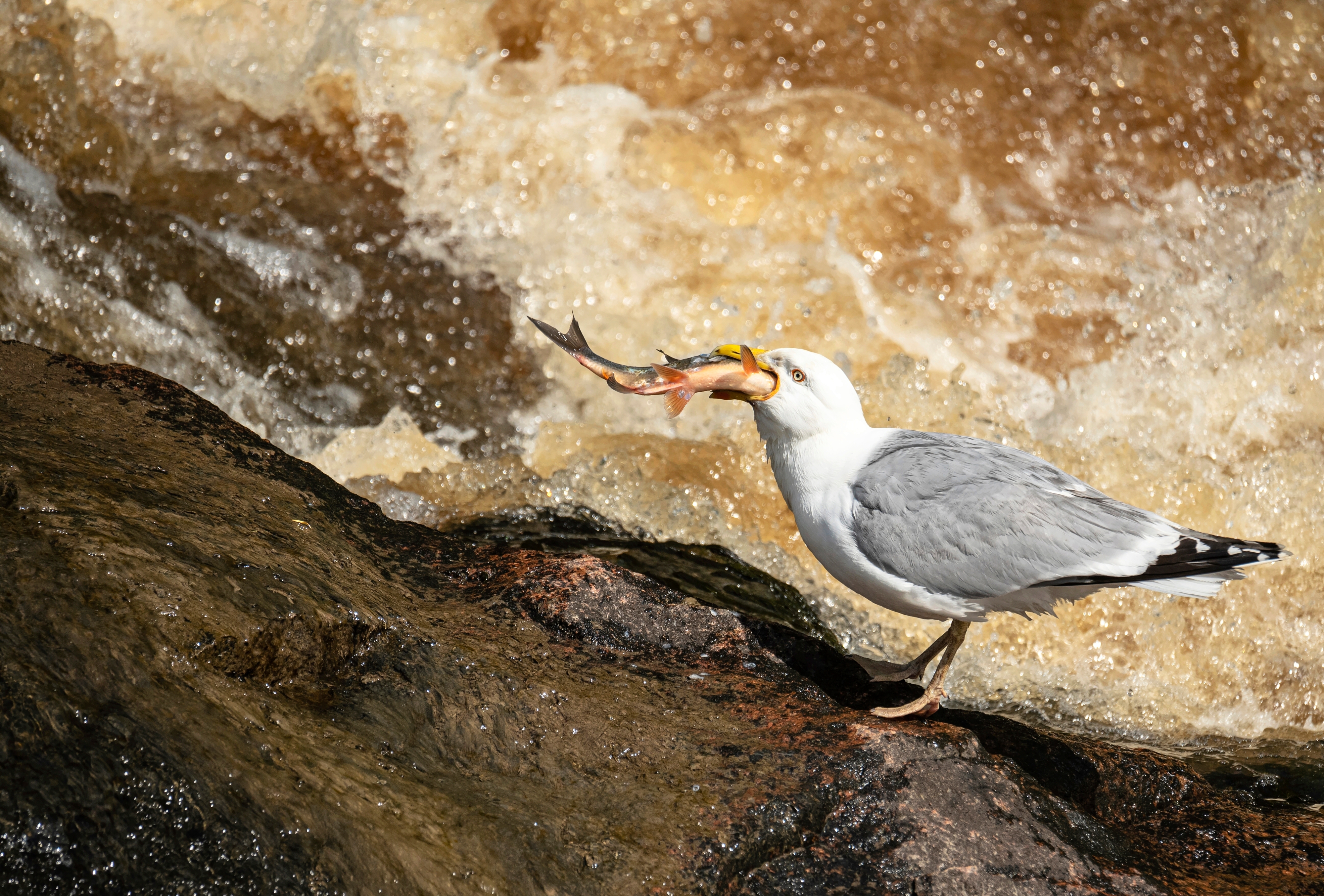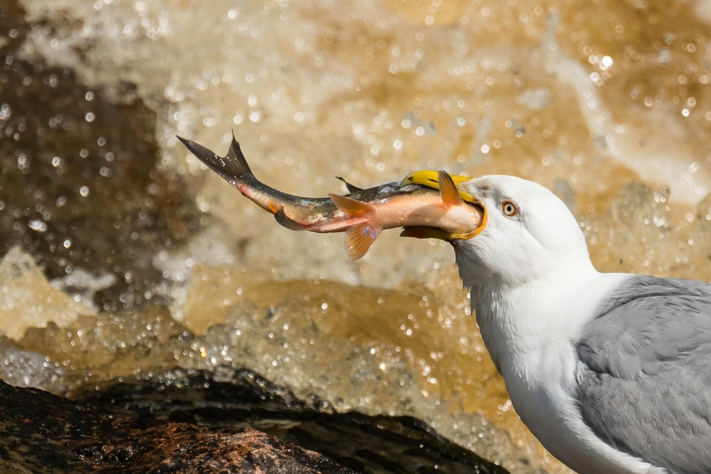 Samassa harmaalokki syöksyi pää edellä kuohuihin. Timo Kakko-Quednau valmistautui kuvaamaan kalastusta. Ensimmäiseltä sukellukselta suuri lokki palasi kuitenkin nokka tyhjänä. Harmaalokki vaihtoi paikkaa ja sukelsi kohta uudelleen.