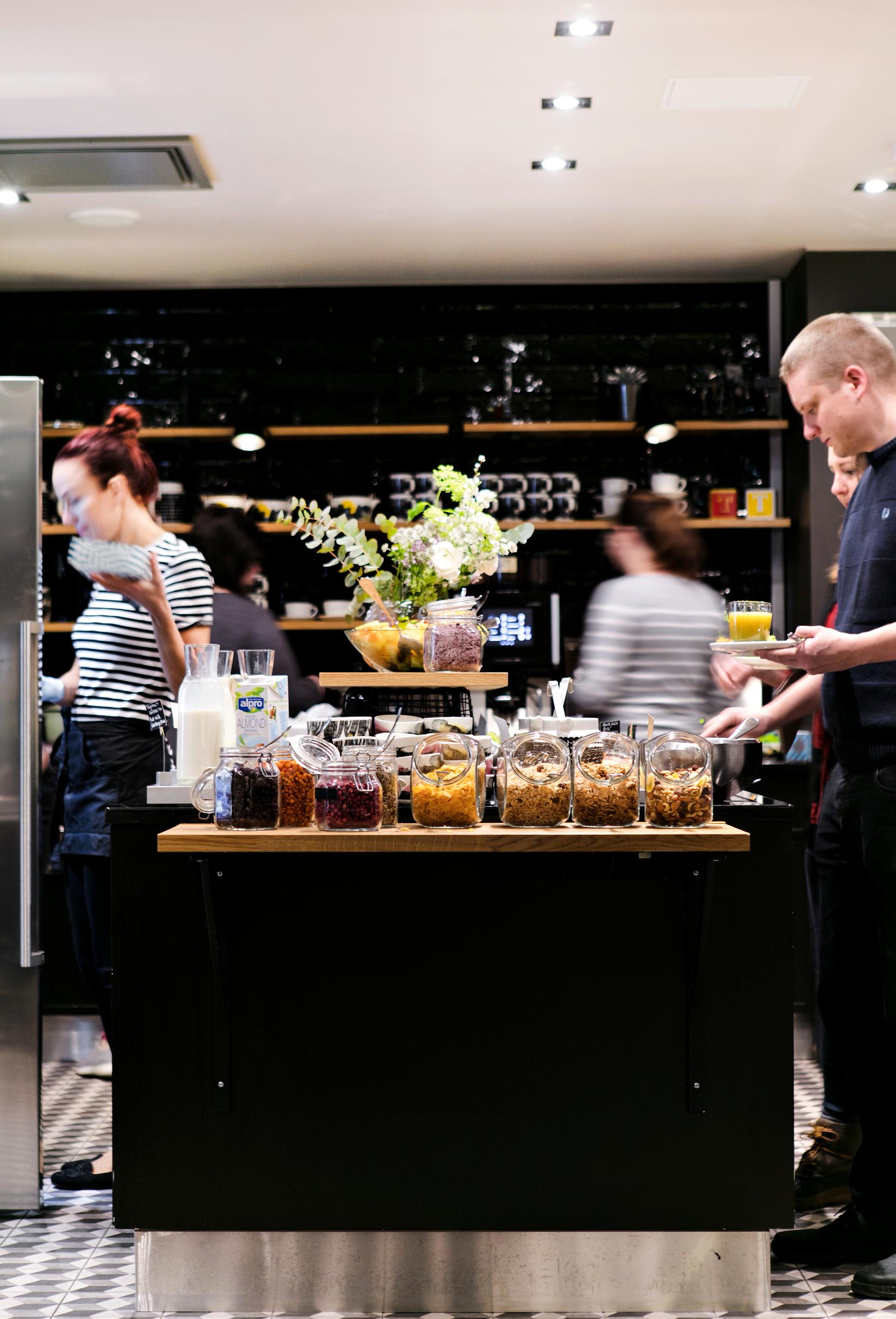 25 eurolla saa monipuolisen buffetaamiaisen. Luomuun ja gluteenittomiinkin on panostettu – ruisleipänä on Kanniston luomuleipä.