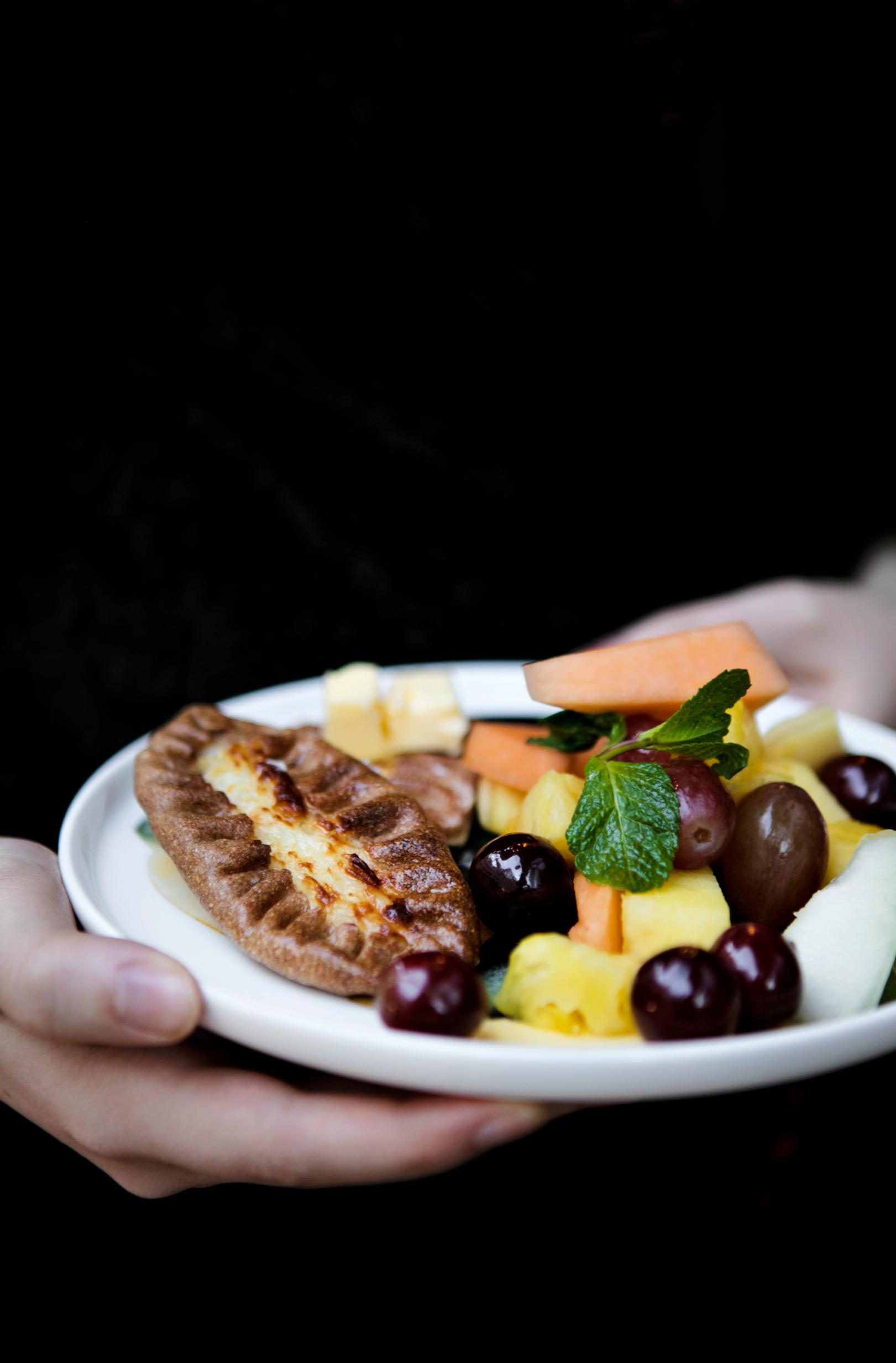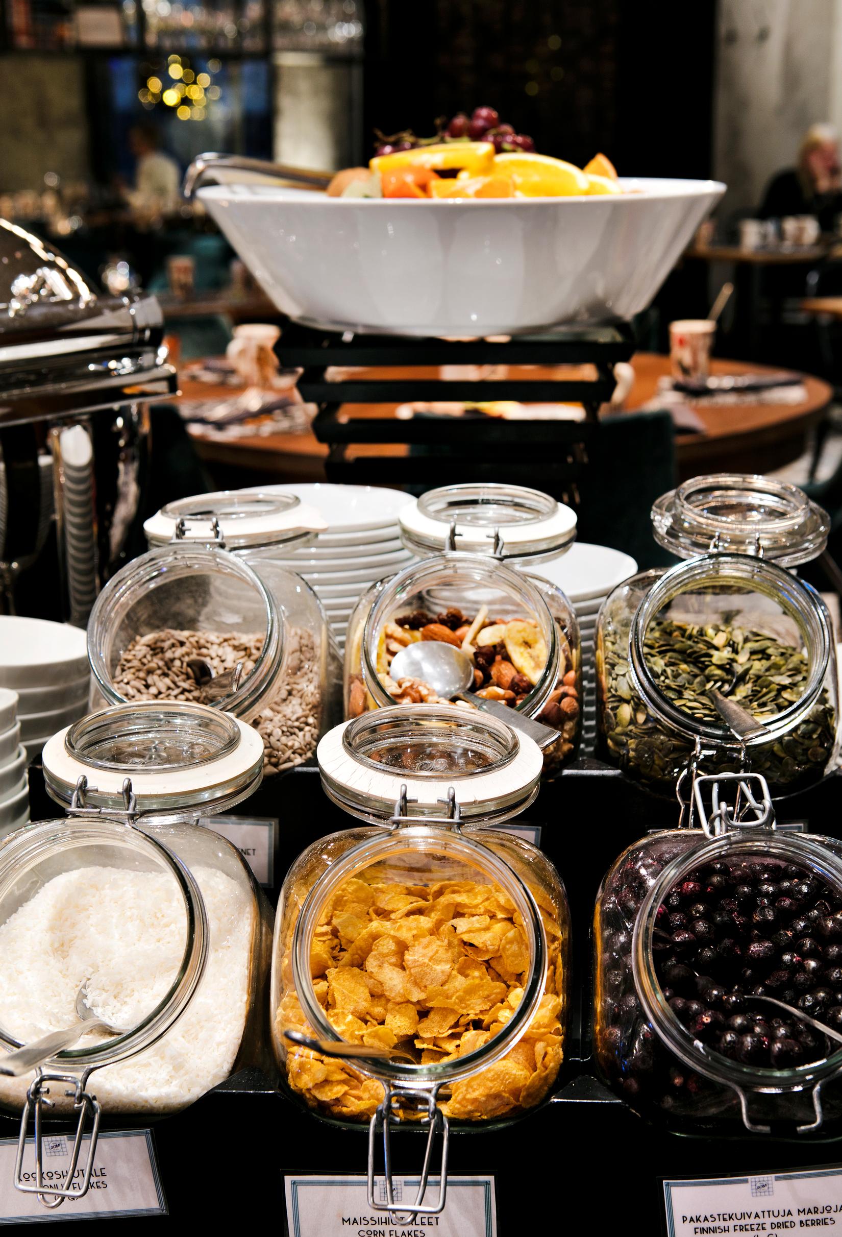 Ruuat haetaan buffetista, jota hotelli kuvailee kotityyliseksi. Täällä ei ole pekonia, munakokkelia tai muita lämpimiä ruokia.