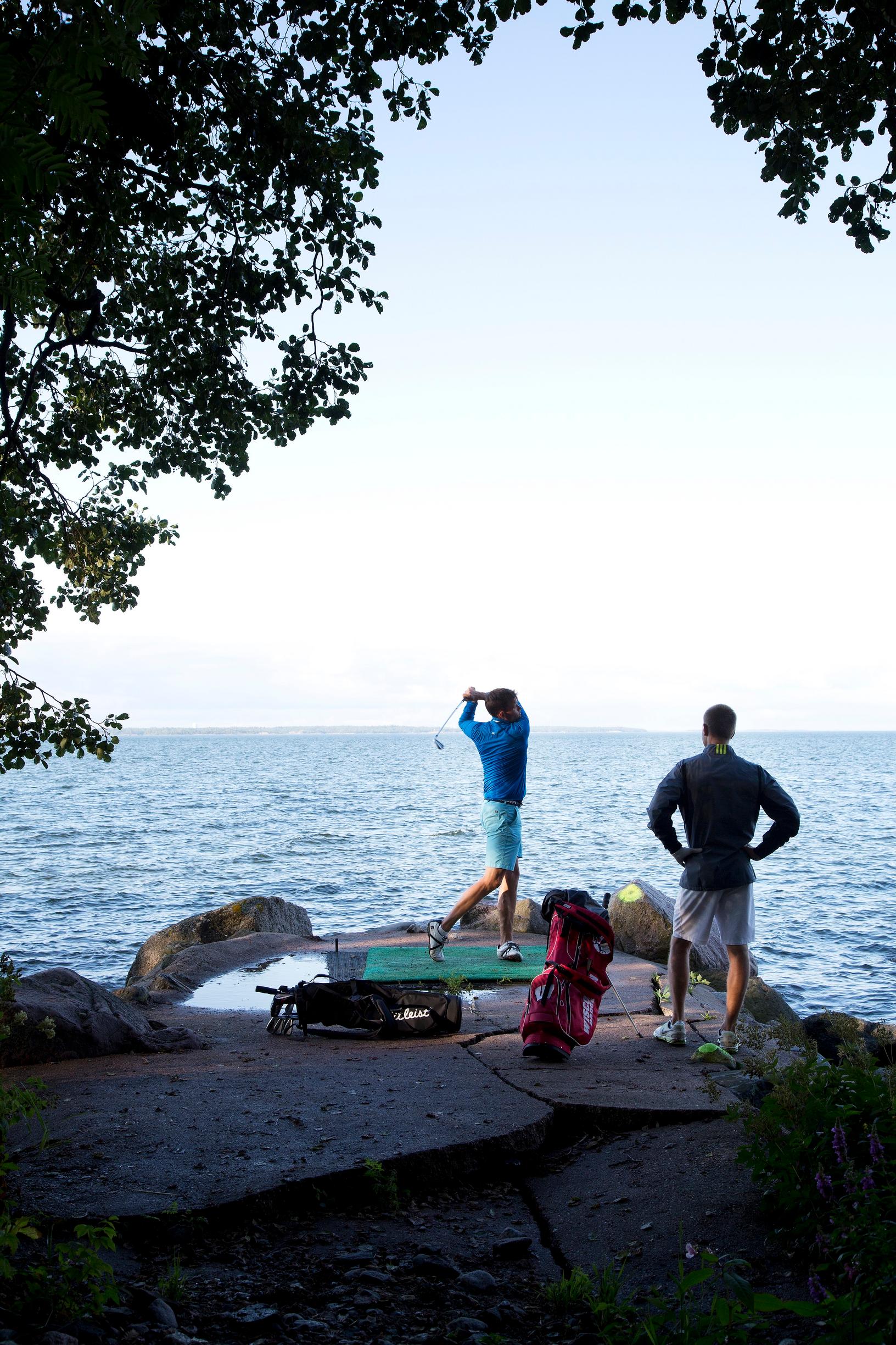 Isosaareen saapuva törmää väistämättä erikoiseen näkyyn. Kävelyreitin alussa, merimaisemien keskellä, on siellä täällä golfviheriöitä sileäksi parturoituine nurmiläntteineen.