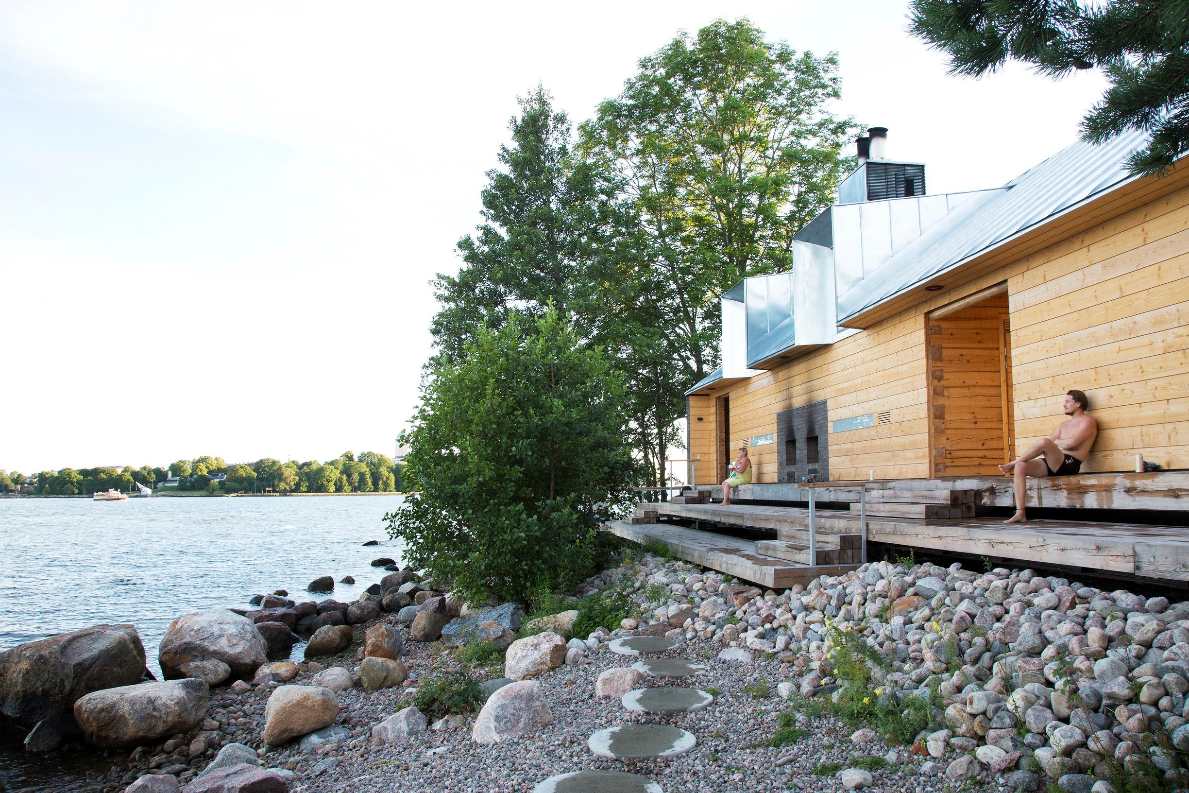 Meren rannalla sijaitsevan rakennuksen muodot ja yksityiskohdat ovat kuin sisustuslehden sivuilta. On lämpimiä puun sävyjä ja hiilenharmaata tiiliseinää. Erityisen hieno ratkaisu on katon rajaan tehty iso ikkuna, jonka ansiosta lauteilla istuessa voi katsella suoraan merelle. Tunnelmaltaan paikka muistuttaa mantereella sijaitsevia Löylyä, Allasta ja Kulttuurisaunaa. 16 euron saunamaksukin on samaa luokkaa.