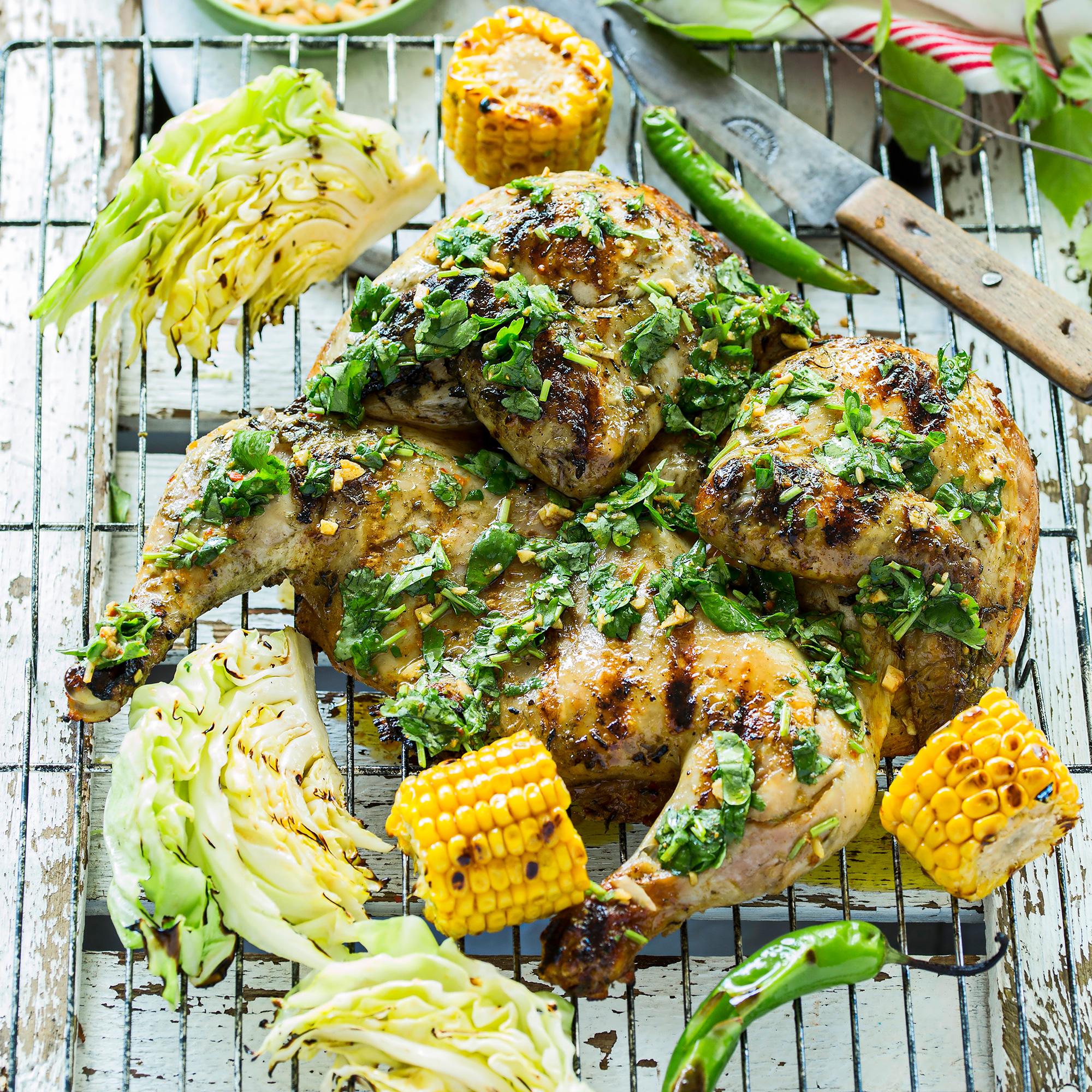 Kokonainen halsteribroileri, yrttinen chermoula-kastike ja grillattu varhaiskaali