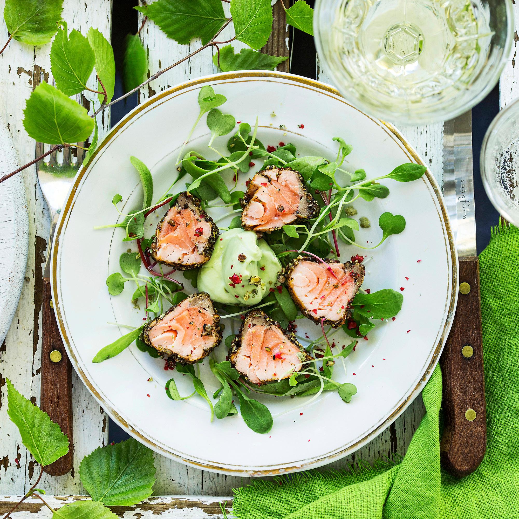Pippurinen lohipastrami ja avokado-wasabikreemi