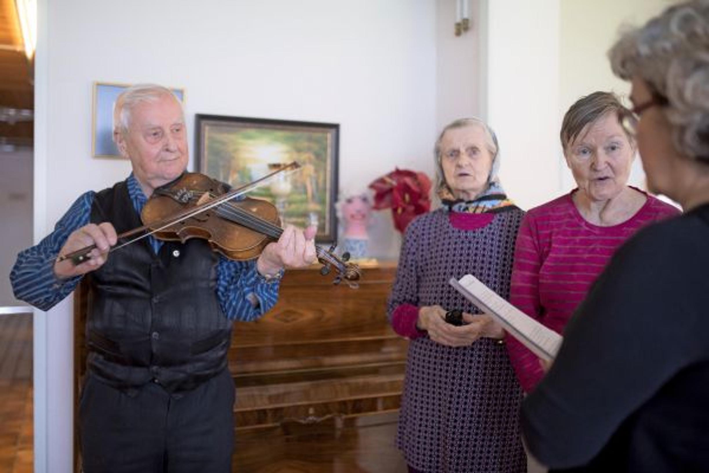 Hoivakodin asukkaat kerääntyvät laulamaan vastaavan ohjaajan, erikoissairaanhoitaja Ulla Kiminkisen ja muun henkilökunnan kanssa Tule, tule kultani.