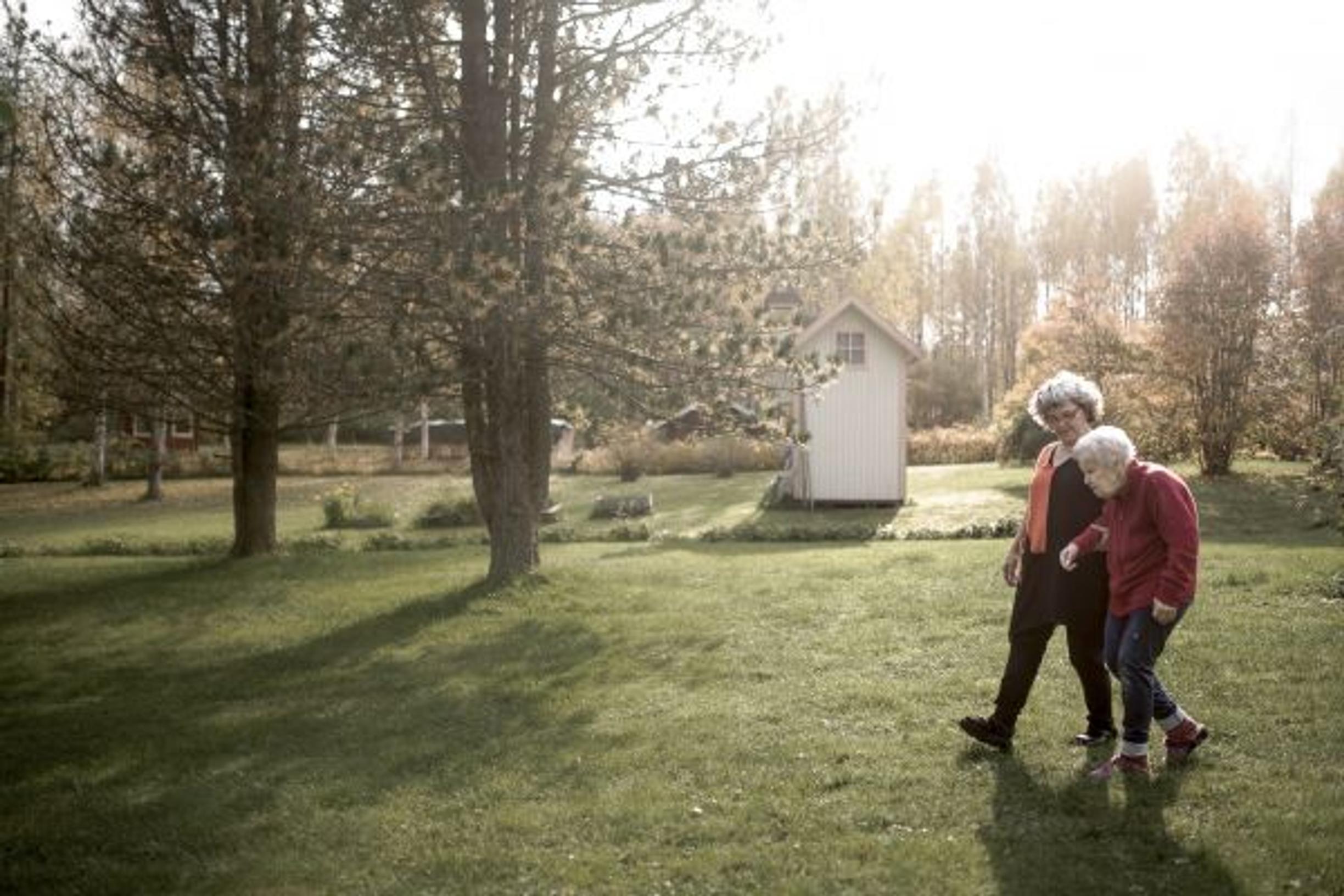 SPR:n ystäväpalvelun vapaaehtoinen ja pari seurakunnan työntekijää käyvät ulkoiluttamassa asukkaita.