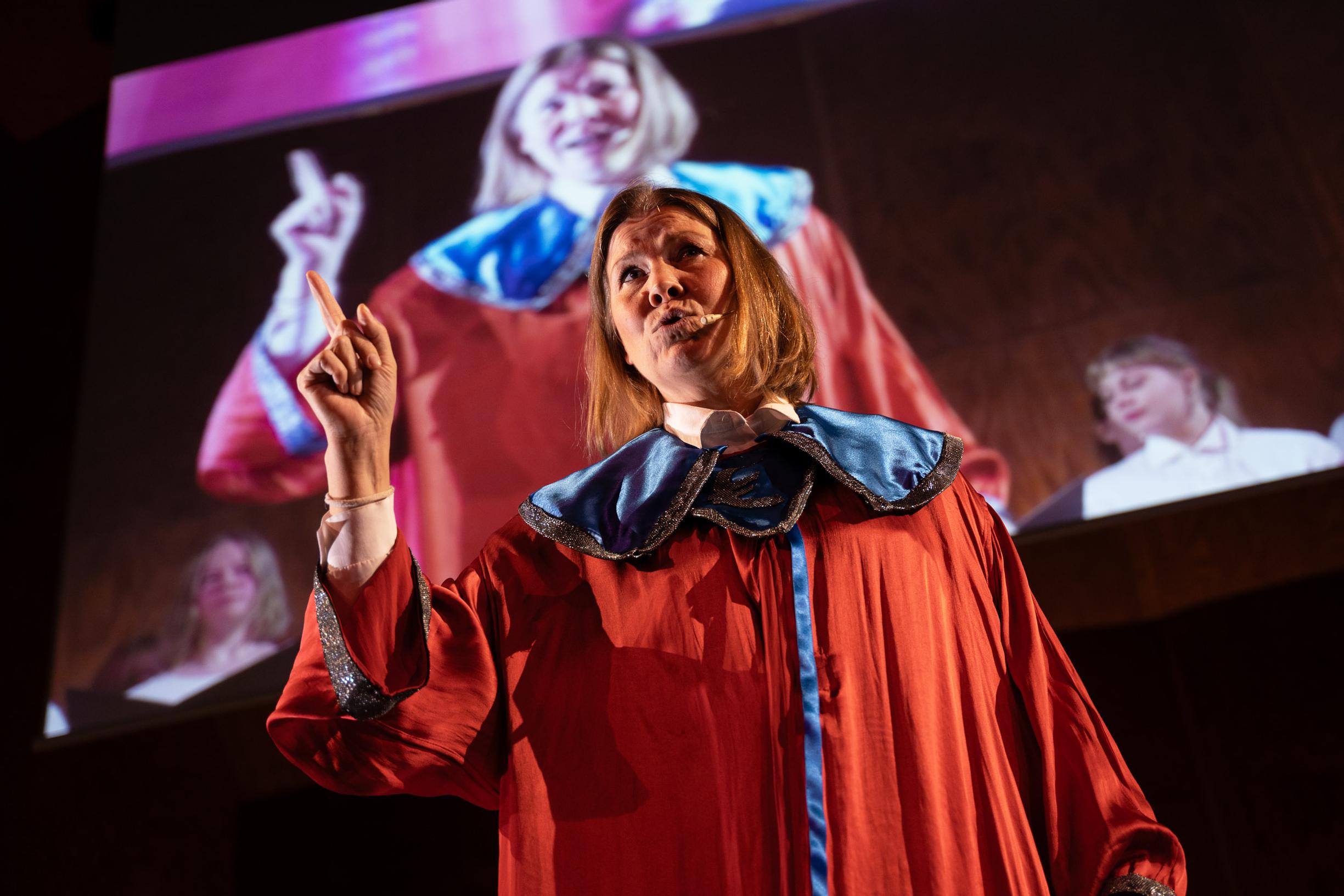 KOM-teatterin Hölmölä – Suuri talousfoorumi Aalto-yliopiston Töölön juhlasalissa 18. lokakuuta asti. Ihastuttavasti yllätysten täyttämä esitys saa nauramaan ääneen.