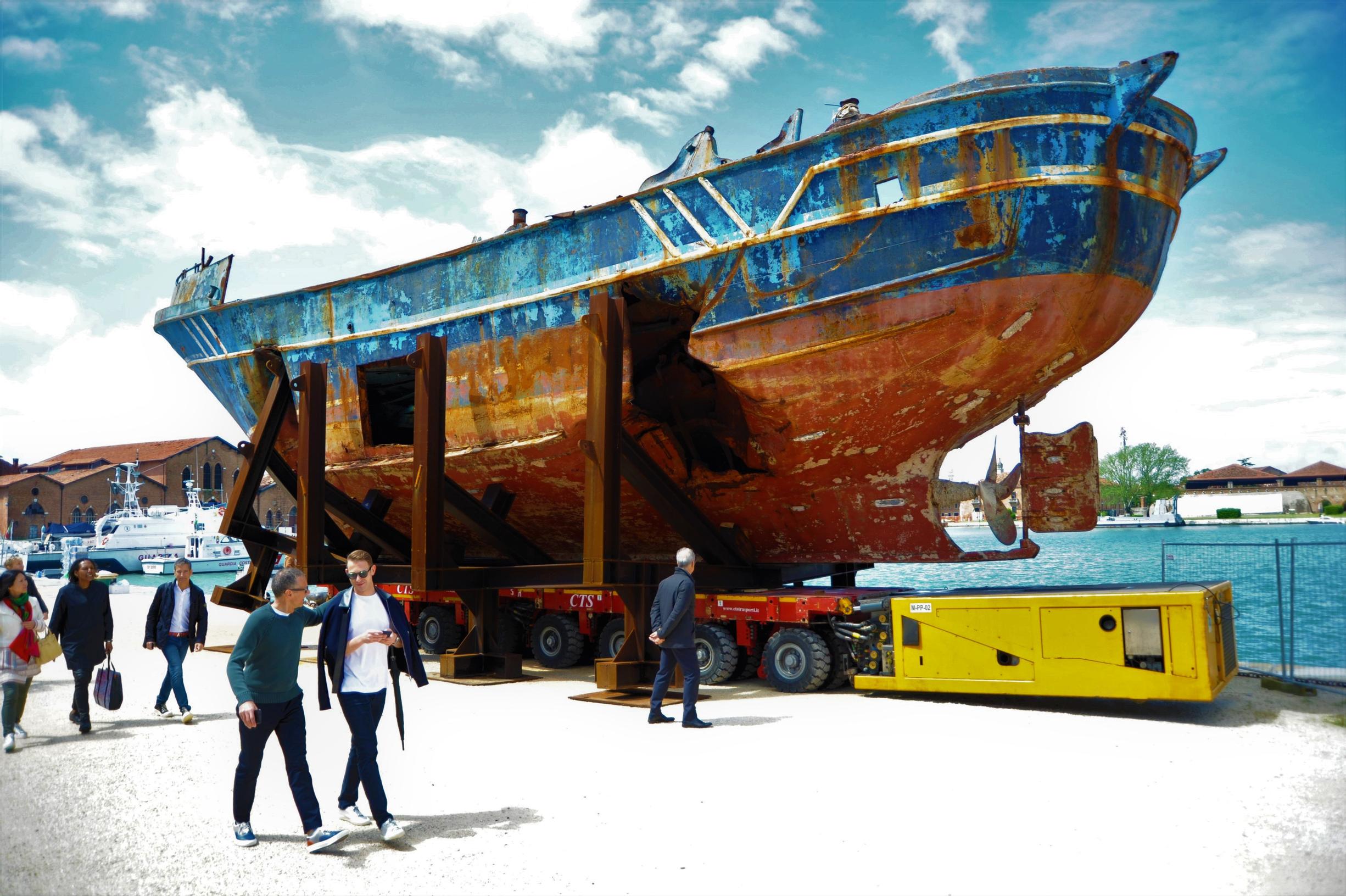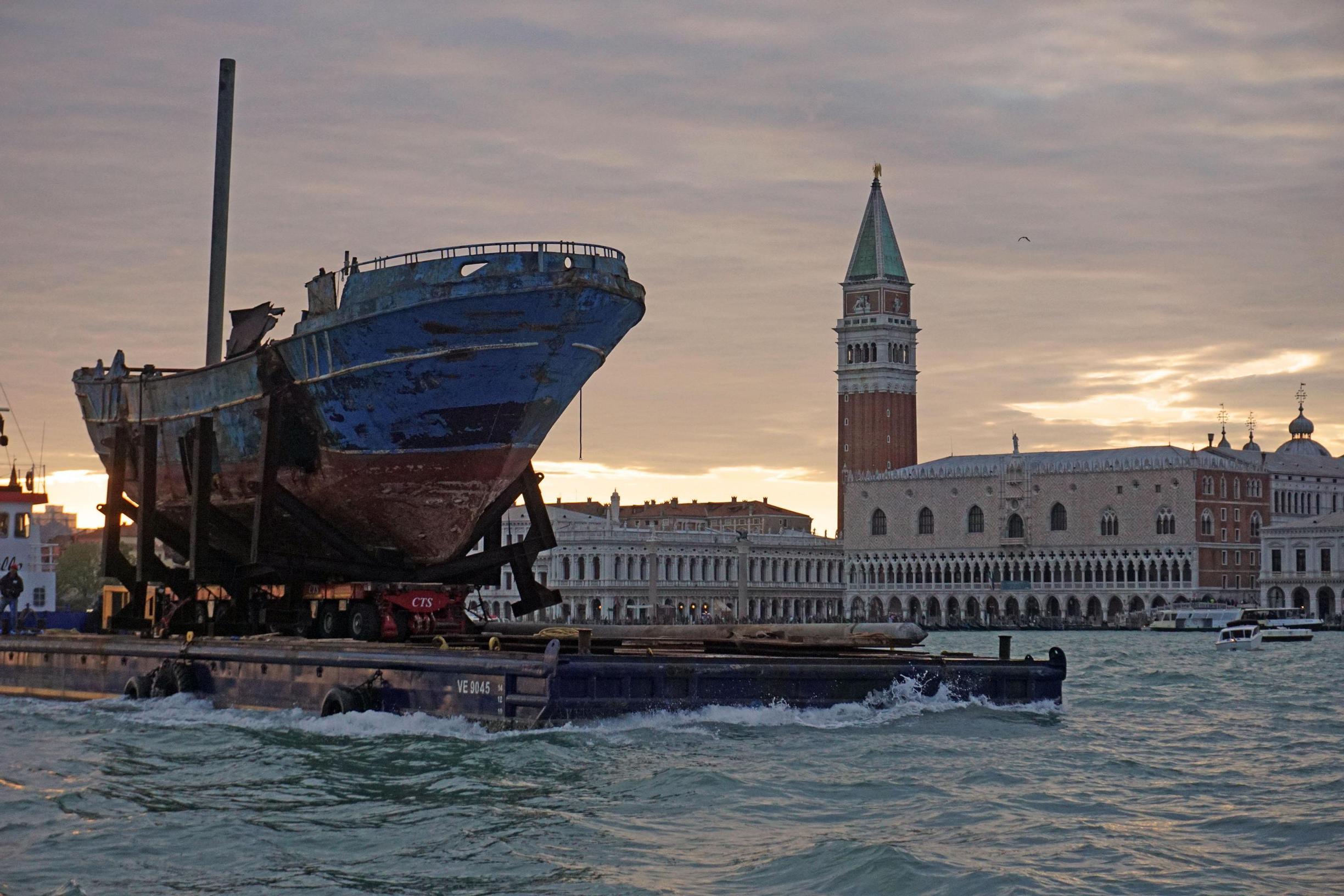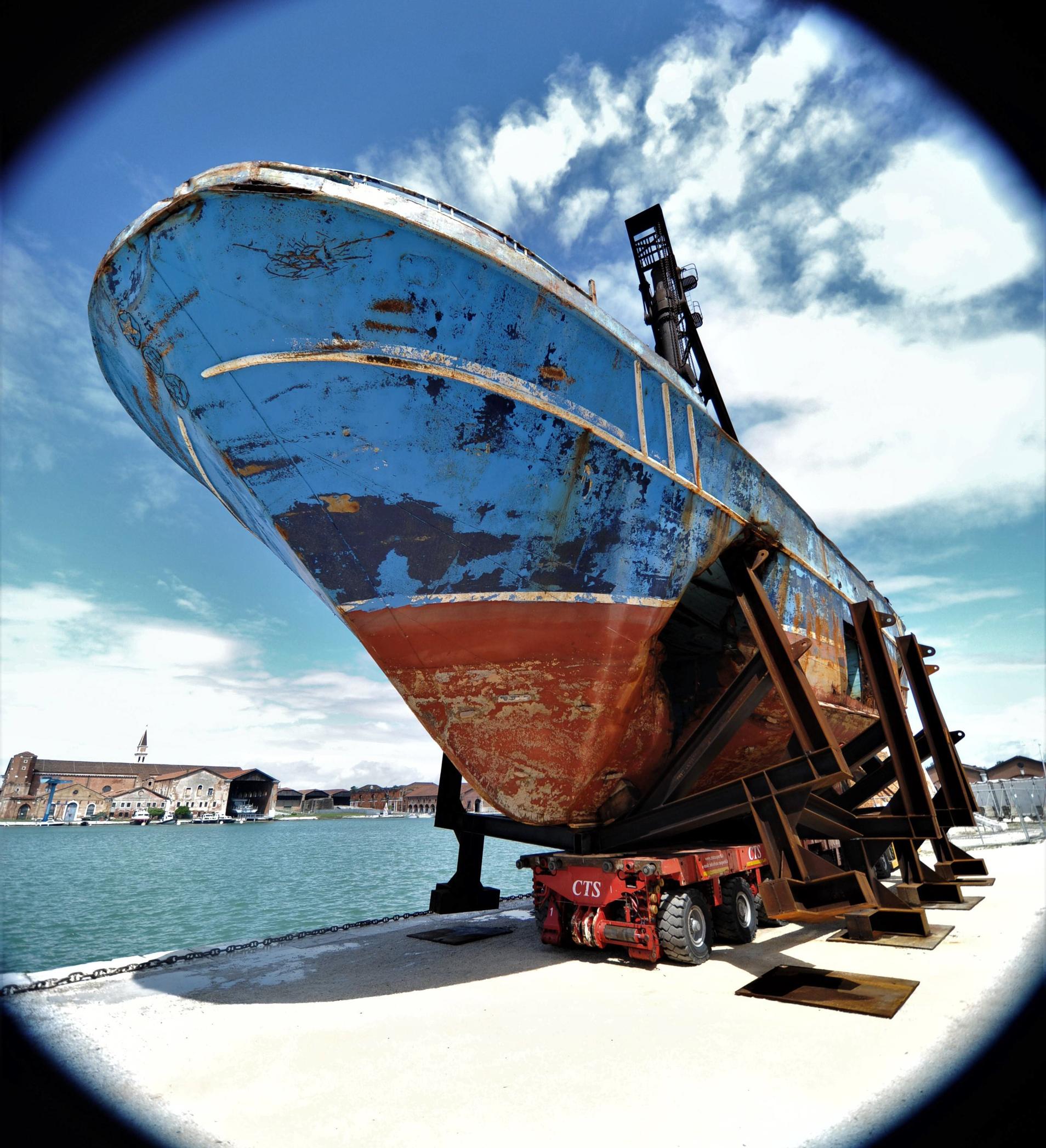 Parikymmenmetrinen sininen kalastaja-alus on nostettu venetsialaisen kanavan varrelle, paksuista teräspalkeista tehdyn kehikon varaan. Neljä ruosteen väristä kulmarautaa kannattelee hylkyä sen molemmin puolin, ympärille on vedetty nauhoista kaiteet.