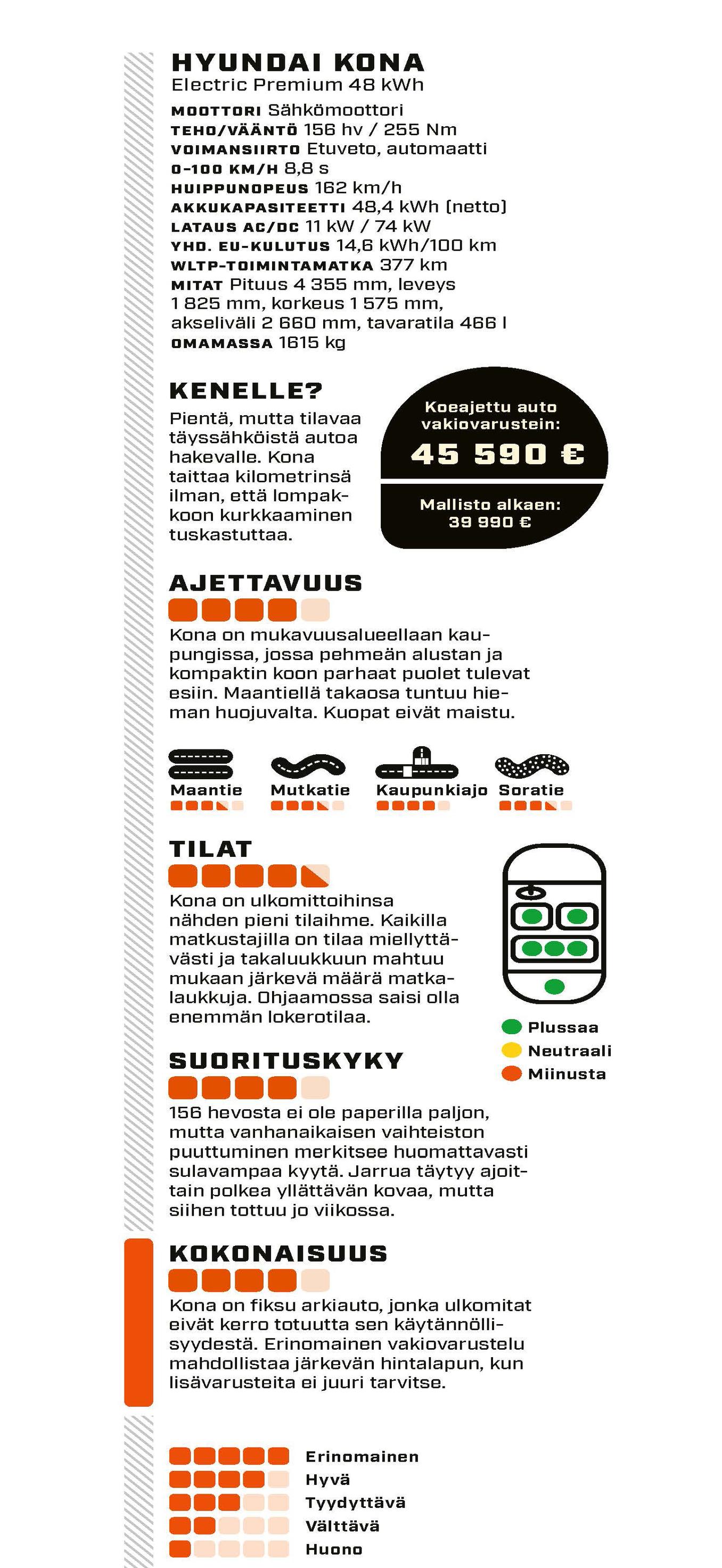 Jos ja kun erinäköisistä piippauksista pääsee ylitse, on aika keskittyä Konan erinomaiseen tarjontaan. Kojelaudan suuret näytöt tulevat vakiona varustetasosta riippumatta. Sama koskee ratinlämmitystä, latausluukun lämmitystä, akuston esilämmitystä ja mukautuvaa vakionopeudensäädintä. Tässähän tuntuu olevan jo hyvä paketti tulevan talven varalle. Konaa on myyty reilussa kuudessa vuodessa yli 100 000 kappaletta Eurooppaan, eikä horisontissa ole syytä miksei sama tahti voisi jatkua. Toisaalta myös kilpailu on koventunut keskikokoisten sähköautojen rintamalla.