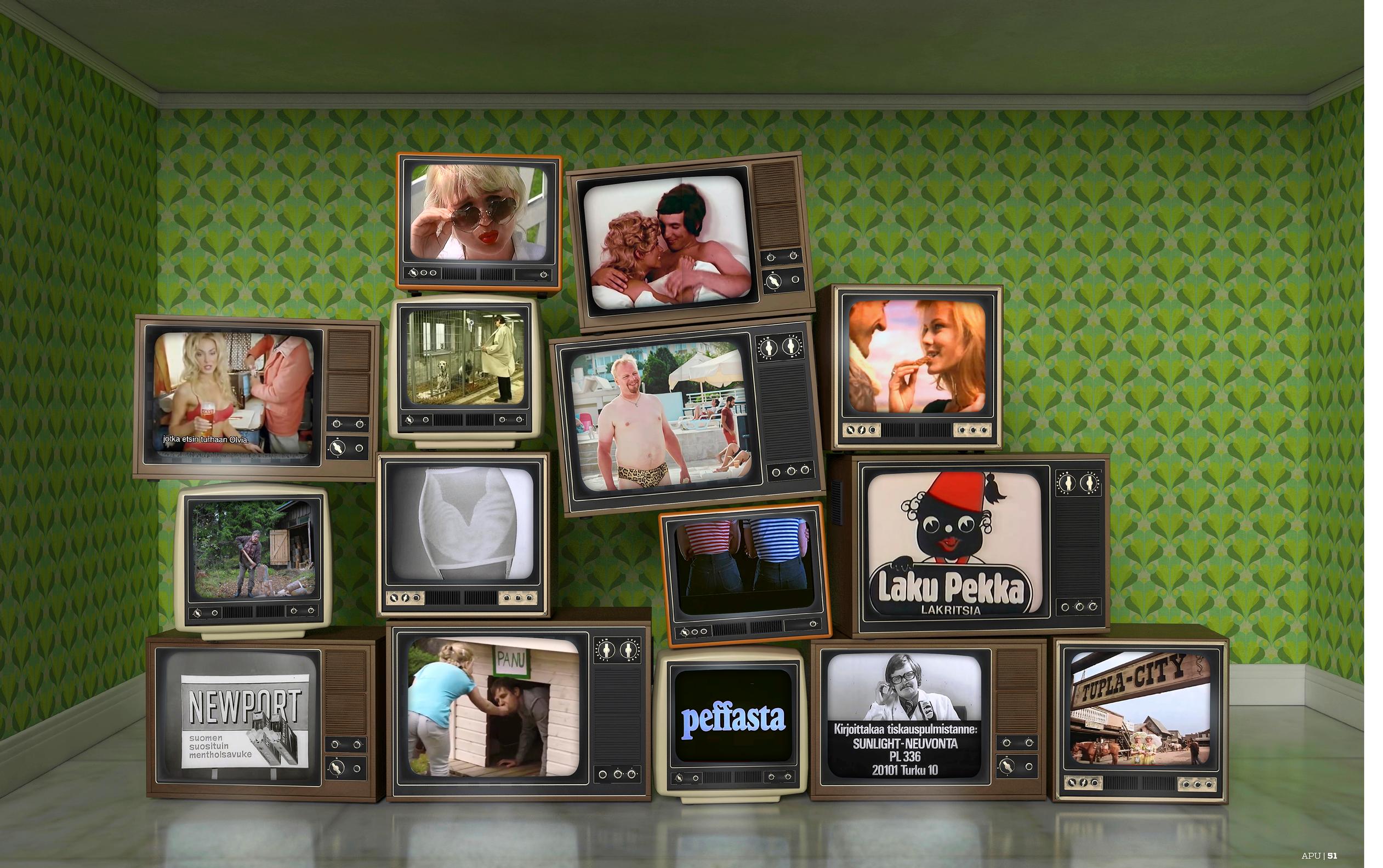 Mukana on myös mainoksia, jotka olivat aikanaan viattomia, mutta vastaavia ei ikipäivänä voisi näyttää enää tämän päivän televisiossa. Millaisen kohun aiheuttaisi mainos, jossa pesuainetta kaadetaan suoraan Itämereen tai maalia mainostetaan isoilla rinnoilla?