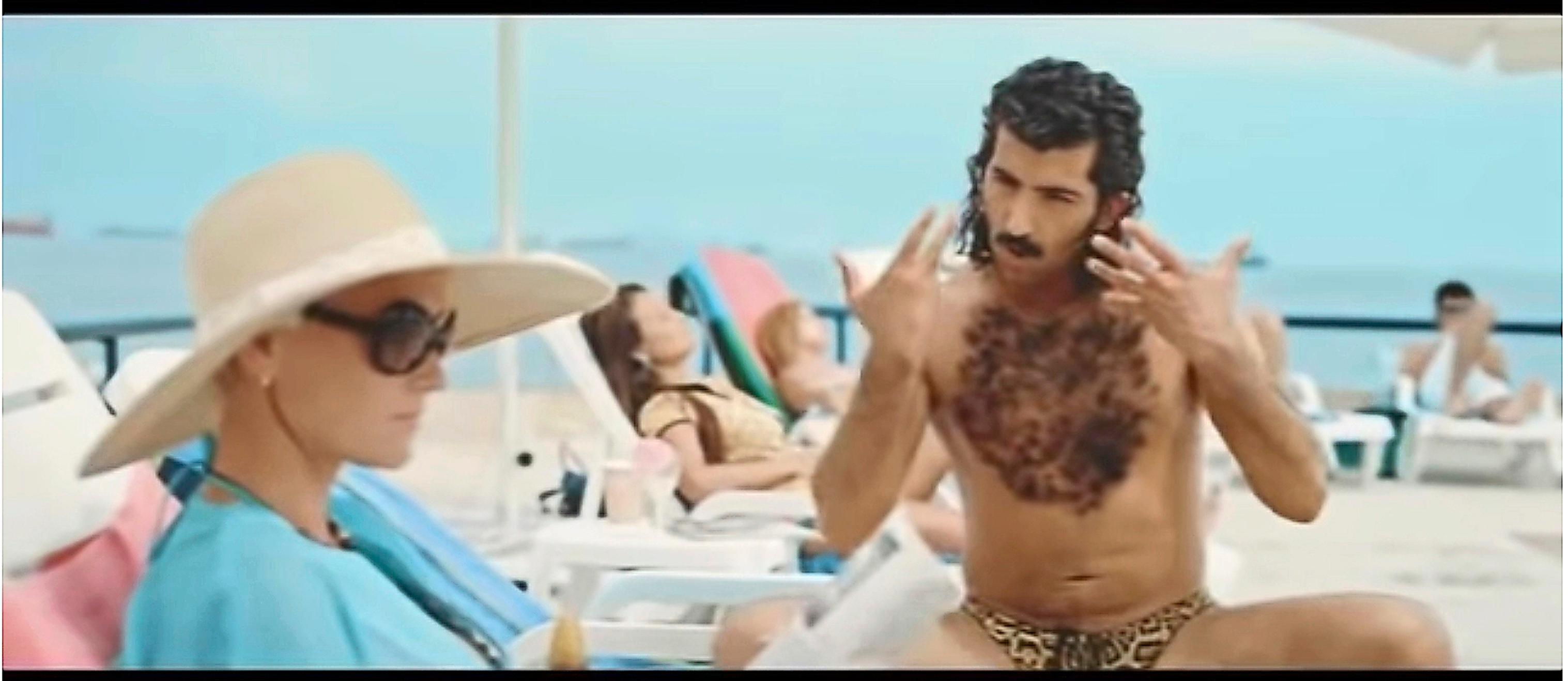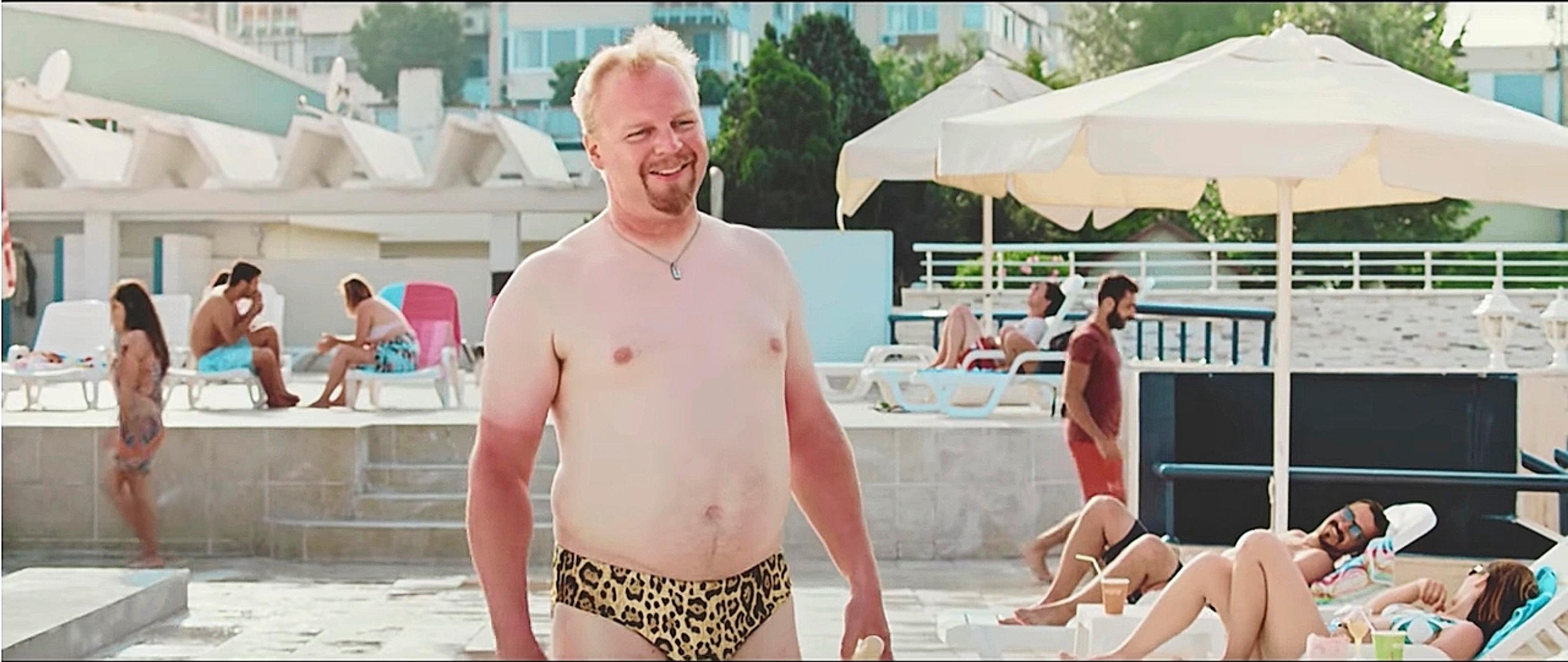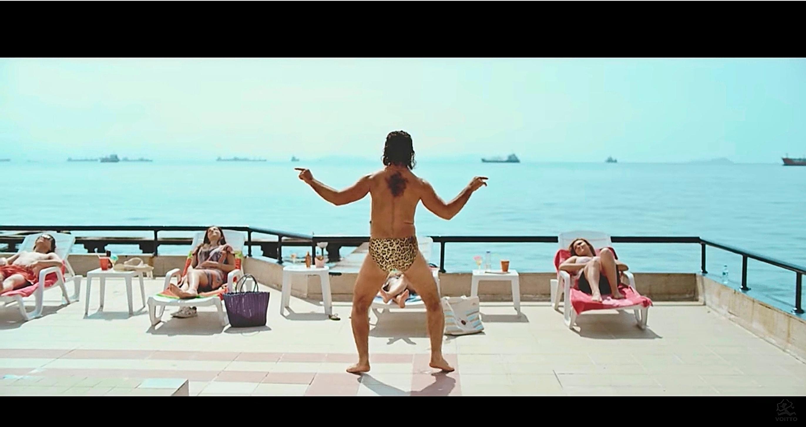 Mainoksessa esiintyivät pullea, vaalea suomalaismies sekä niukoissa leopardiuimahousuissa miehen vaimolle flirttaileva ulkomaalainen.