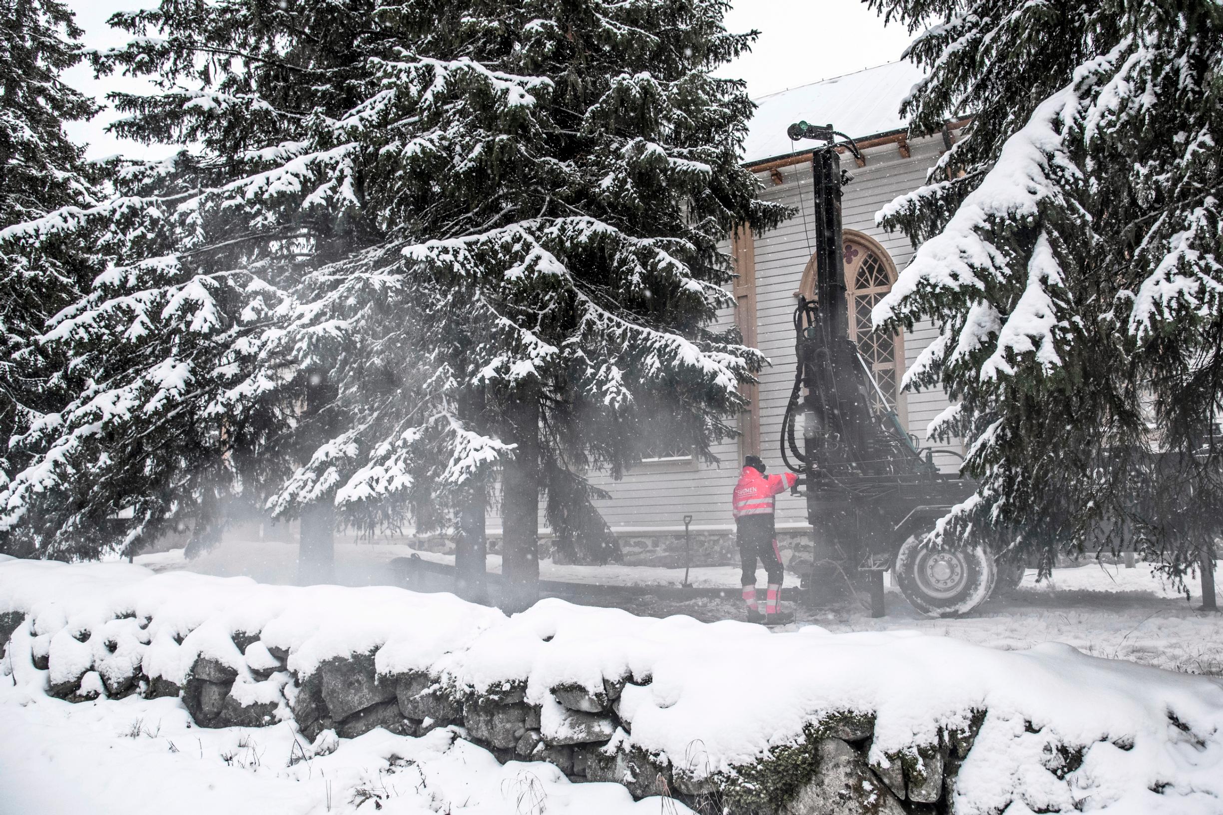 Paakkola katsoo kirkon pihalla, kun Suomen Maalämpöporauksen porari Sauli Paavola poraa neljää 250 metriä syvää maalämpö