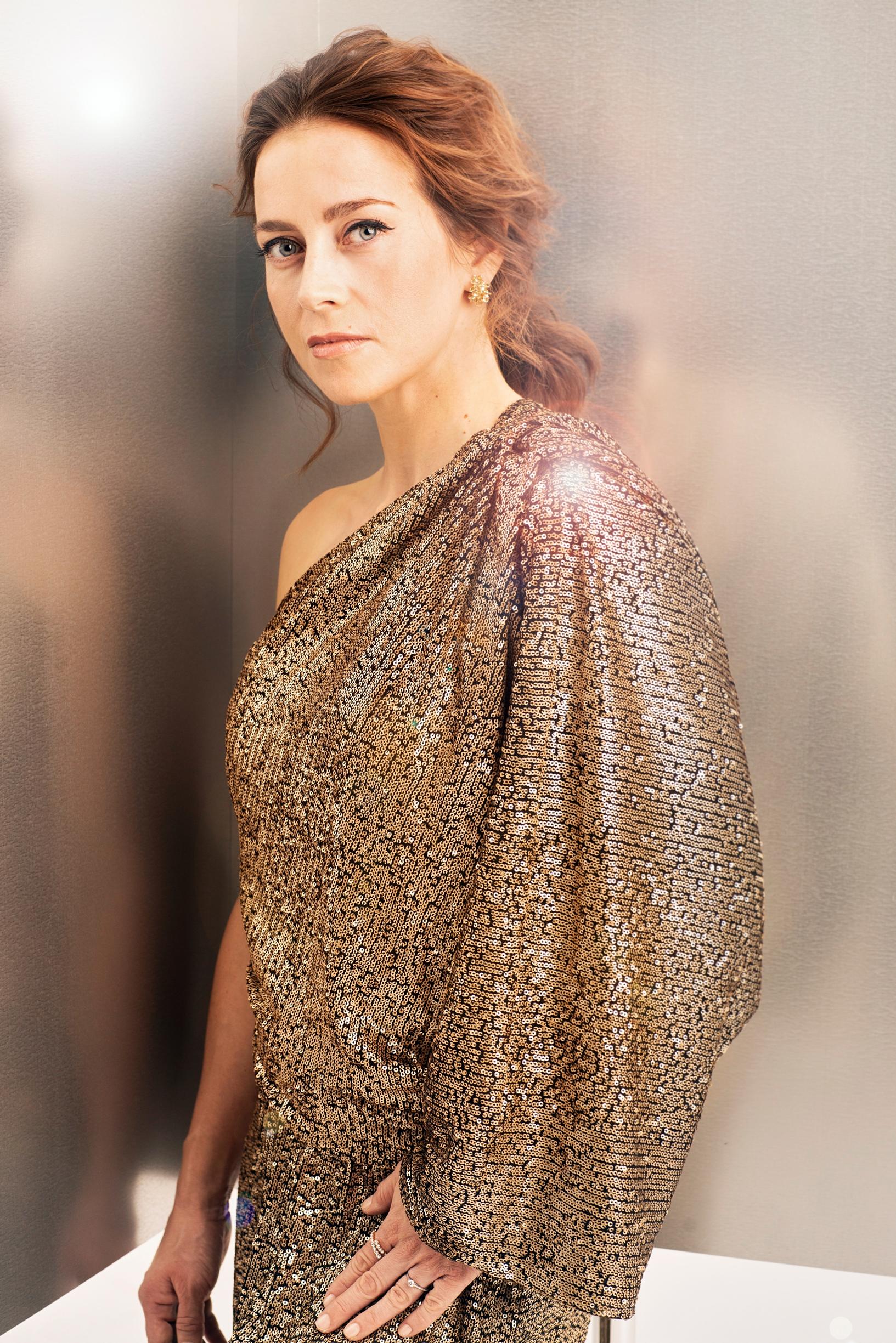 Tyyli Vesa Silver, meikki Heidi Reponen. Kultainen paljettitoppi Katri Niskanen, korvakorut ja sormukset Glitter, metallinhohtoinen mekko naruolkaimilla Katri Niskanen, pörröinen neule Halo, sukat Helsingin Villasukkatehdas.