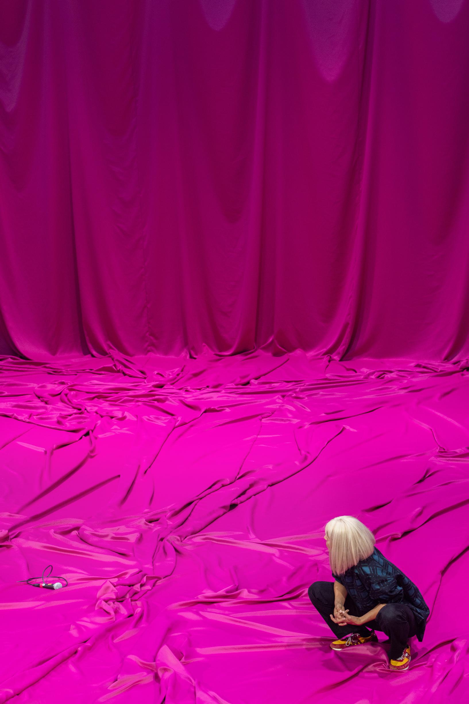 Chrisander Brun on suunnitellut sekä lavastuksen, valot että puvut, ja ne kaikki olivat tärkeässä roolissa. Ihastelin valon käyttöä pariinkin otteeseen, mutta show'n varasti lavastus. Ensimmäistä näytöstä dominoi valtava vaaleanpunainen kangas, joka liikkui kuin Saharan dyynit. Välillä joku päätyi sen allekin, kuin Dyyni-elokuvien hiekkamato. Ensi-illassa näyttelijät vielä vähän kompastelivat kangasmyttyihin, mutta visuaalisena keinona se on tehokas.
