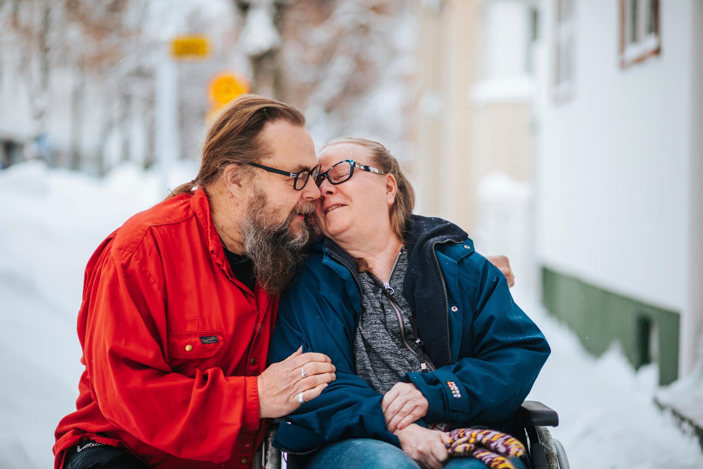 Aina kuljettiin käsi kädessä ja oltiin hyvin läheisiä. Monta kertaa oli vuosien aikana pysähdytty ja todettu, miten hyvä on olla yhdessä. Kaijaa itkettää. Vähän väliä Juuso pyyhkii kyyneleitä ja korjaa Kaijan silmälasien asentoa.