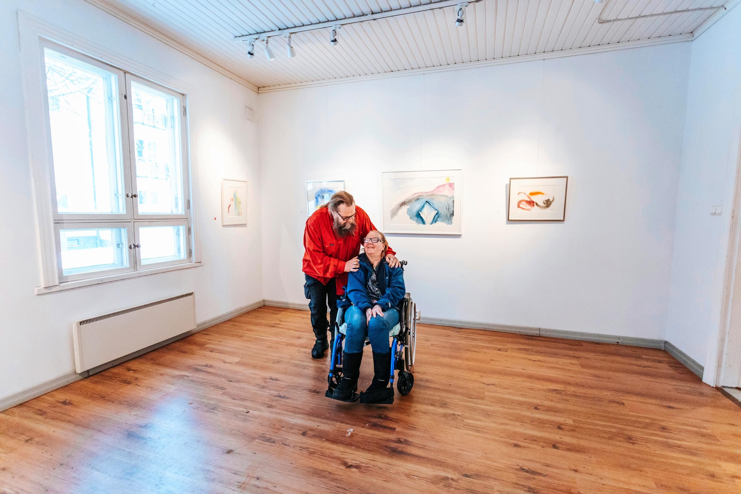 Juuso työntää Kaijaa pyörätuolissa näyttelyhuoneiden läpi. Valoisat, eteeriset kuvat ovat Kaijan viimeisiä töitä ennen kohtausta. Kaija on signeerannut ne, mutta hän ei muista niitä. Uusia töitä ei ole luvassa.