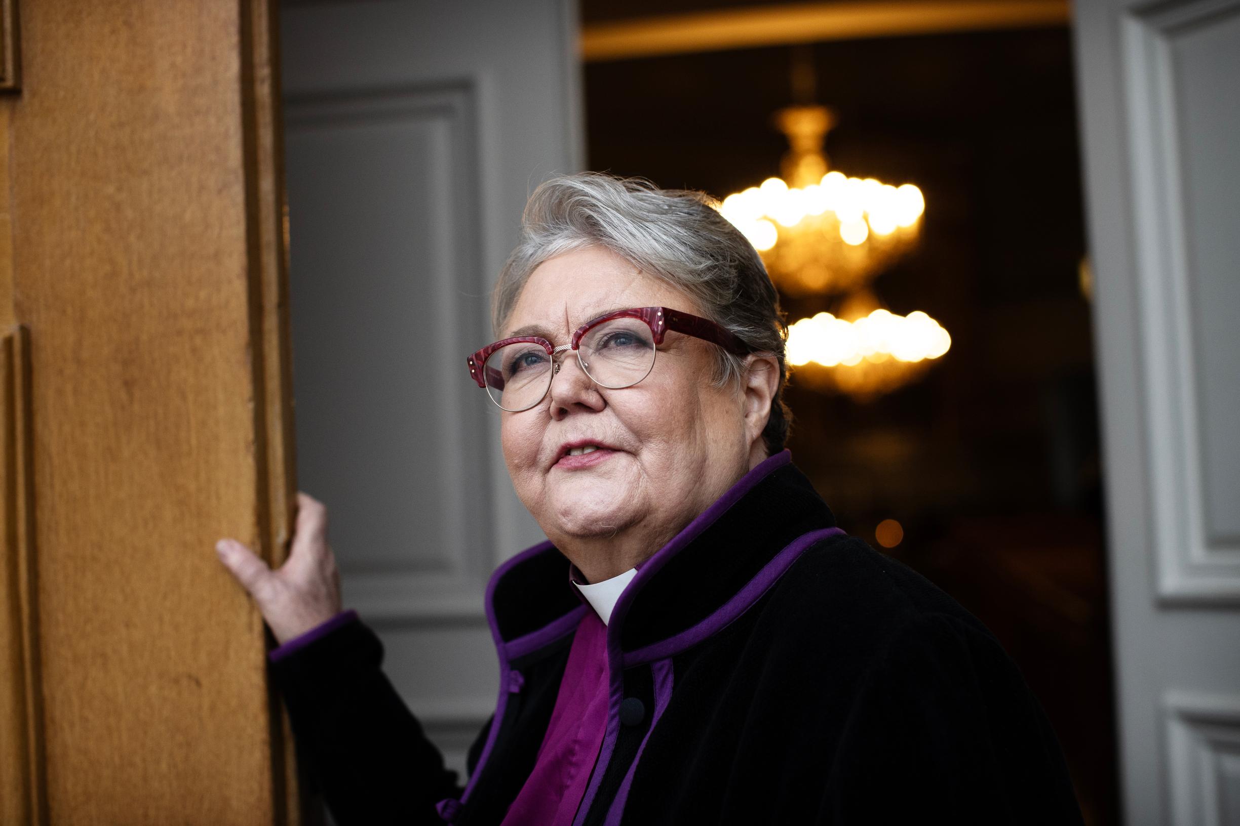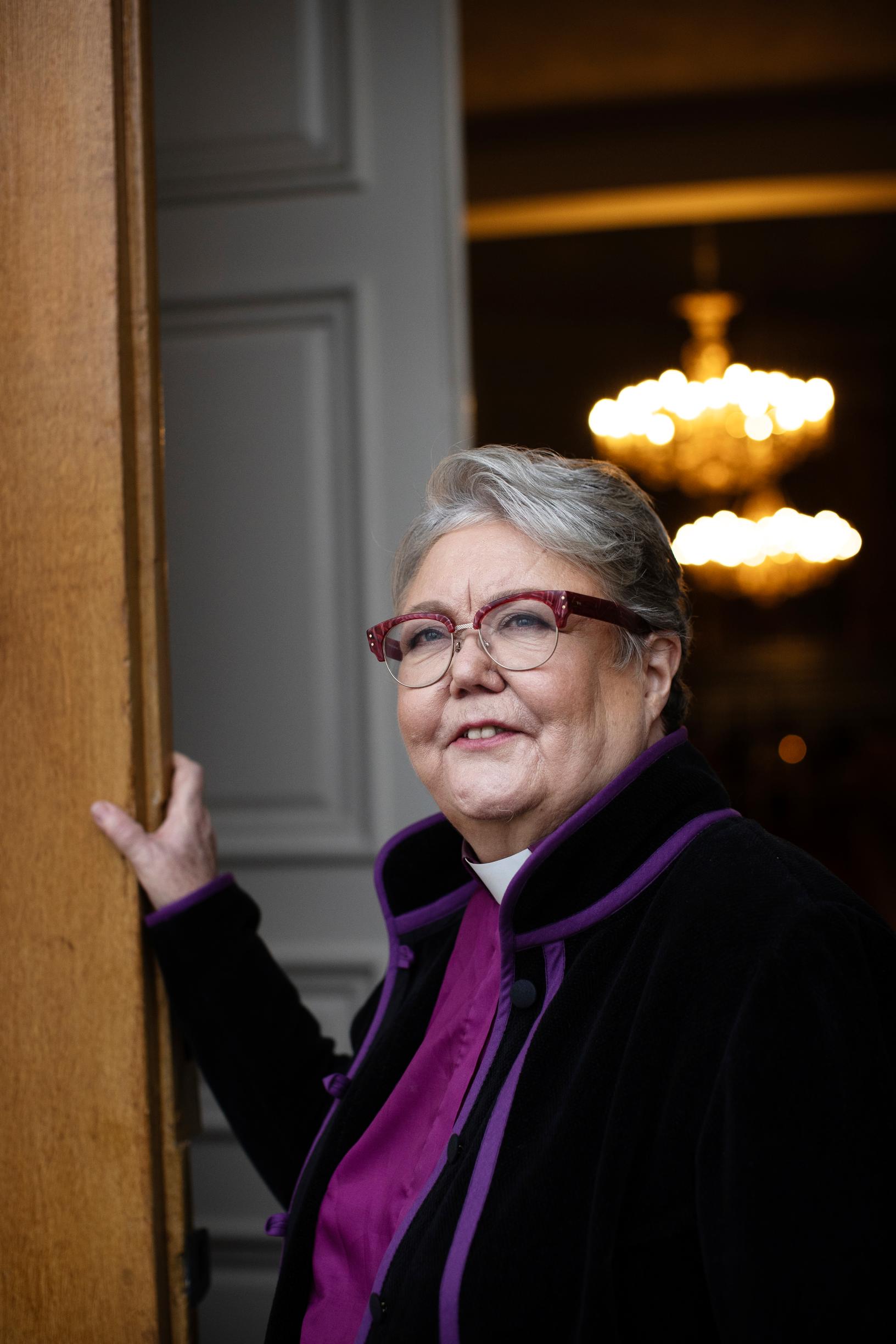 Irja Askola puhuu Helander-kodin kirjastossa rauhallisesti. Hänen nimensä on liitetty muutokseen siitä lähtien, kun hänet vihittiin papiksi 1988 ja Suomen ensimmäiseksi naispiispaksi 2010. Molempiin tilaisuuksiin liittyivät tiukat turvajärjestelyt.