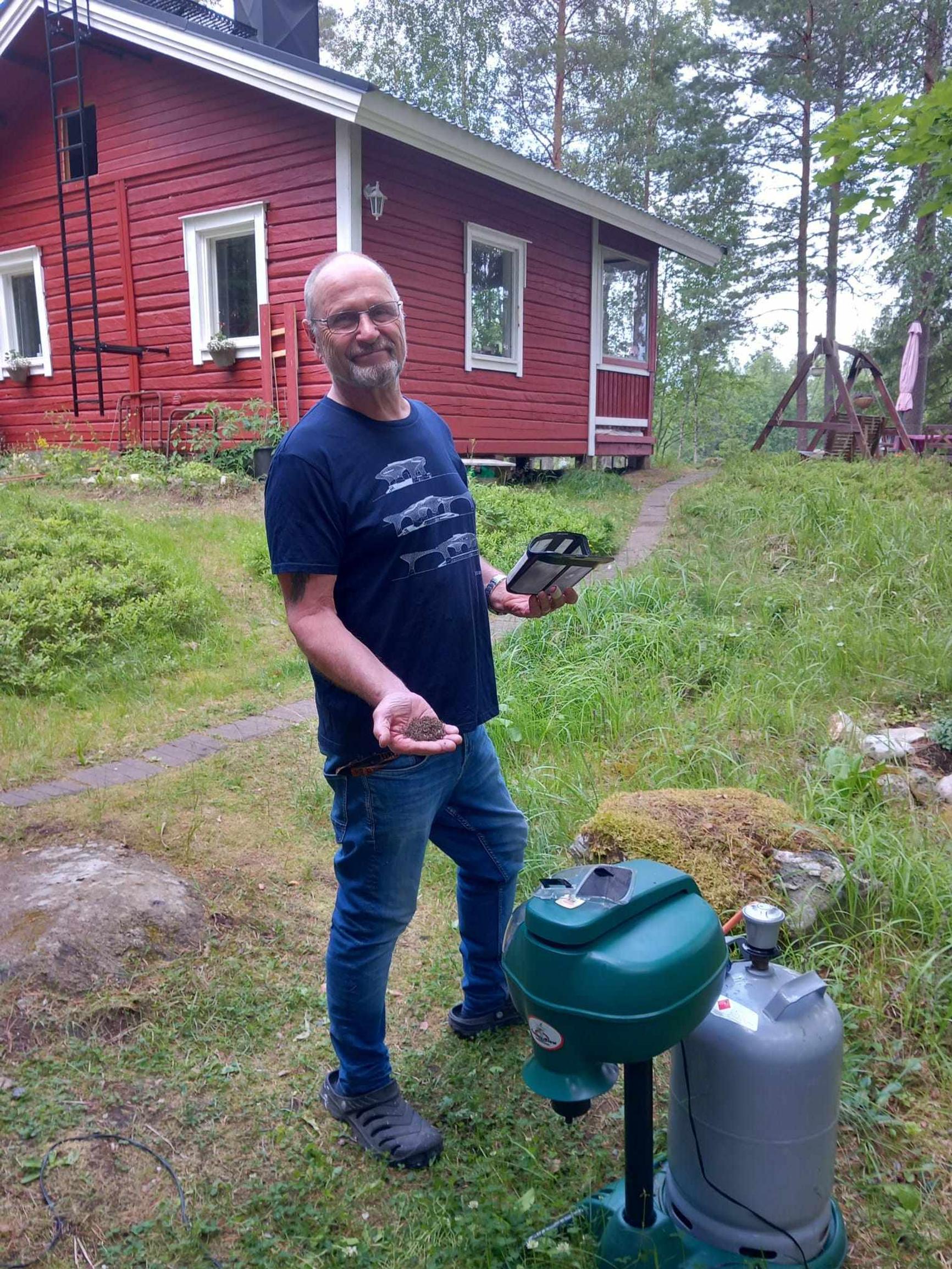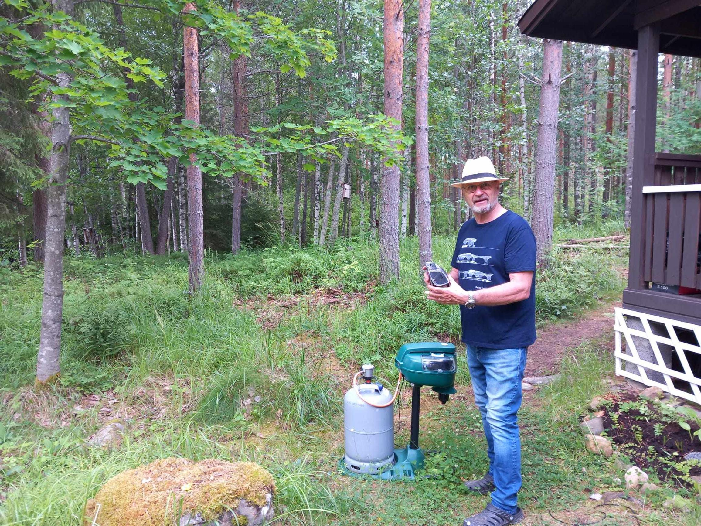 – Ensimmäisenä kesänä siirtelin ansaa eri paikkoihin. Nyt olen huomannut, että se kerää hyttysiä paremmin ollessaan yhdessä ja samassa paikassa. Saunan edestä se on ottanut hyvin. Kyllä tässä huomaa, että itikoita on vähemmän, mies kertoo.