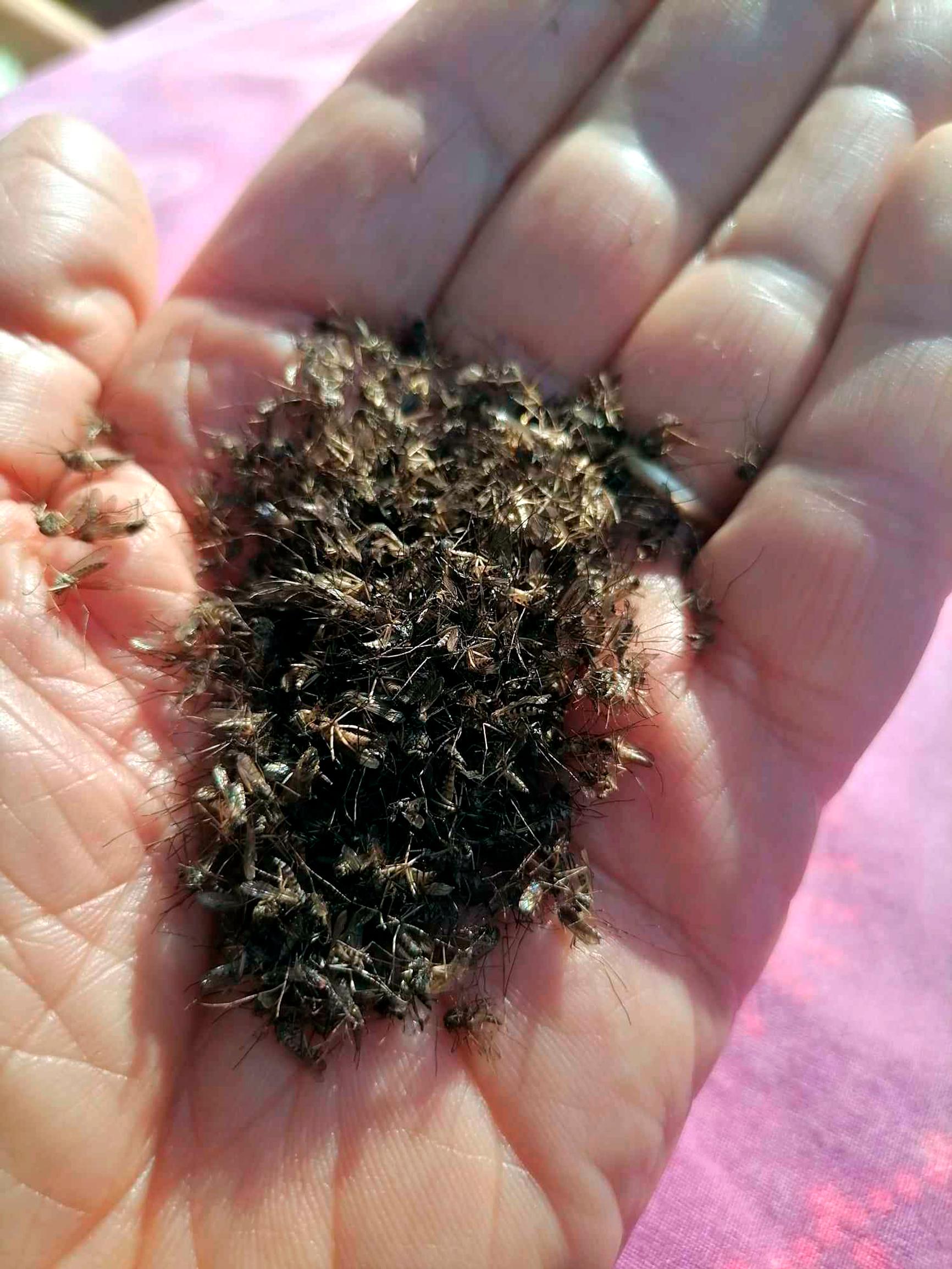 Jaakko Vasarainen esittelee hyttysansan keräämää saalista, kämmenellistä kuivunutta ja kuollutta hyttysmassaa. Parhaimmillaan laite kerää tämän määrän vuorokaudessa.