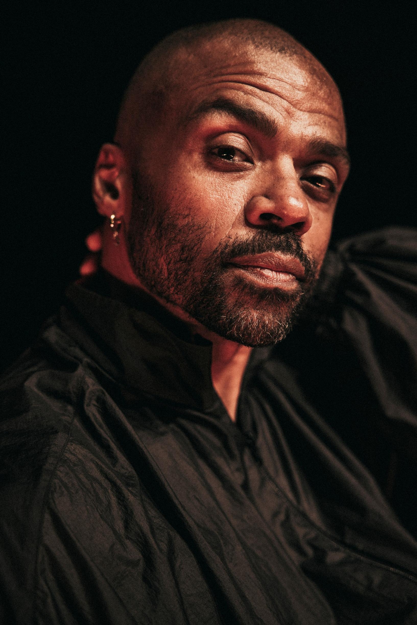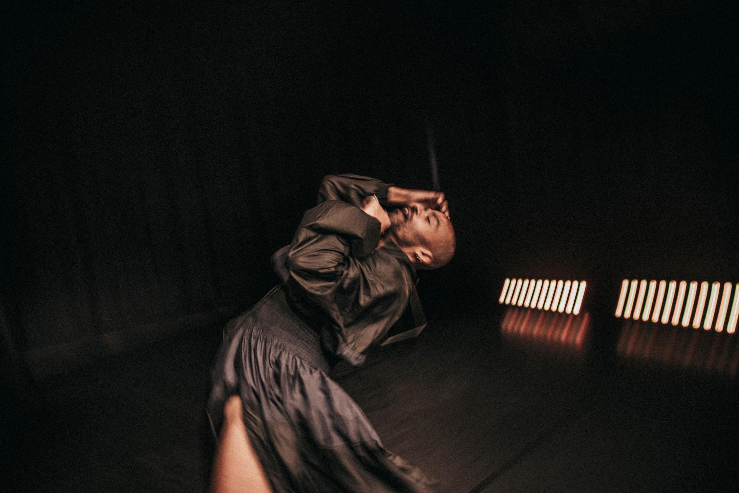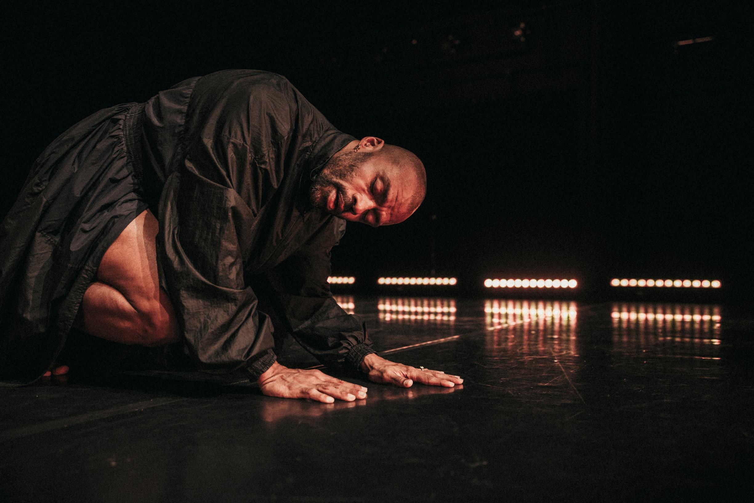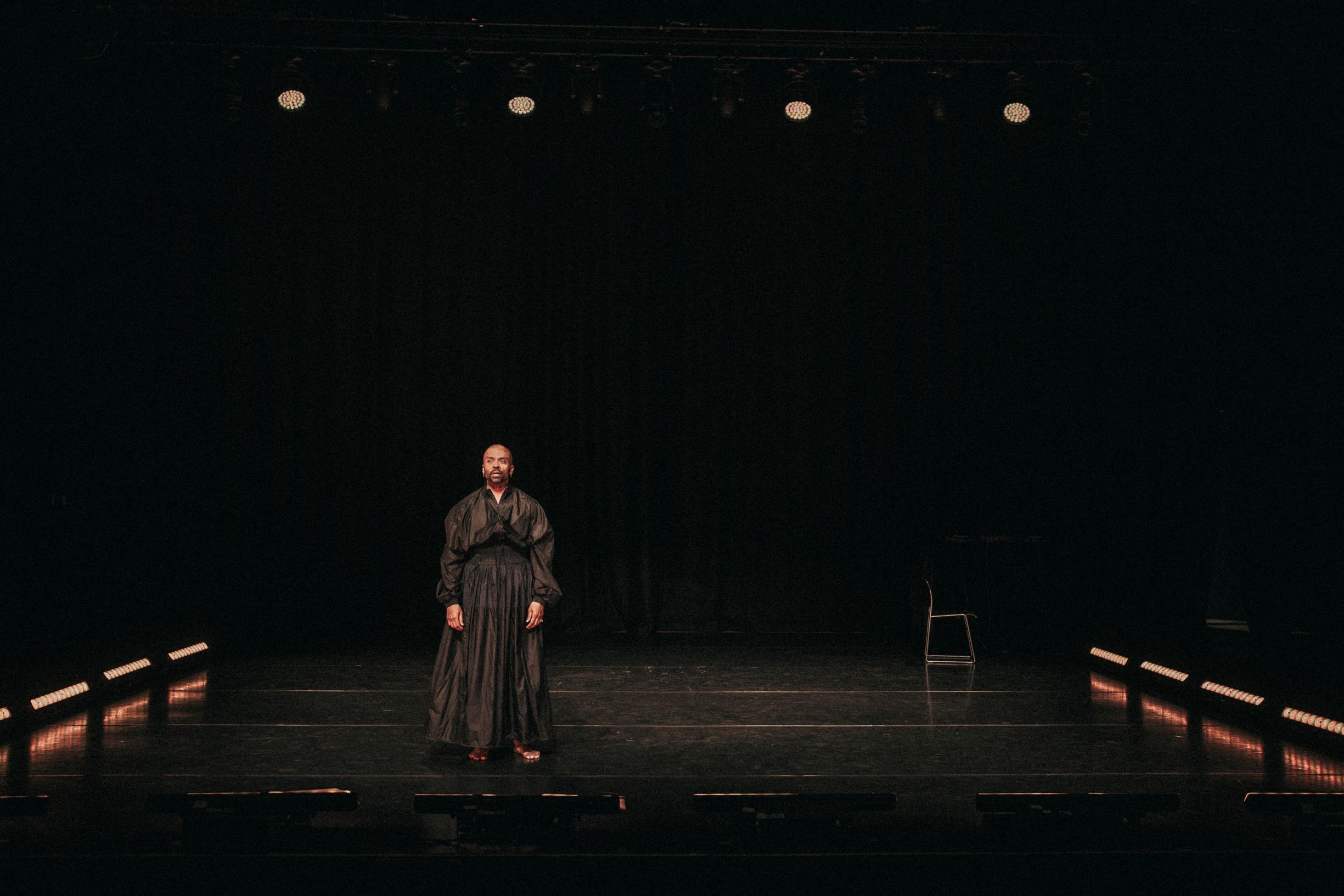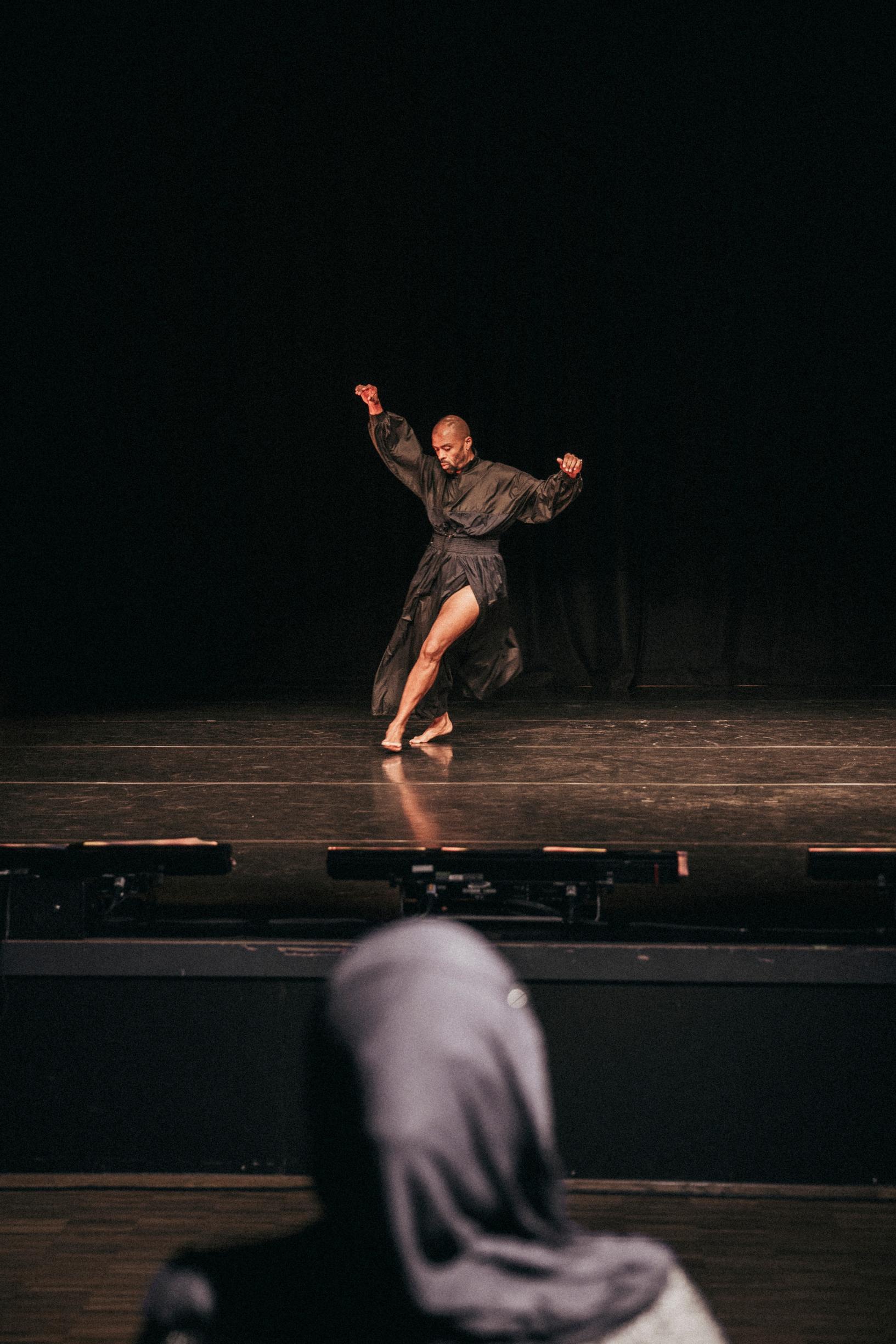 Näyttämöllä liikkuu ruskea mies vahvasti ja sulavasti, omissa nahoissaan ja pitkissä helmoissaan. Katsomossa istuu valkoinen nainen huntu päässä, katse liimautuneena tanssijaan.