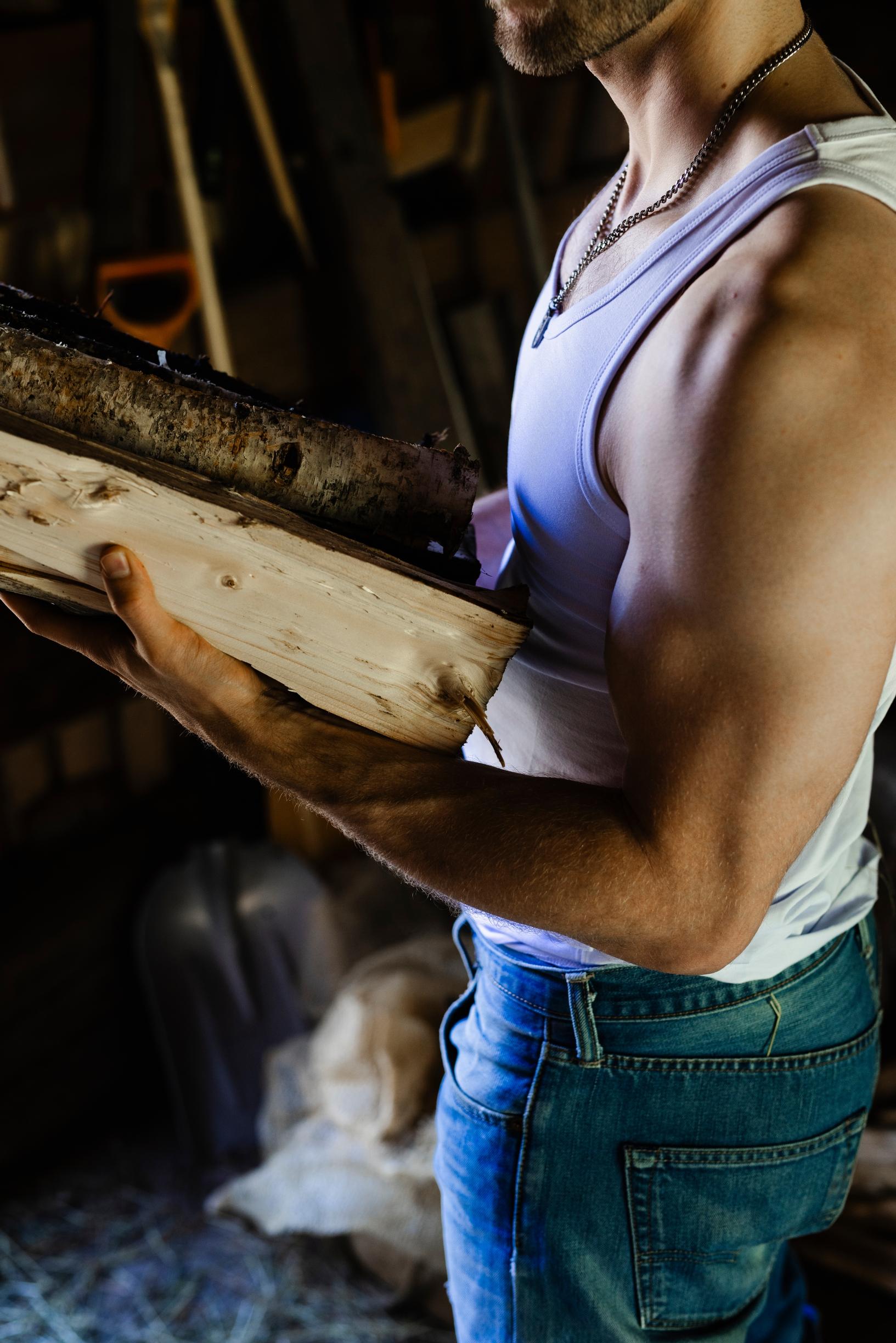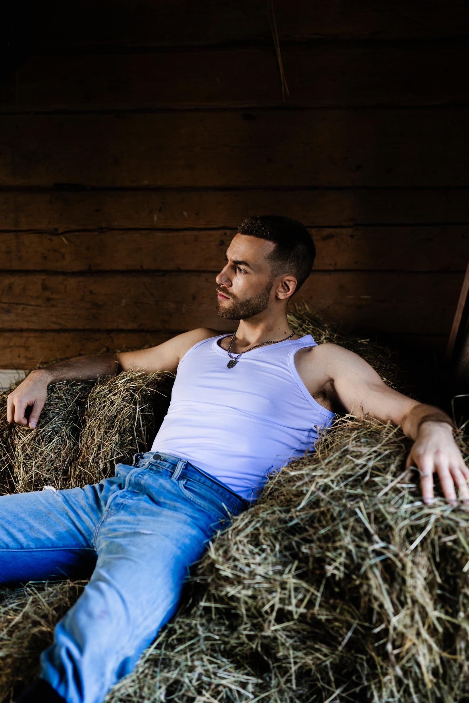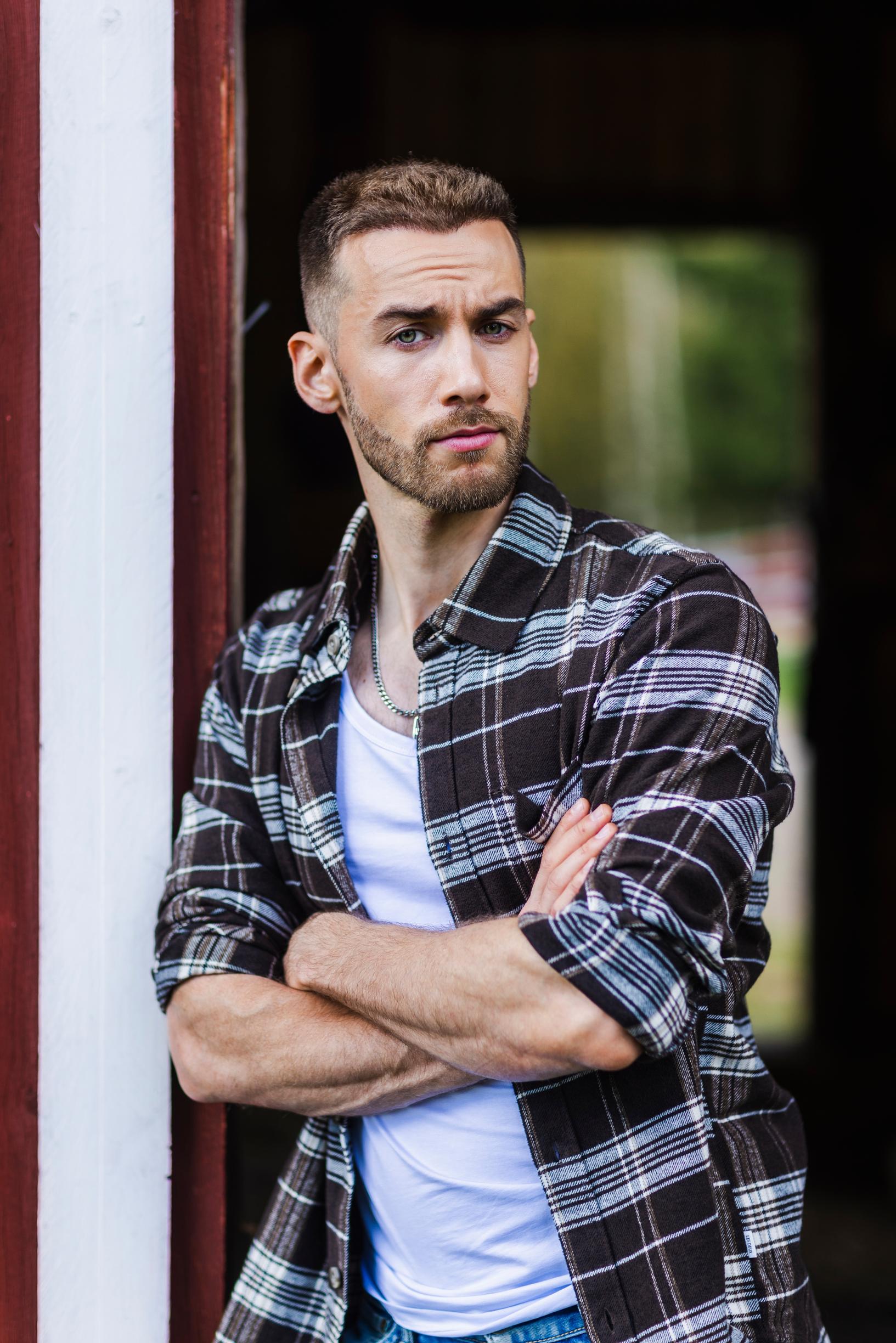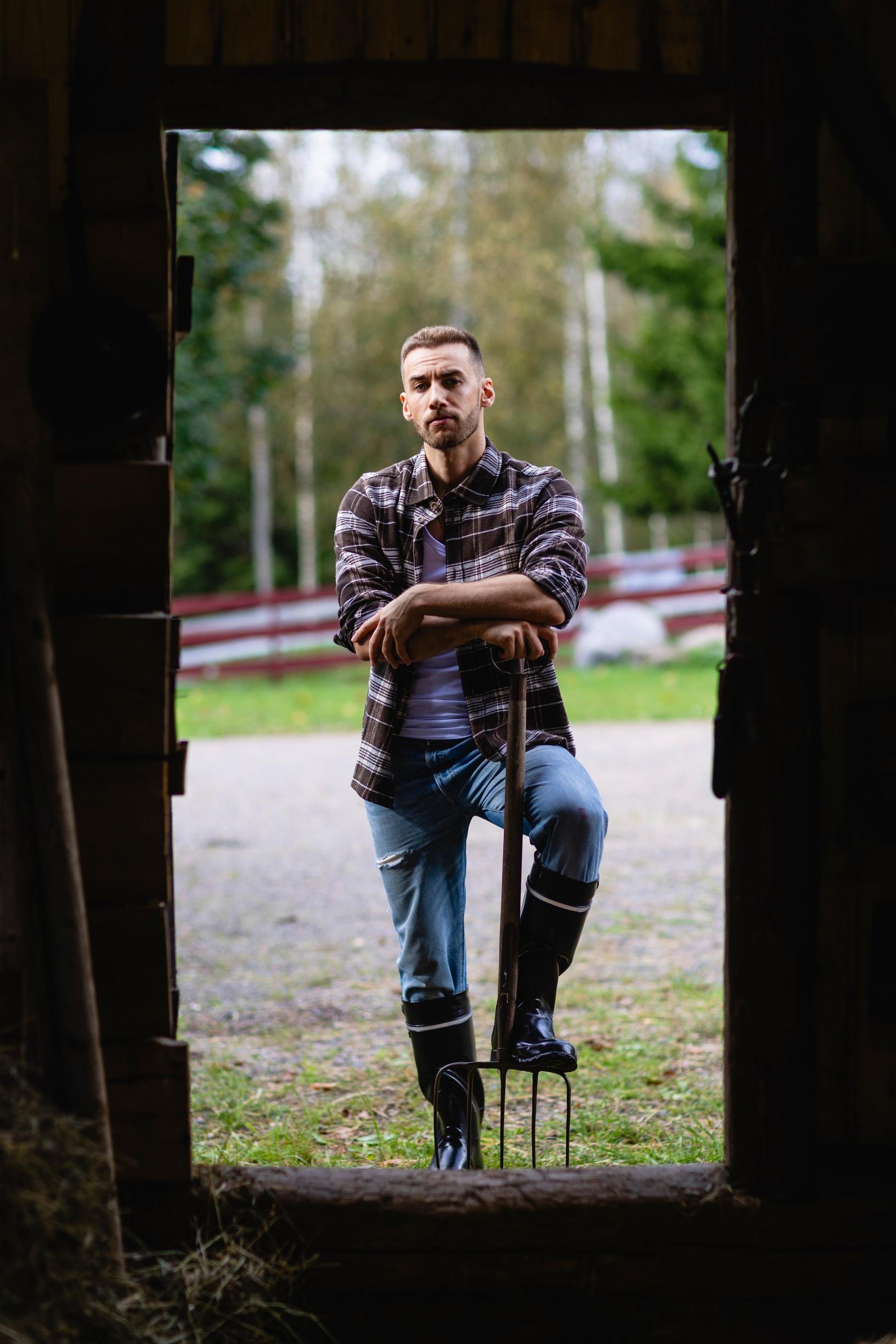Tyyli Suvi Poutiainen. Ruutupaita, Les Deux / Stockmann, hihaton paita, Jack & Jones / Stockmann, vintage-farkut, Levi’s / FTA® Vintage, kumisaappaat, Nokian jalkineet. Kaulakoru mallin oma. Kuvauspaikka Rosbackan maatila.