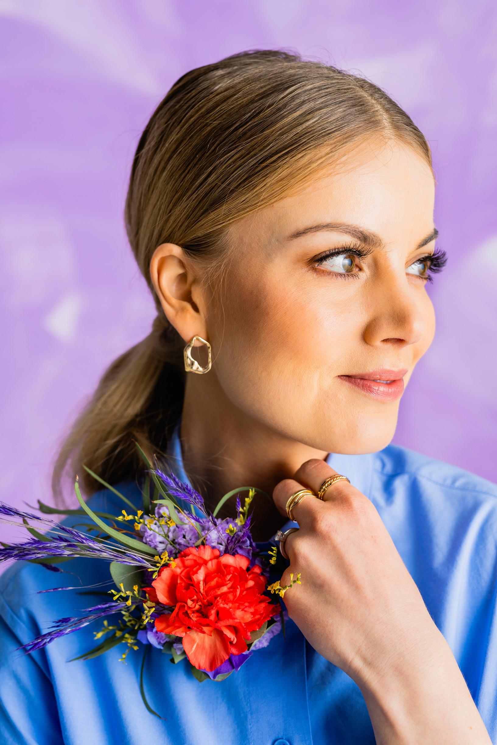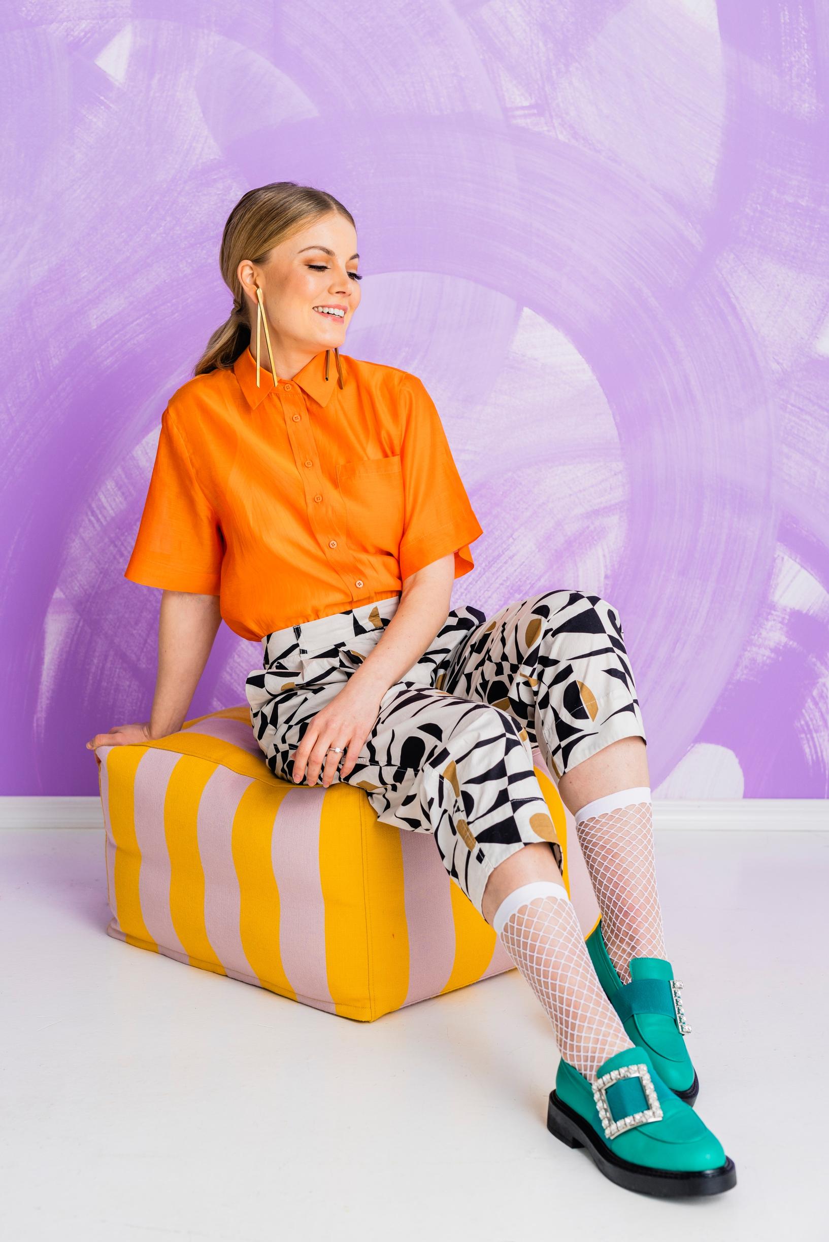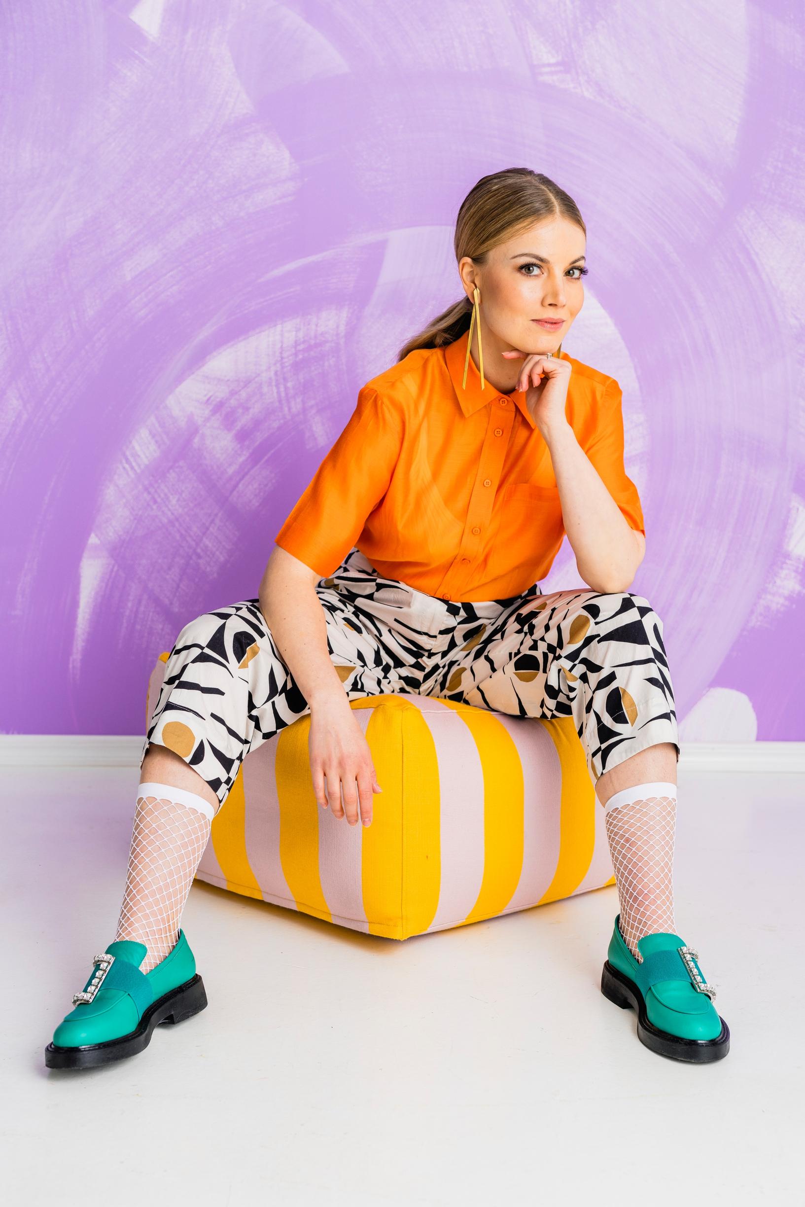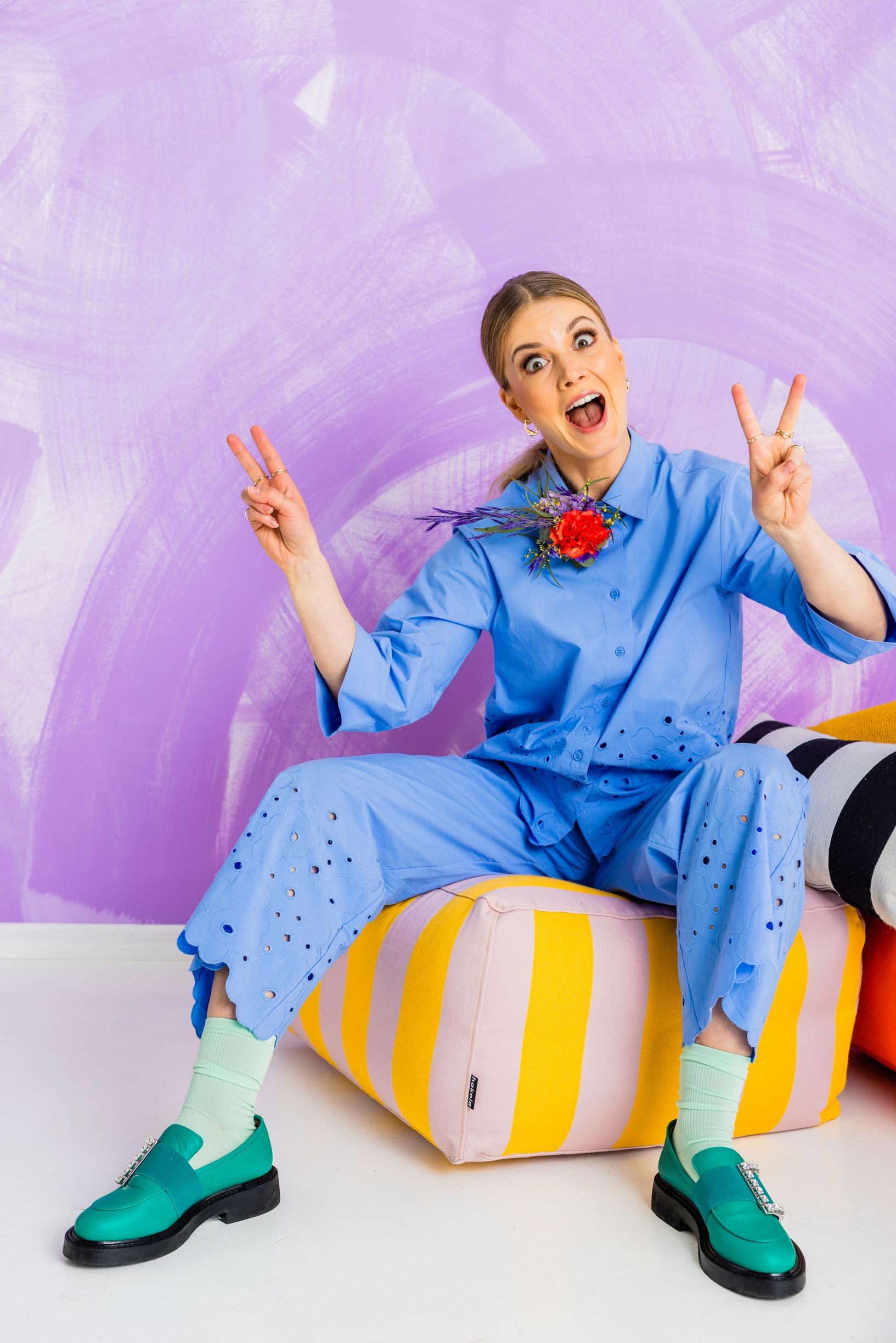 Meikki Ilkka Ruotsalainen, tyyli Matisa Nassir. Jannin asut: Sininen housuasu Marimekko, kengät Vamsko, korvakorut ja sormukset Glitter. Printtihousut Marimekko, kengät Vamsko, korvakorut Sora Design, kukat Mu Filosofia, tyynyt ja rahit Hakola. Lavastus Tuomas Nortema.