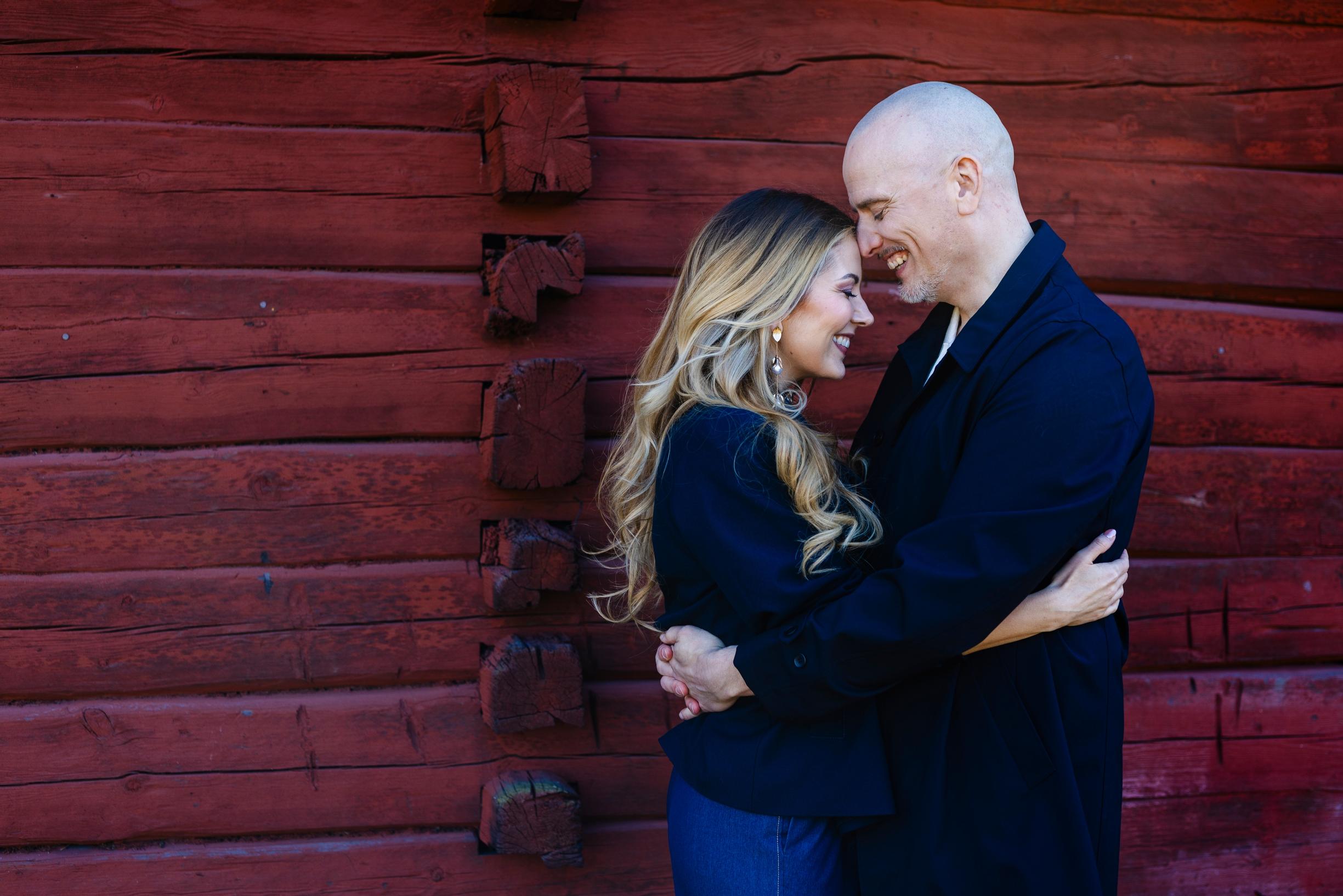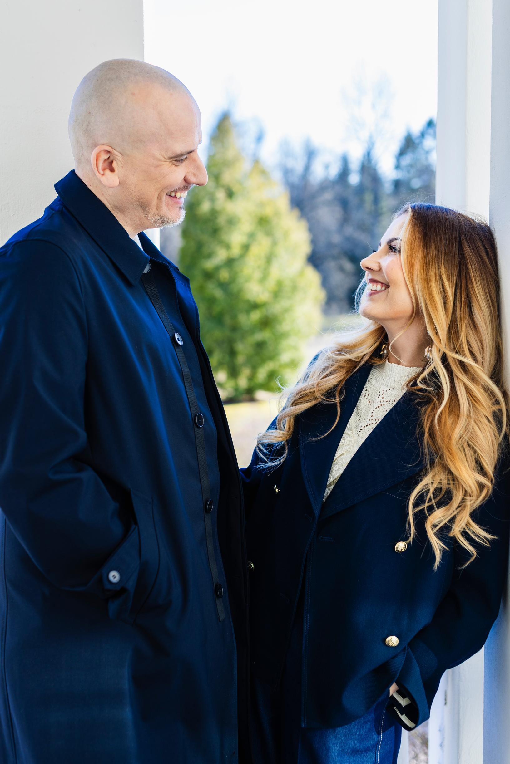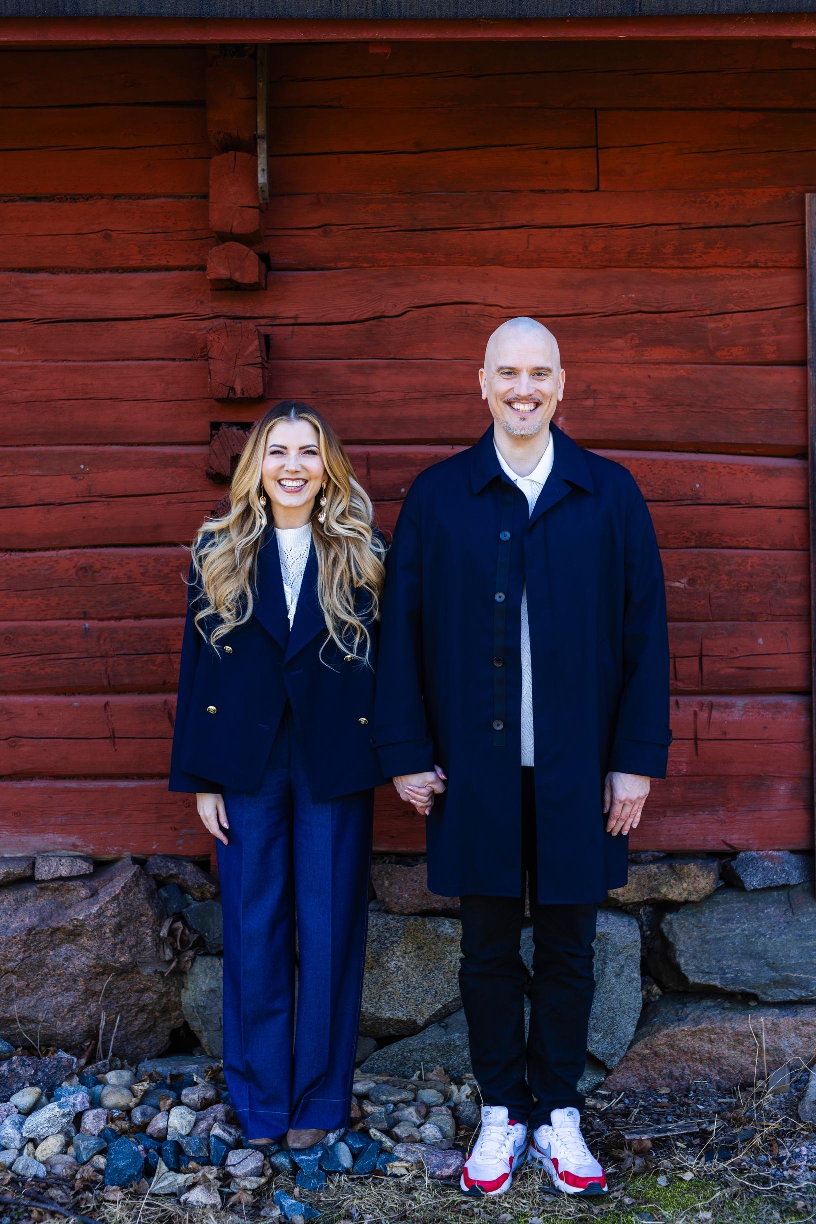 Meikki ja hiukset: Laura Rantaniemi. tyyli: Annette Tamminen. Jennin pusero Zara, takki Gant, Korvakorut Cèleste helsinki, housut omat. Tonin takki: Turo Tailor, paita Les Deux, housut omat.