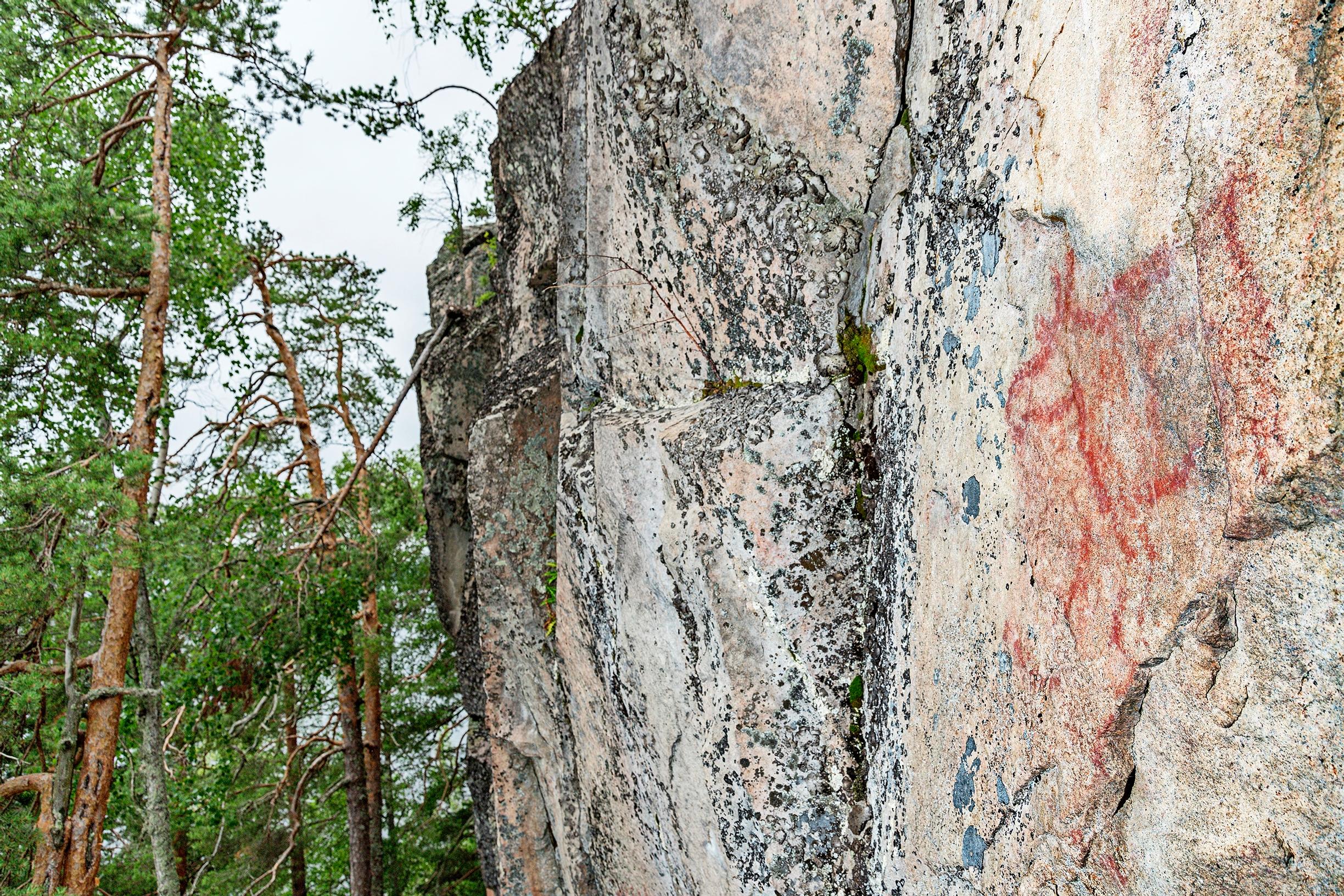 Ilmassa on odotusta. Jossain täällä ovat Saraakallion kalliomaalaukset, joiden sanotaan olevan Pohjoismaiden laajimmat. Jo rantametsä näyttää ikiaikaiselta ja koskemattomalta. Puita on maatunut umpeen kasvaneille poluille. Maalauksia etsiessä on tasapainoiltava pitkin mahtavia, kidemuotoon lohkeilleita rantakallioita.