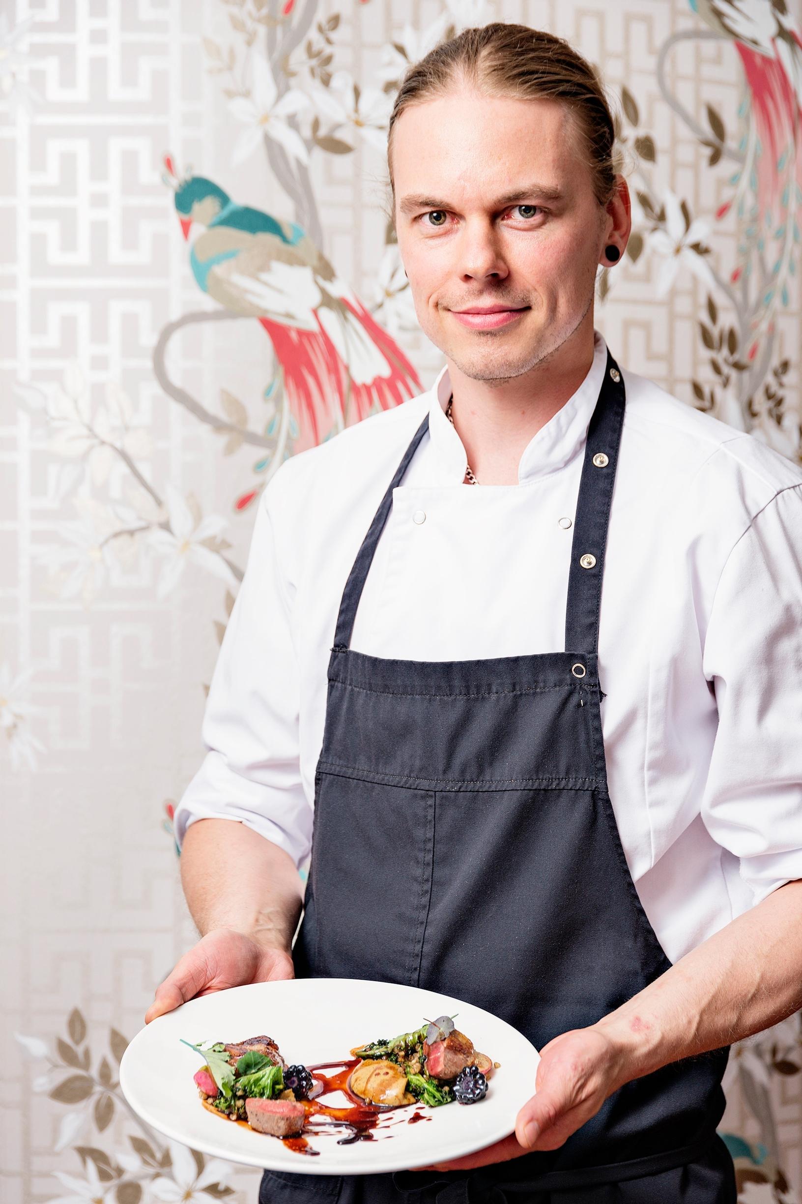 Keittiömestari Sami Sorvoja kantaa pöytään alkupalat. Pikkelöity ja aavistuksen paahdettu, lähivesistä pyydetty ahven tuo kurkkukoristeluineen mieleen koralliriuttojen fantastisen näköiset otukset, vapaakiduskotilot.