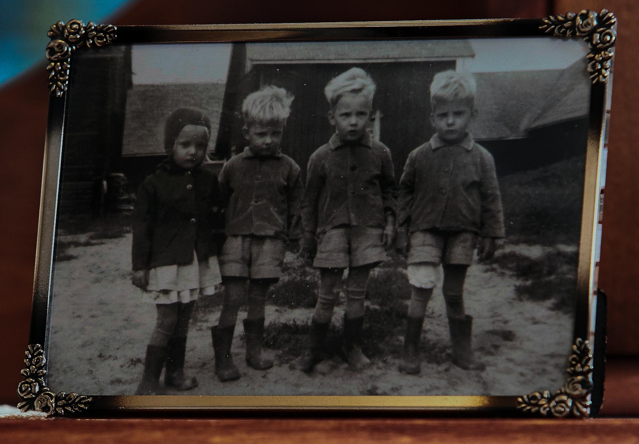 Tässä kuvassa on neljä paitaressua, vakavaa kolmevuotiasta lasta, joiden kasvoilla ei näy hymyn häivää. Vaatteet ovat juuri niin vaatimattomat kuin maaseudun lapsilla oli sodanjälkeisessä Suomessa.