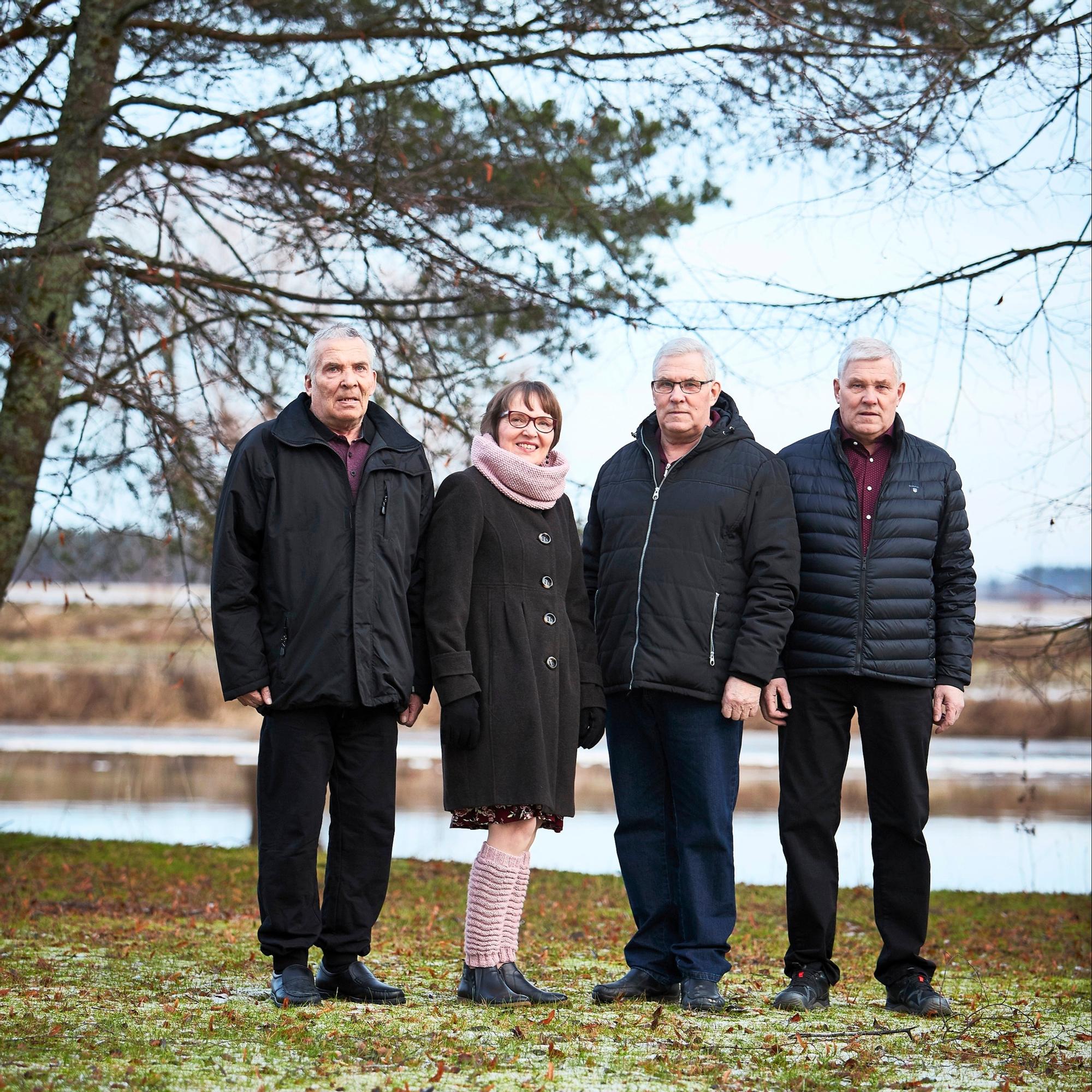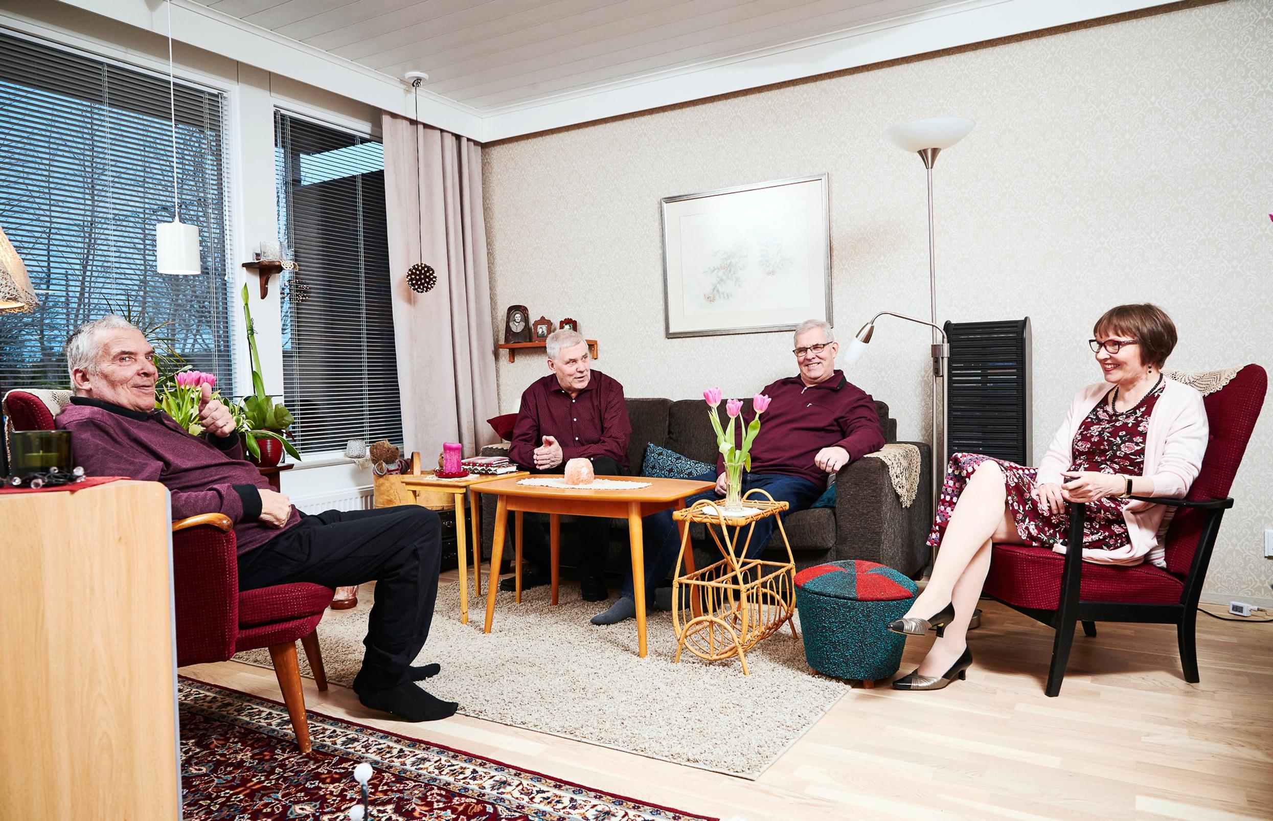 Sohvalla istuvat vierekkäin Erkki Jouppila ja Jorma Jouppila. Martti Jouppila istuu tuolissa, Helena Jouppila toisessa tuolissa. He ovat maankuulut Jouppilan neloset.