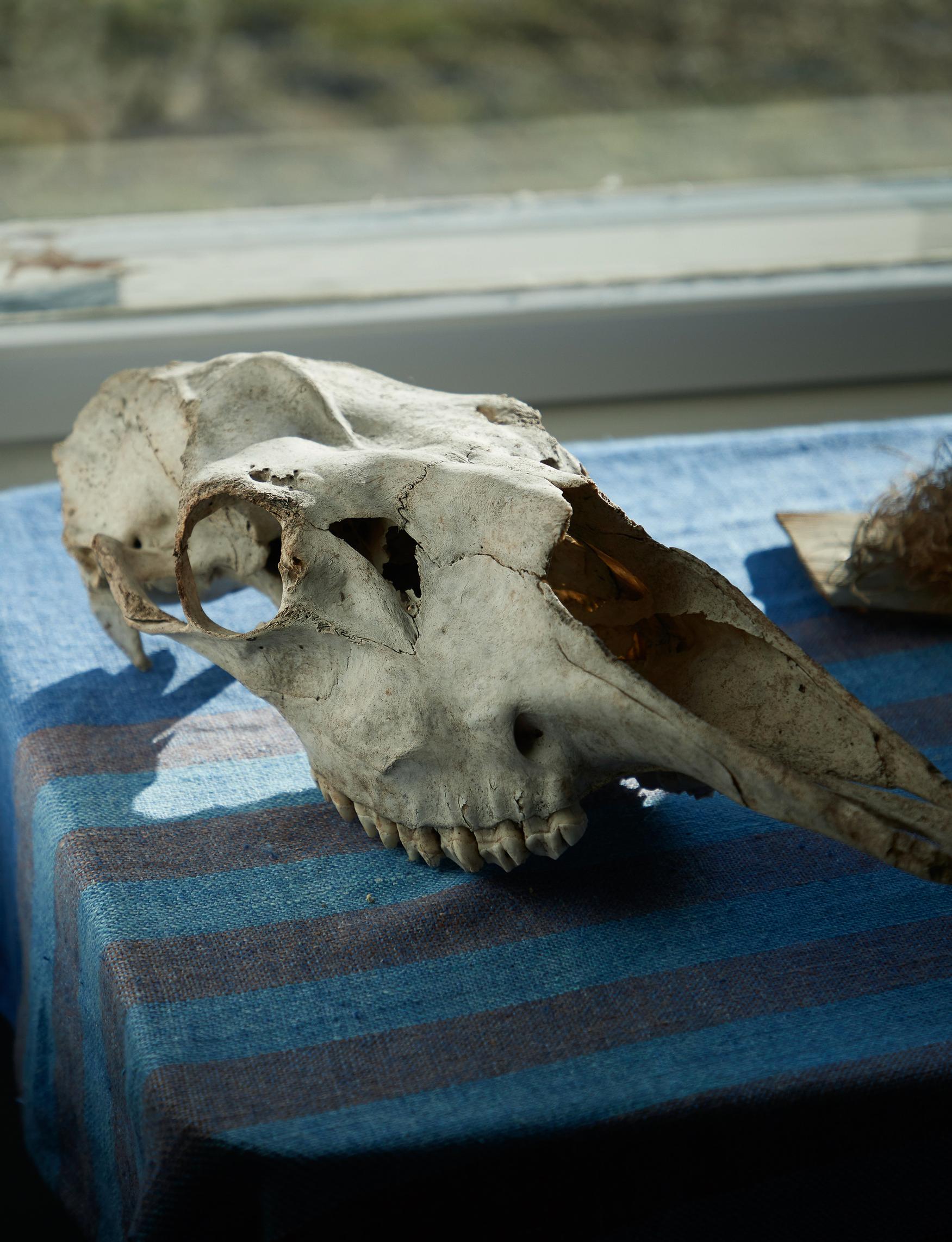 Olohuoneen tasoilta löytyy kaksi hirven pääkalloa ja metsäkauriin alaleukaluu. Vanhalla puupöydällä lepää hätkähdyttävän kokoinen jyrsijän kallo. Se kuului majavalle, jonka Vesa pyydysti taljajousella kolme vuotta sitten.