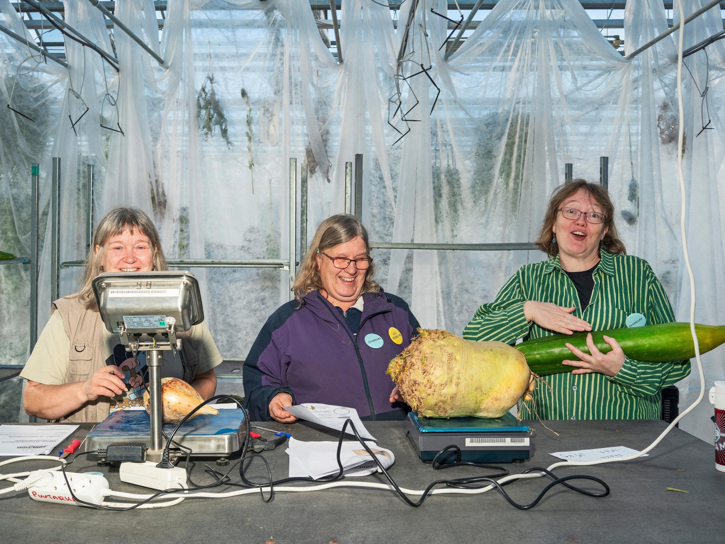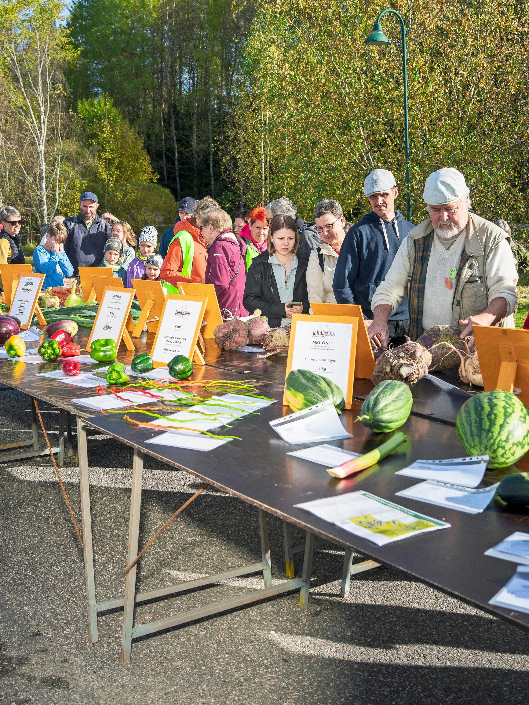Täällä koolla on väliä: pöydät notkuvat suurikokoisista kurkuista, porkkanoista, kaaleista, lantuista, sipuleista ja muista vihanneksista. Hevi-osaston raskain sarja on näytteillä parkkipaikalla: jättikurpitsoja ei pöydille nosteta, sillä ne painavat satoja kiloja, joten punnitsemiseen tarvitaan kuormaaja.