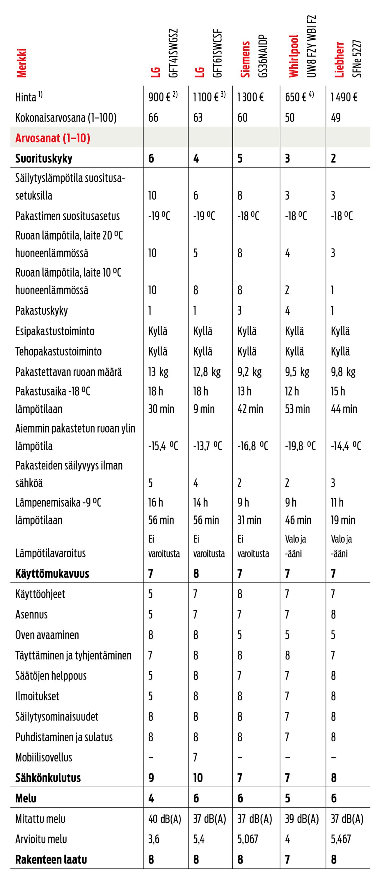 Jutun lopusta löytyvässä taulukossa on vapaasti seisovien, alle 190 senttimetriä korkeiden pakastinten kärkiviisikko. Niistä kaksi sai suorituskyvystä tyydyttävän ja kaksi peräti huonon arvosanan.