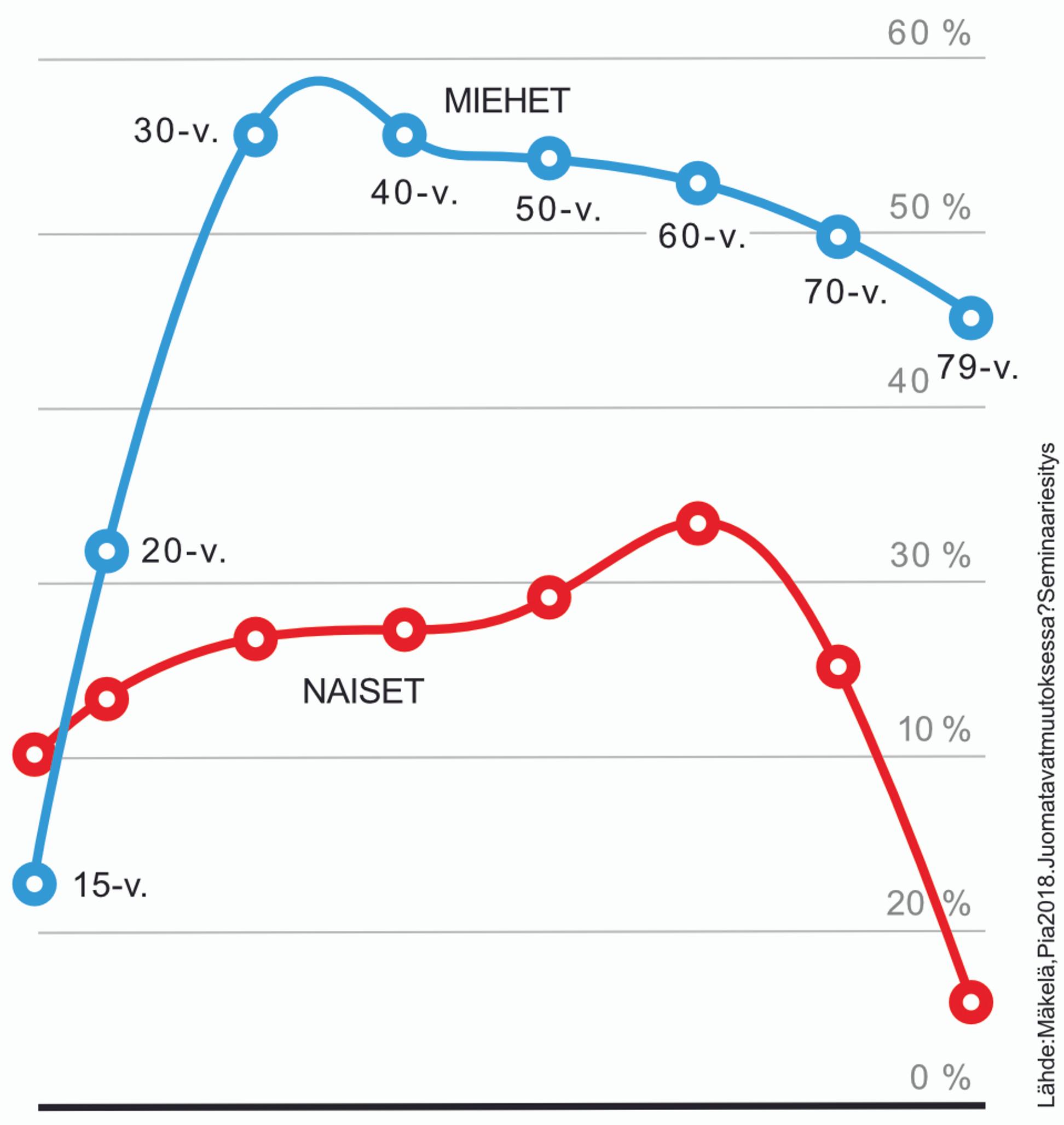 Etenkin eläkeikäiset naiset juovat nykyään paljon enemmän kuin saman ikäiset naiset joivat muutama vuosikymmen sitten. Nuorten alkoholinkäyttö taas on ollut laskussa tällä vuosituhannella.