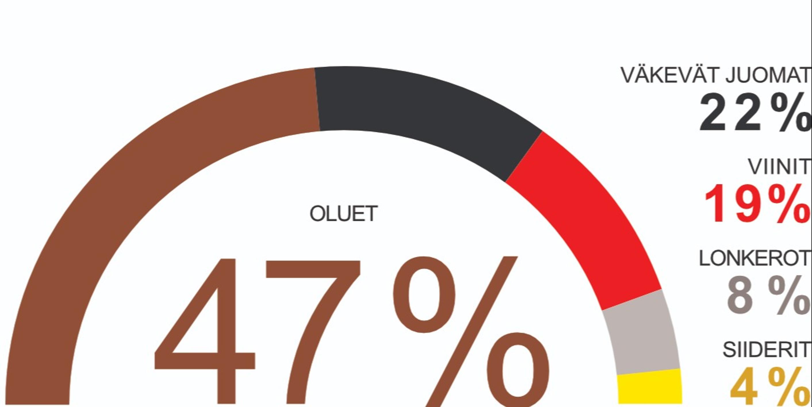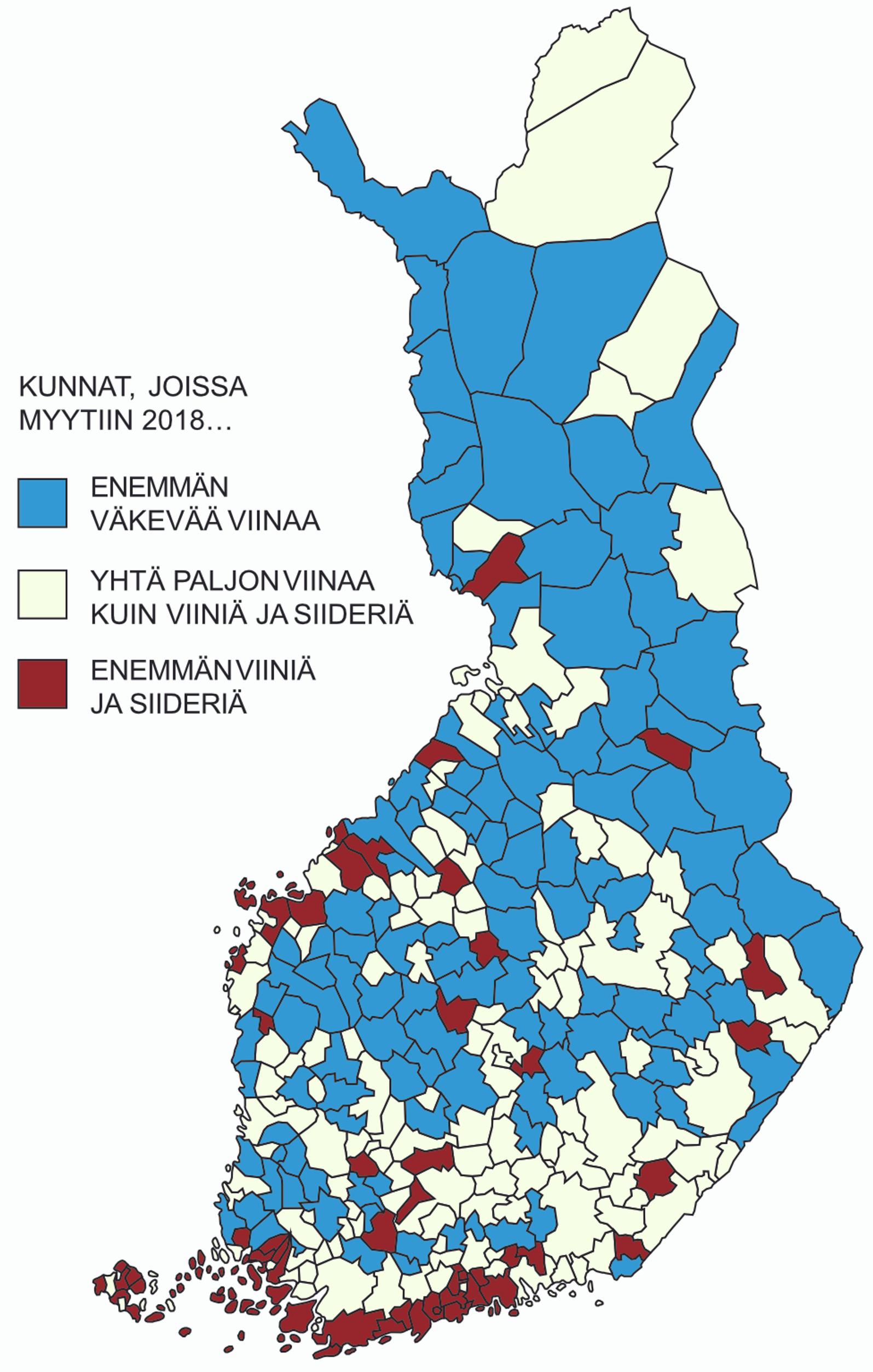 Olut on ykkösjuoma joka puolella maata. Viiniä juodaan eniten Uudellamaalla, jossa myytiin toissa vuonna liki