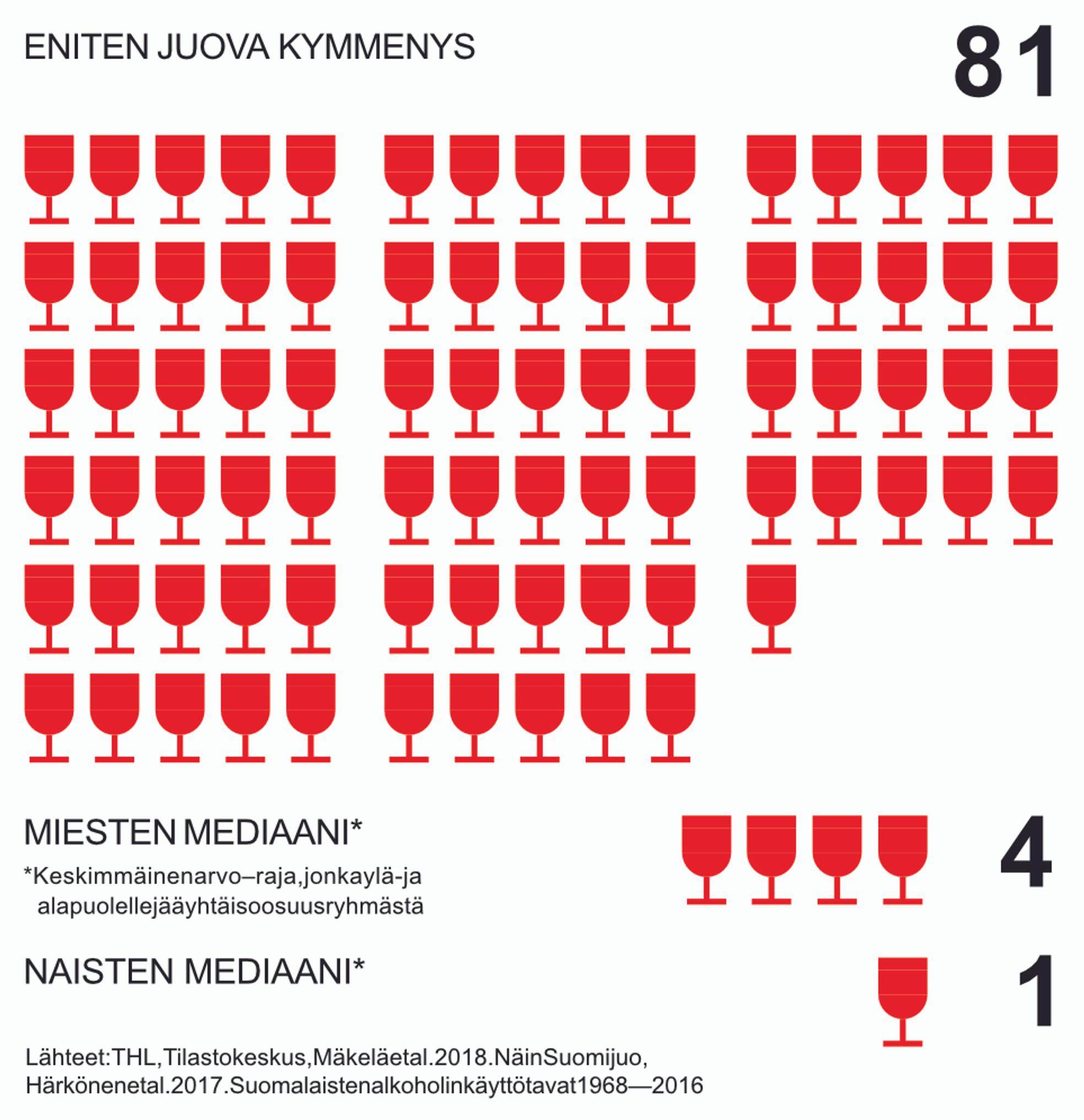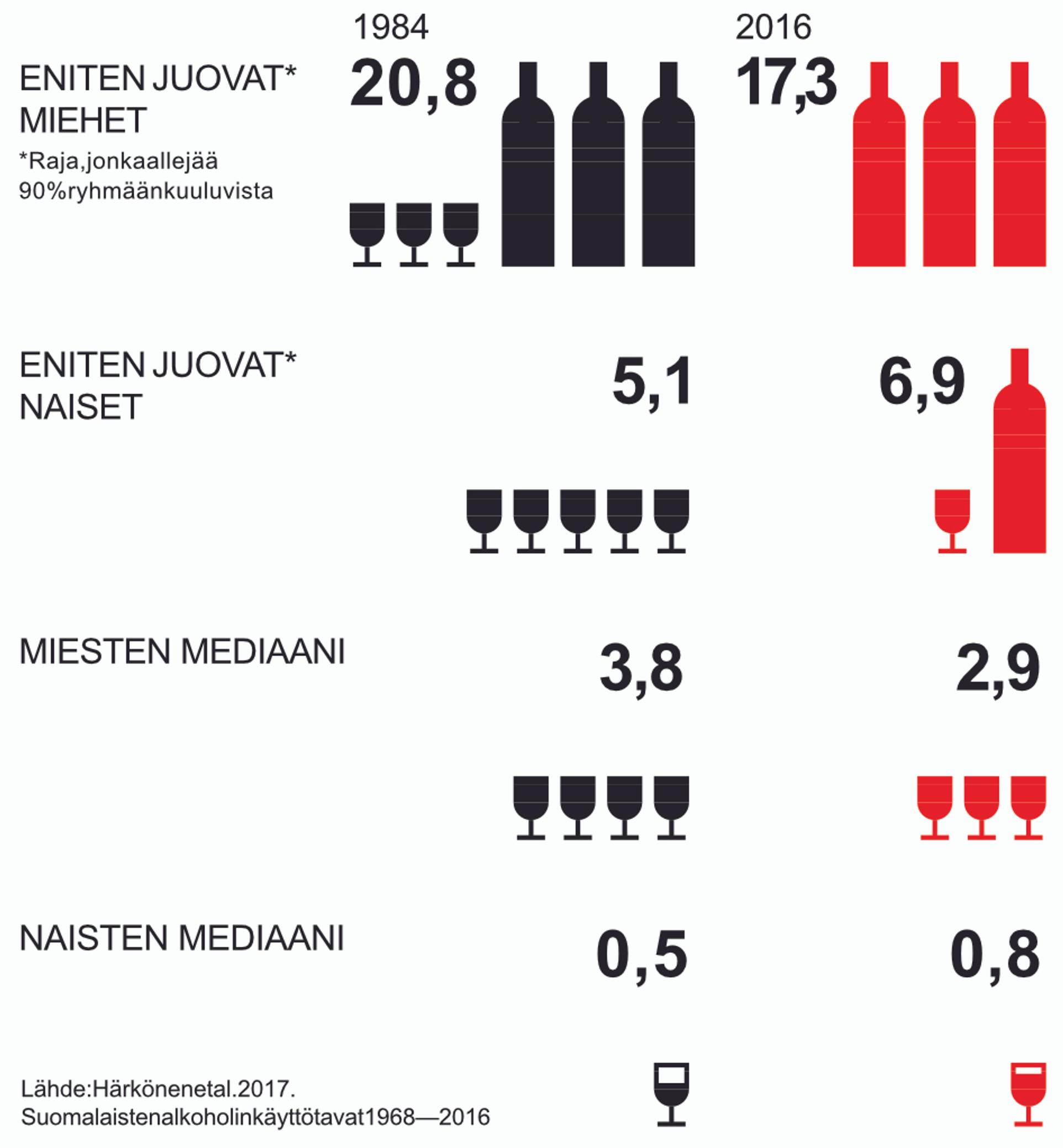 Juomisesta on samaan aikaan tullut tasa-arvoisempaa. 1960-luvulla miehet joivat kuusi kertaa enemmän kuin naiset. Nykyäänkin miehet juovat naisia enemmän, mutta vain kolminkertaisesti.