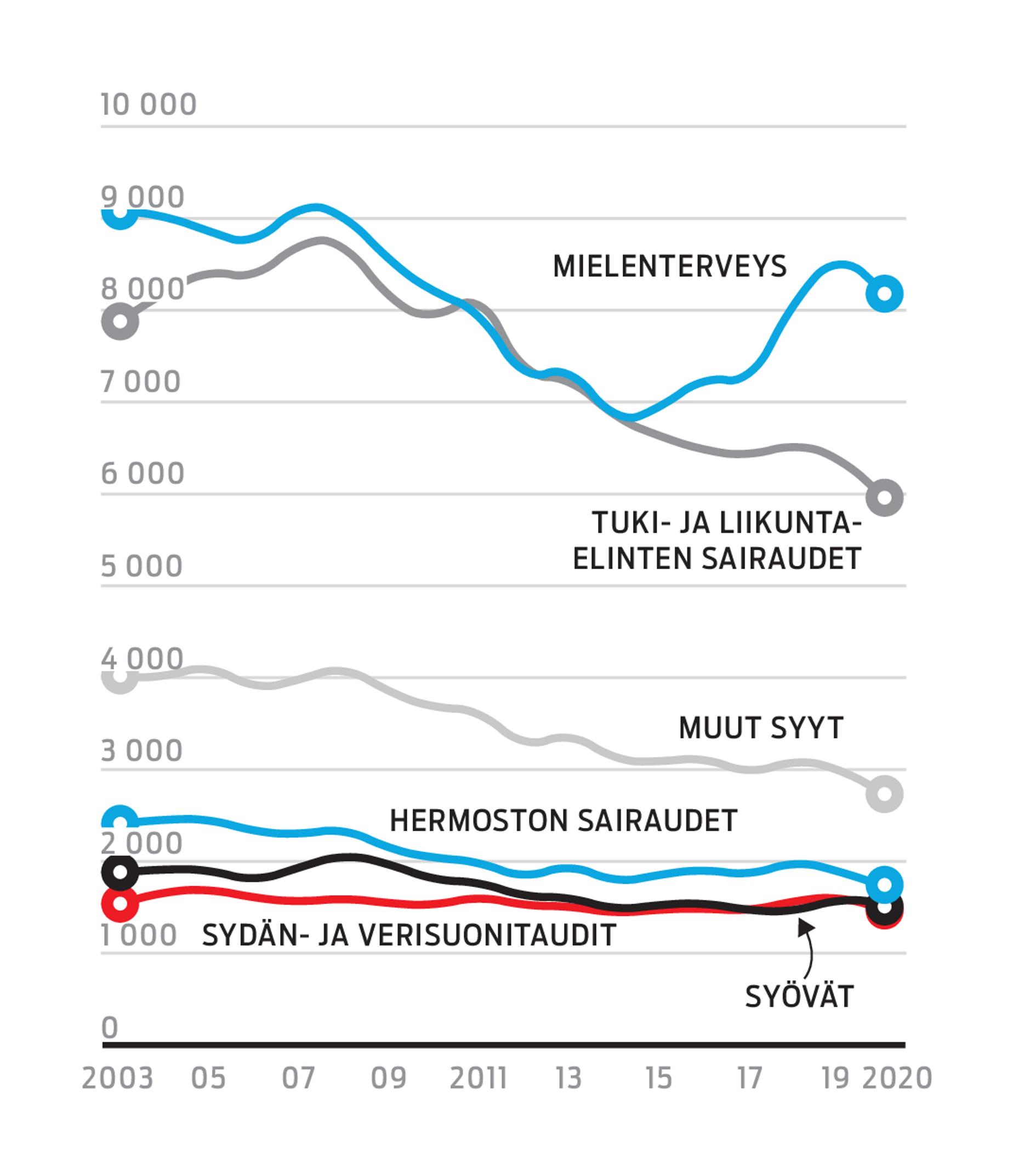 Sitä en osaa sanoa, mutta näiden sairauksien yleisyyksissä on tapahtunut isoja muutoksia. Sydän- ja verisuonitaudit, syövät, diabetes ja keuhkosairaudet ovat työikäisten kuolemissa neljä keskeisintä sairautta.