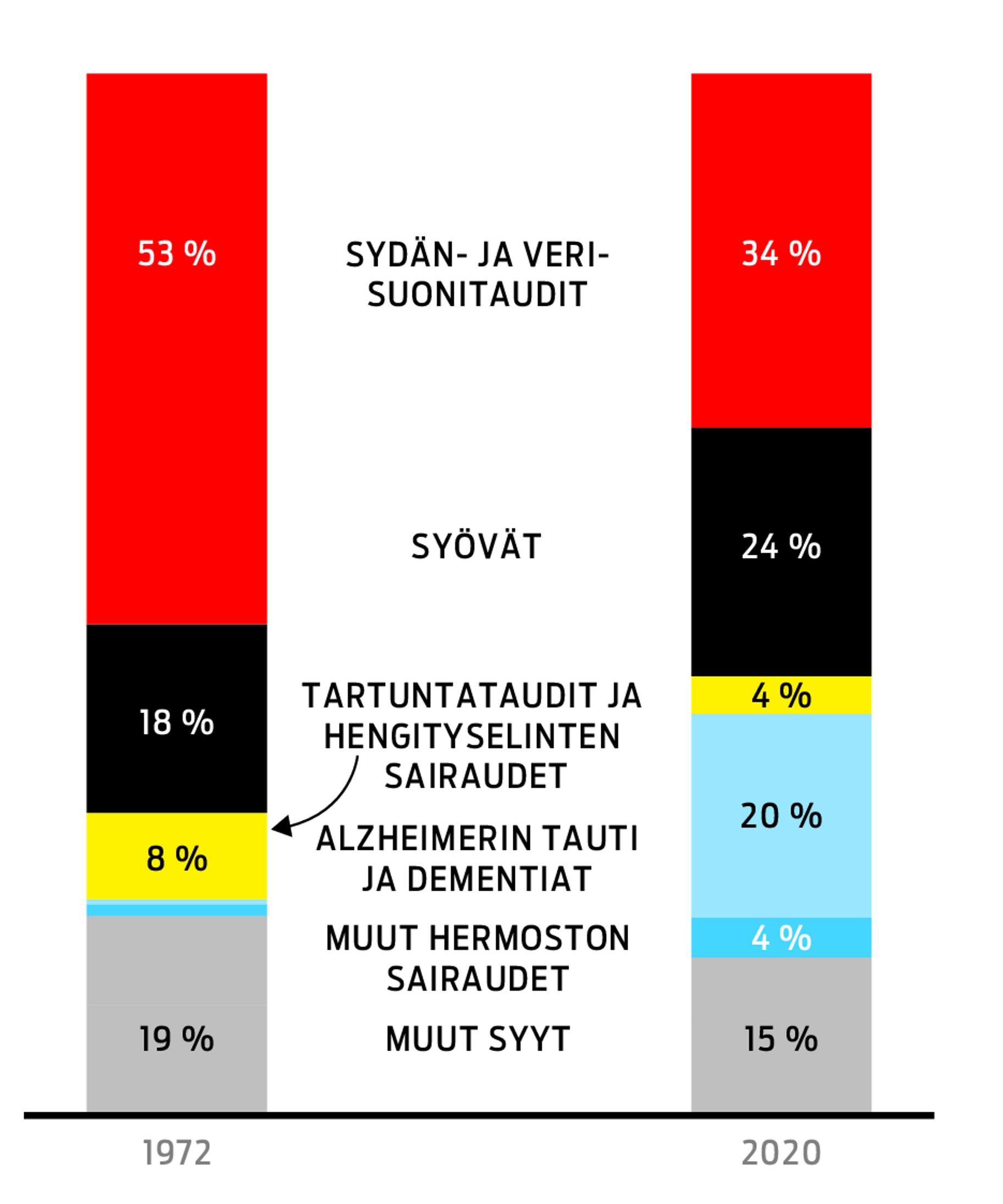Näistä esimerkiksi työikäisen väestön sydän- ja verisuonikuolleisuus on vähentynyt kansanterveysohjelmien myötä yli 80 prosenttia viimeisen 50 vuoden aikana. Se on ihan hirveän suuri muutos. Ne ovat edelleen yleisin kuolinsyy, mutta nyt niihin sairastutaan keskimäärin 20 vuotta vanhempina kuin esimerkiksi 1970-luvulla.