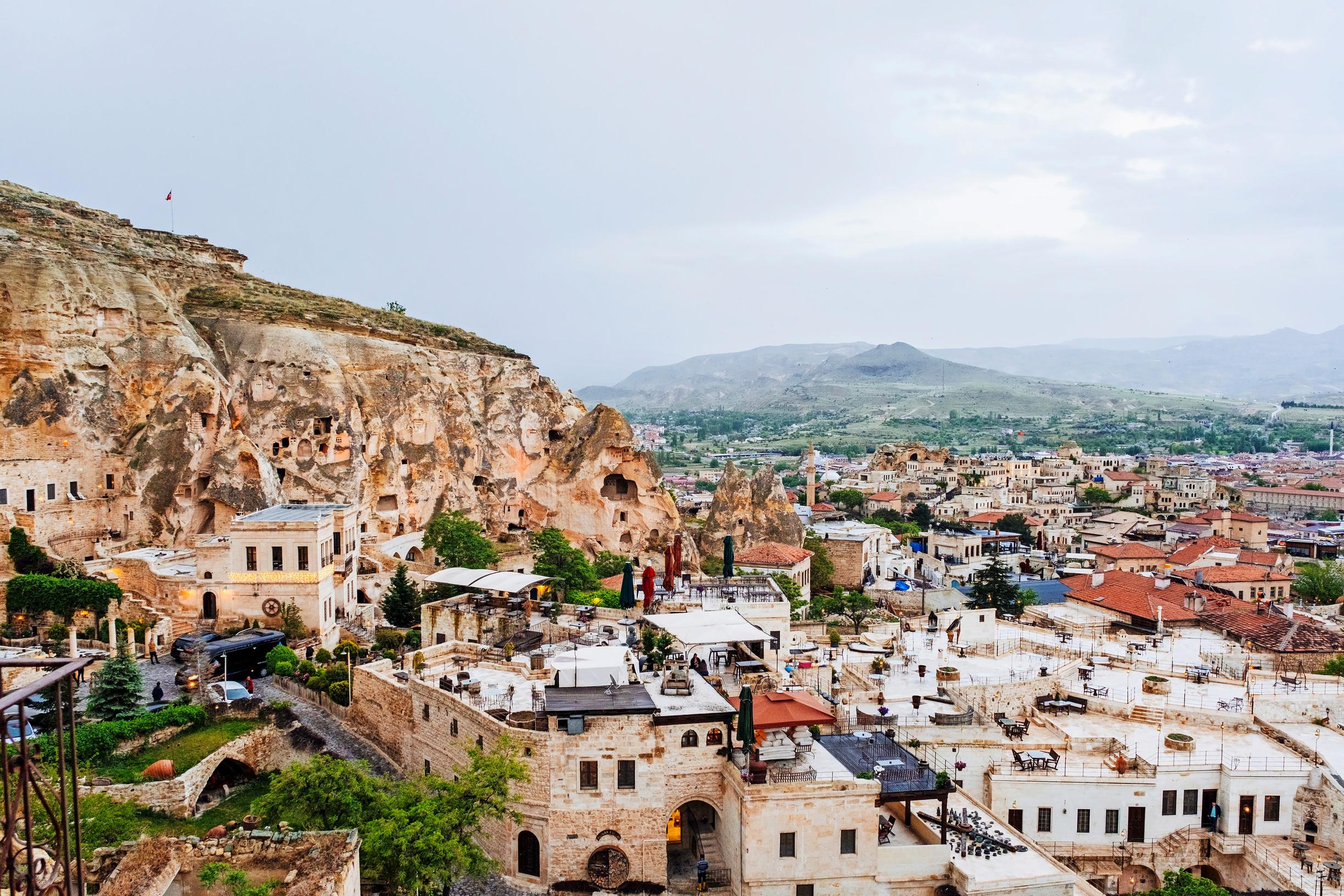 Ylitämme Göremen kaupungin. Sen asuintalojen lomasta kohoaa lisää kummallisia kallioita, joiden kylkiin on hakattu pieniä ikkunoita.
